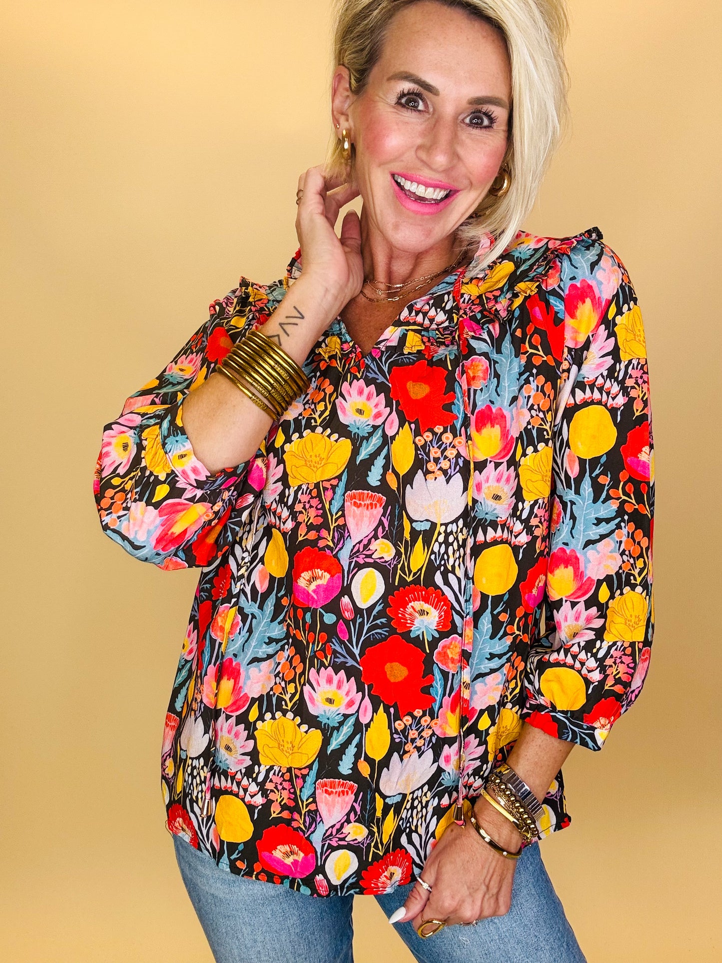 Bring the beauty of autumn gardens into your wardrobe with the Beauty in Bloom Top. This eye-catching top features a bold mix of golden yellows, fiery reds, and deep blues set against a dramatic dark background, echoing the rich tones of fall foliage. The lightweight flowy fabric, gathered neckline, and relaxed fit make it as comfortable as it is stunning. Perfect for layering under a cardigan or dressing up with denim, this blouse is a statement piece for pumpkin patch outings, fall festivals, and cozy nights out.