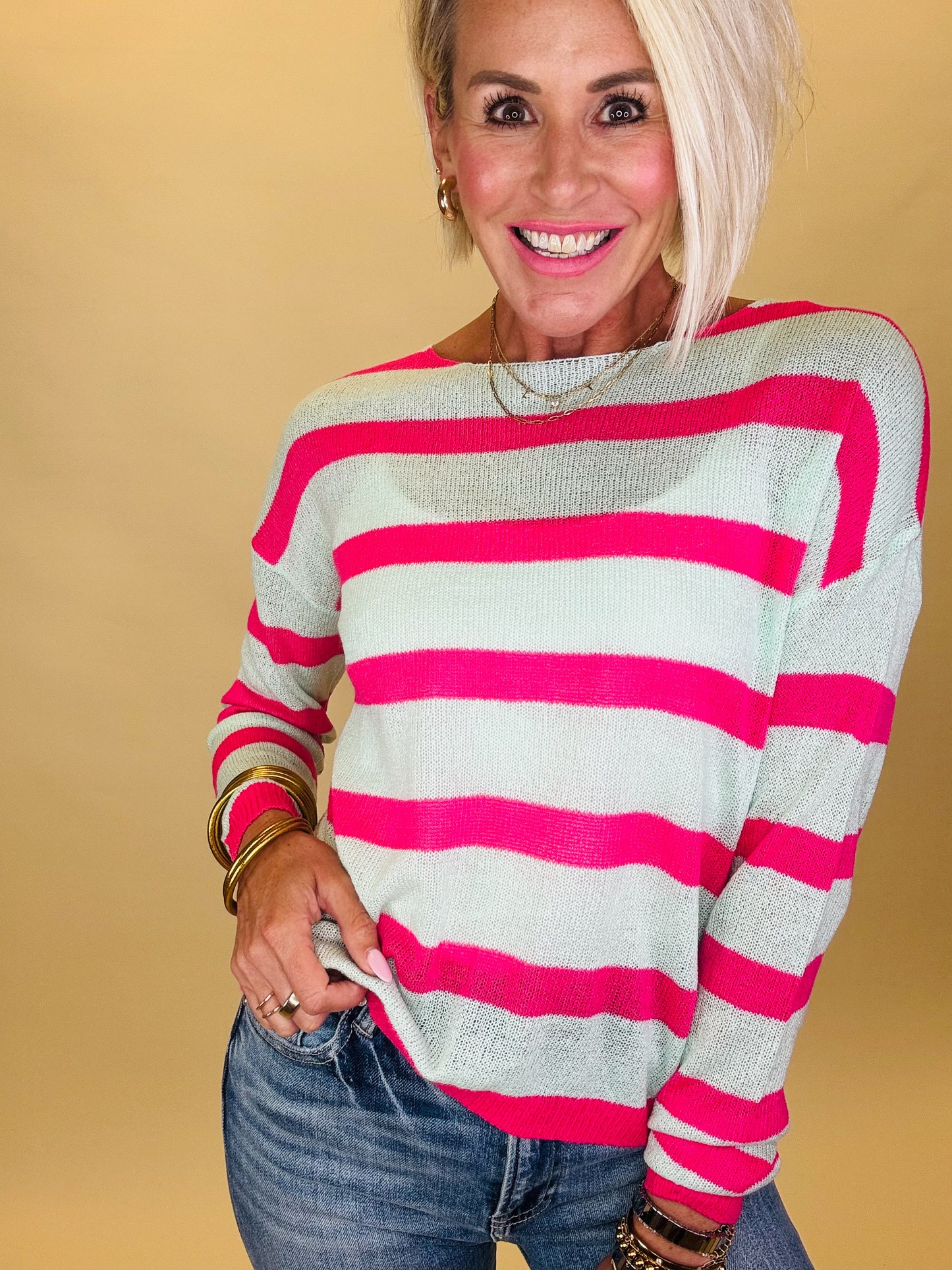 The Berry Breeze top brings a fresh twist to fall with its playful pink and mint stripes. Lightweight yet cozy, it’s perfect for layering on crisp autumn days or adding a pop of color to your pumpkin patch look. Sweet, comfy, and full of seasonal charm.