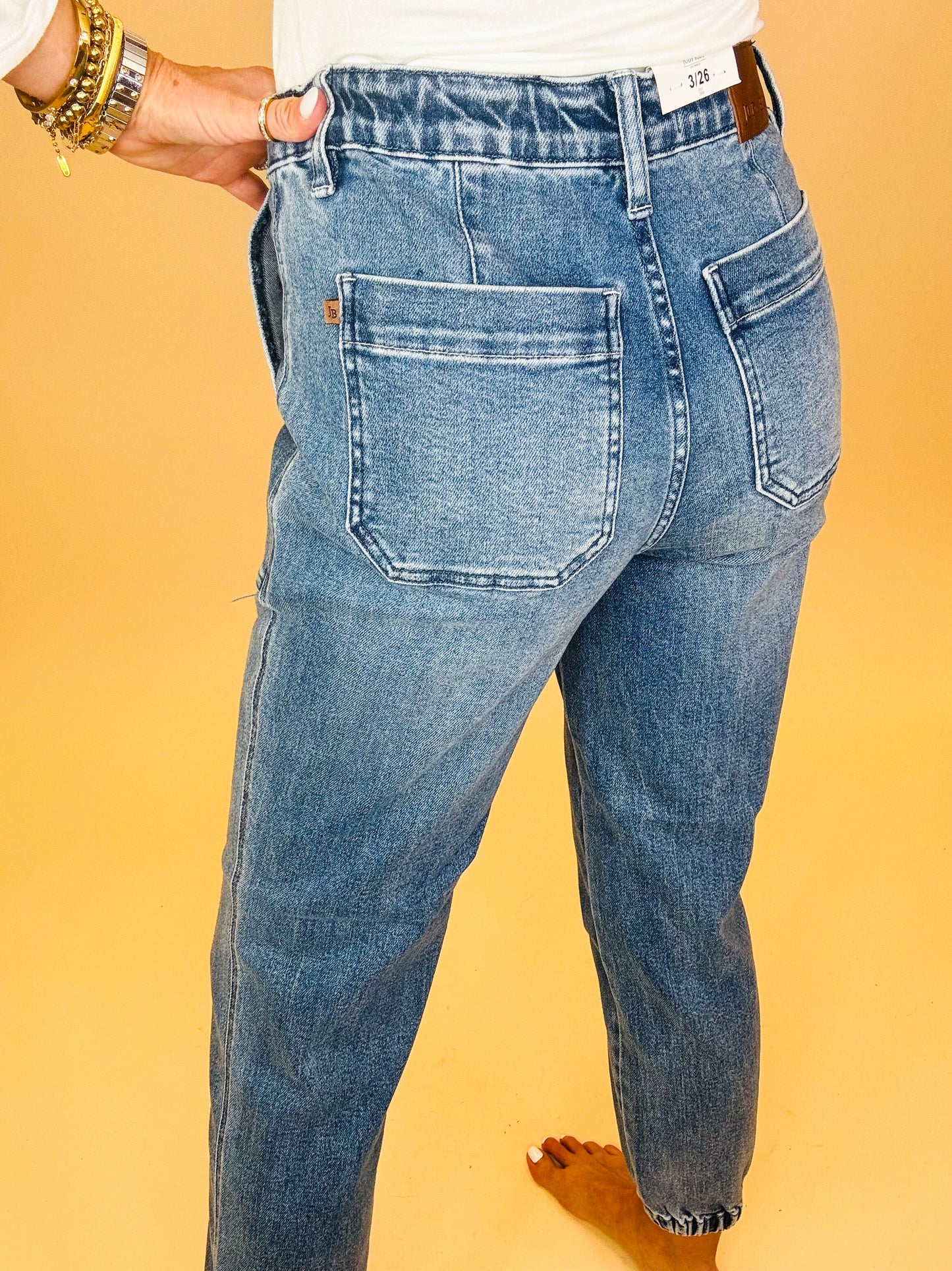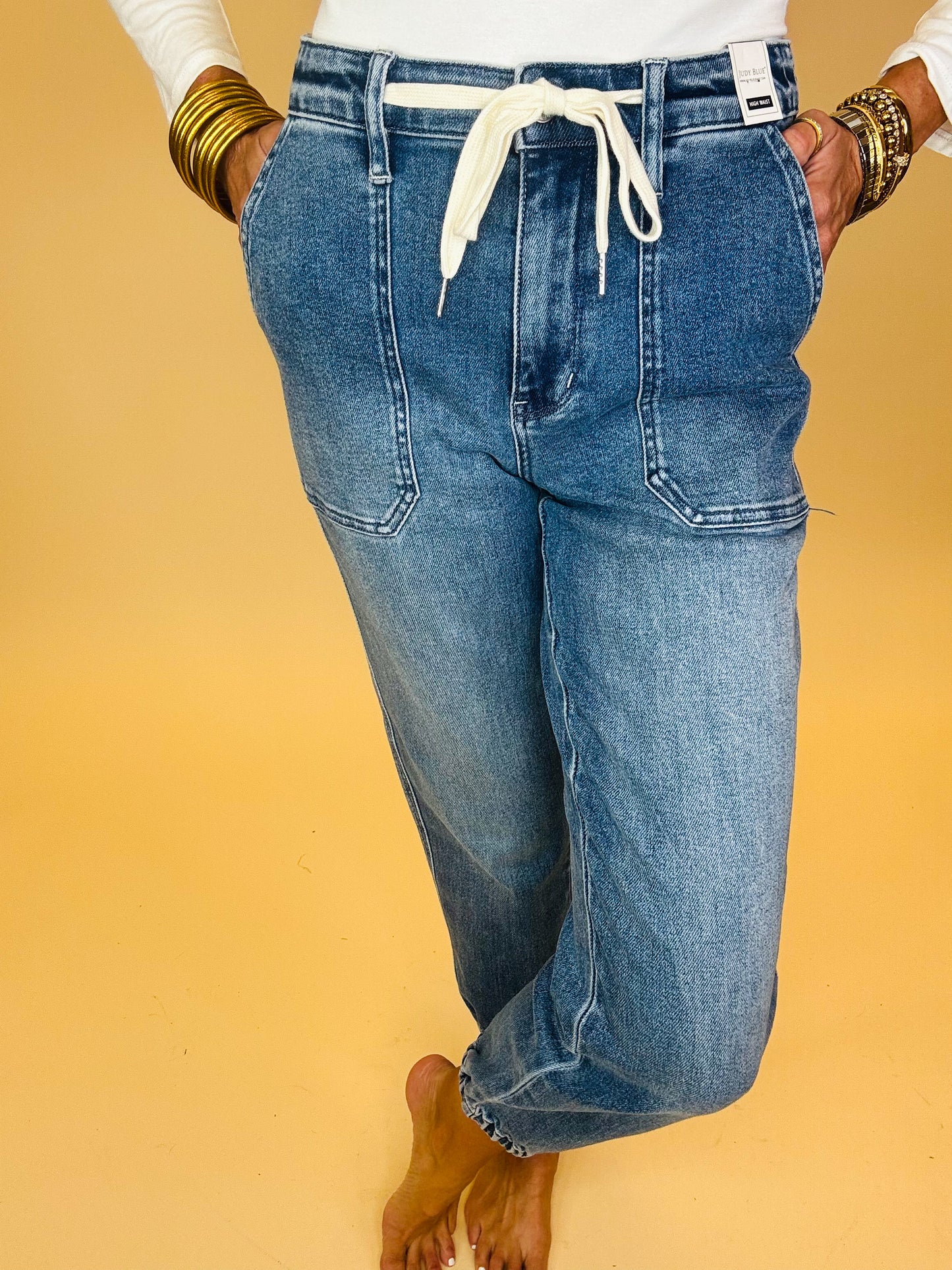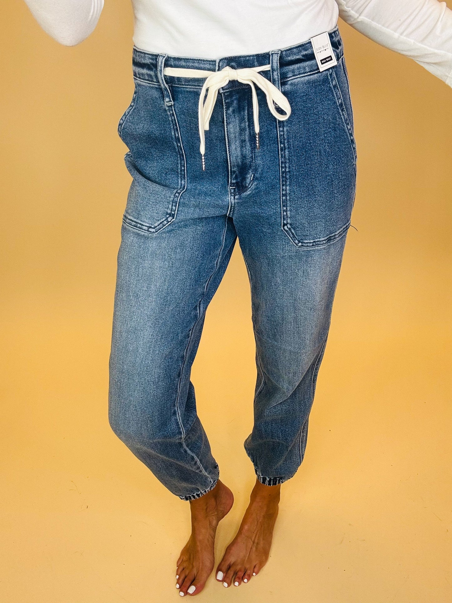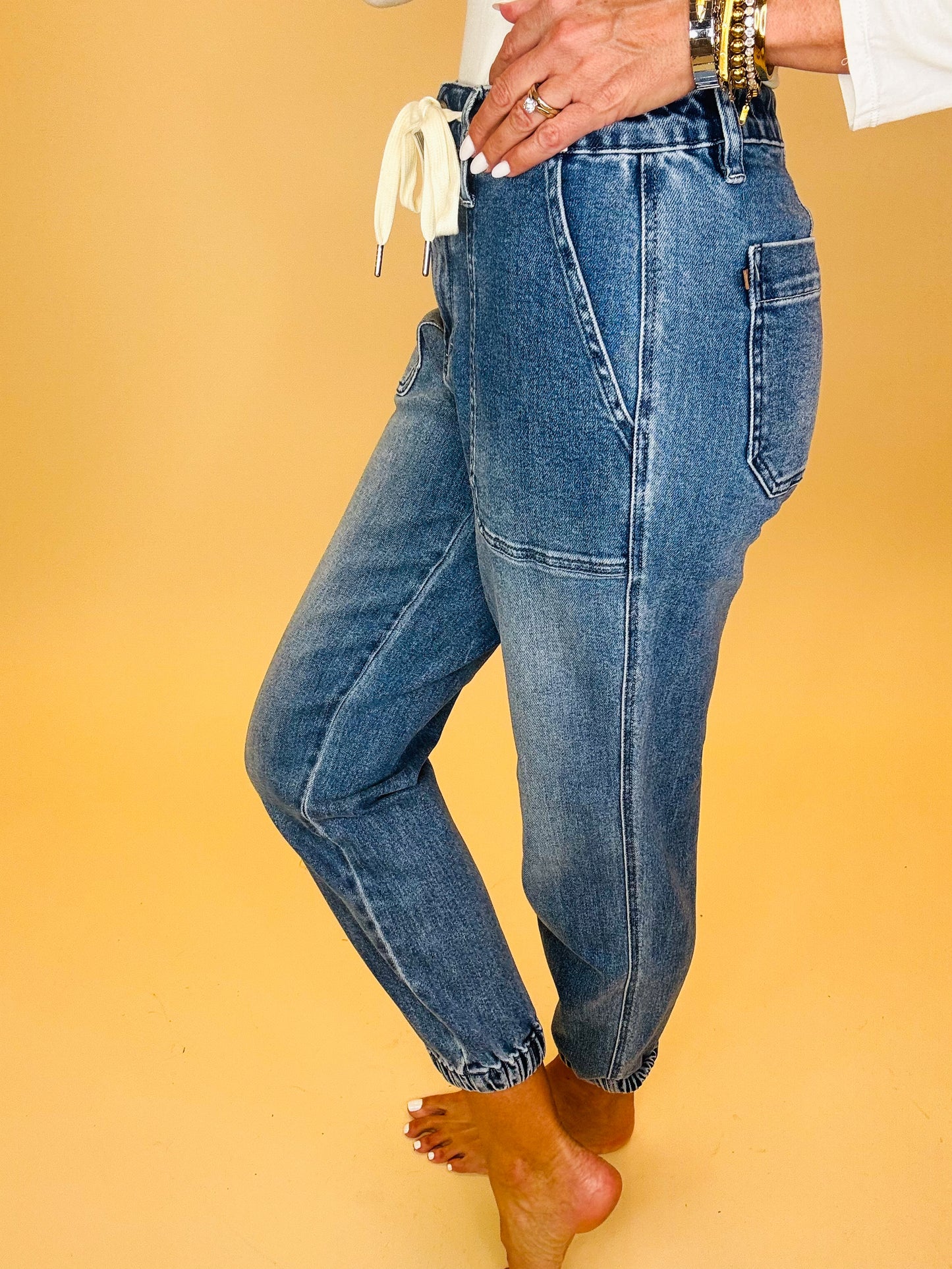 These jogger-style jeans blend laid-back comfort with everyday style. Made from soft, medium-wash denim, they feature an elastic waistband with a cream drawstring tie for a relaxed, adjustable fit. Large front patch pockets and back pockets add utility-inspired detail, while the elasticized ankles give them a sporty, tapered silhouette. Perfect for casual days when you want comfort without sacrificing style, these jeans pair easily with sneakers, sandals, or even a cozy pullover.