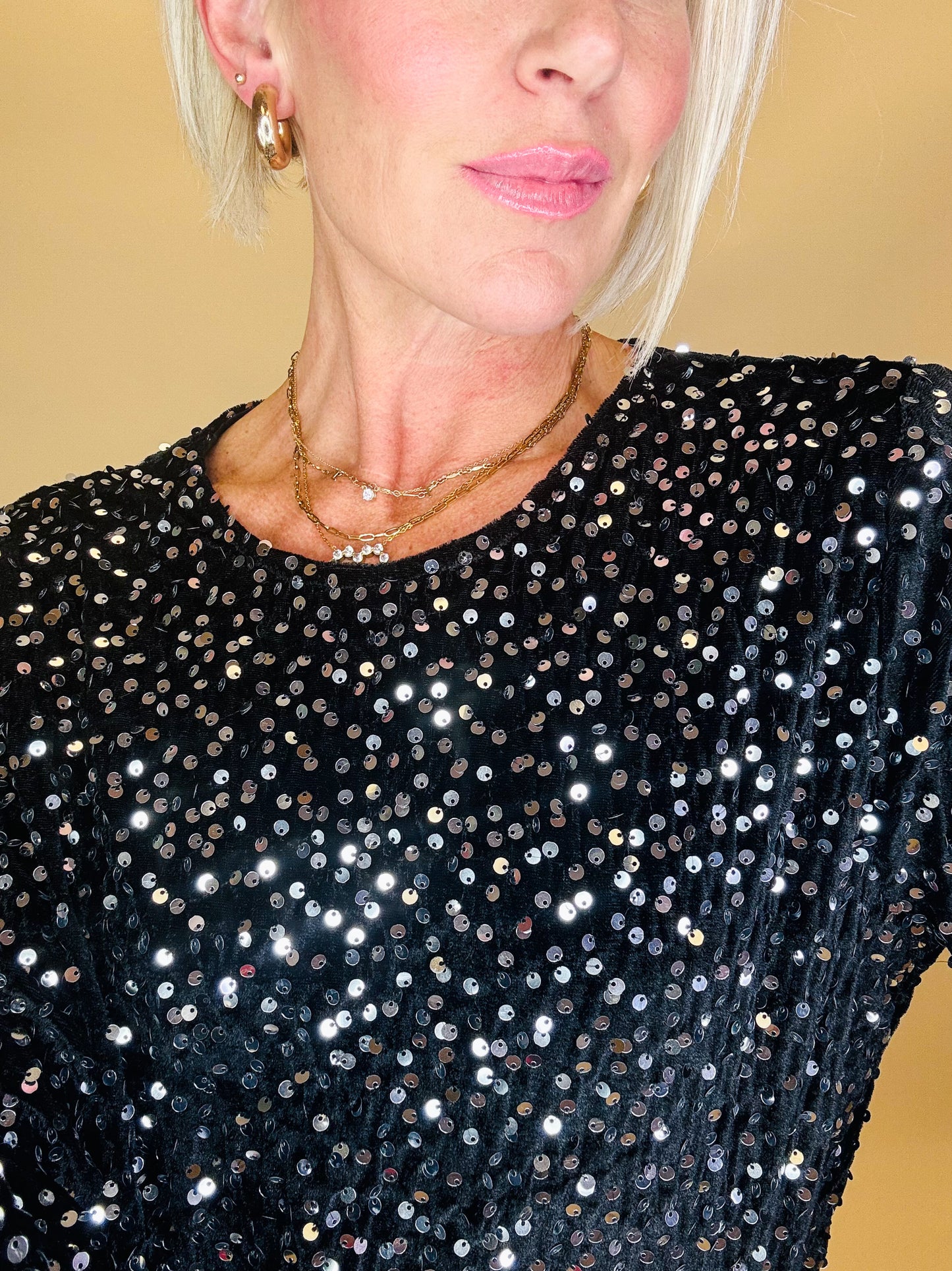 Make every entrance unforgettable in this dazzling black sequin dress, covered in shimmering silver accents that catch the light from every angle. The classic round neckline and subtly puffed sleeves add a touch of elegance, while the stretchy, comfortable fit keeps you feeling confident all night long.