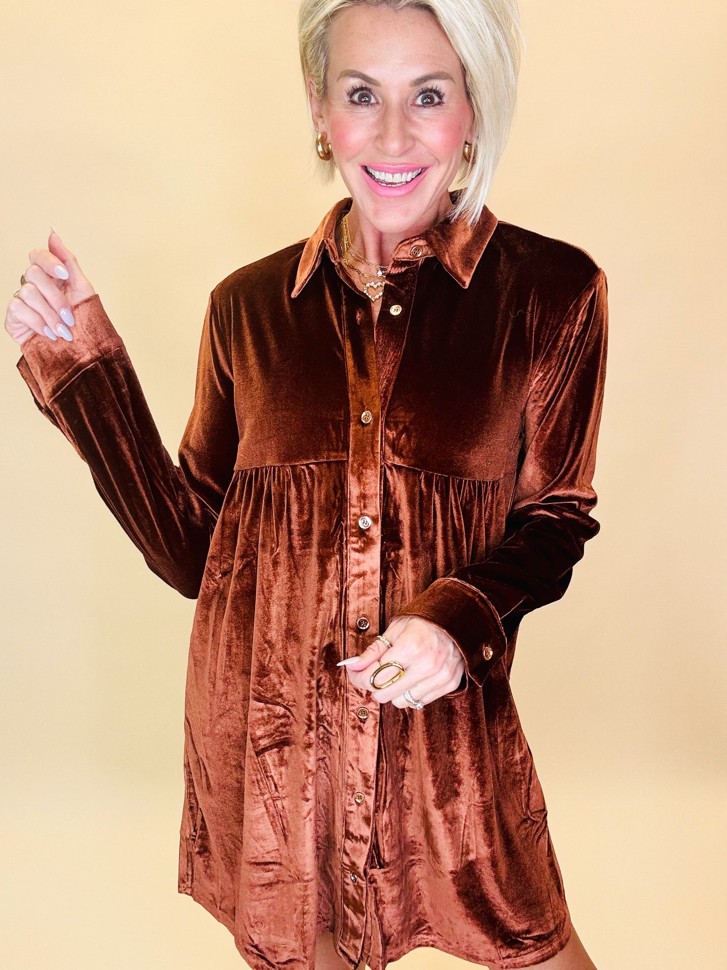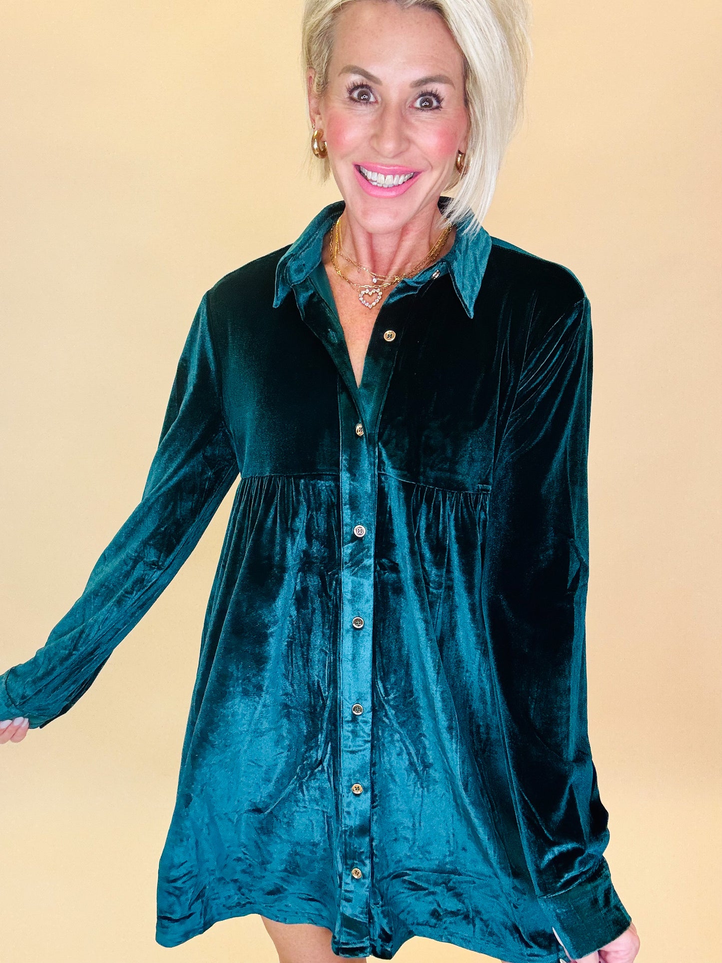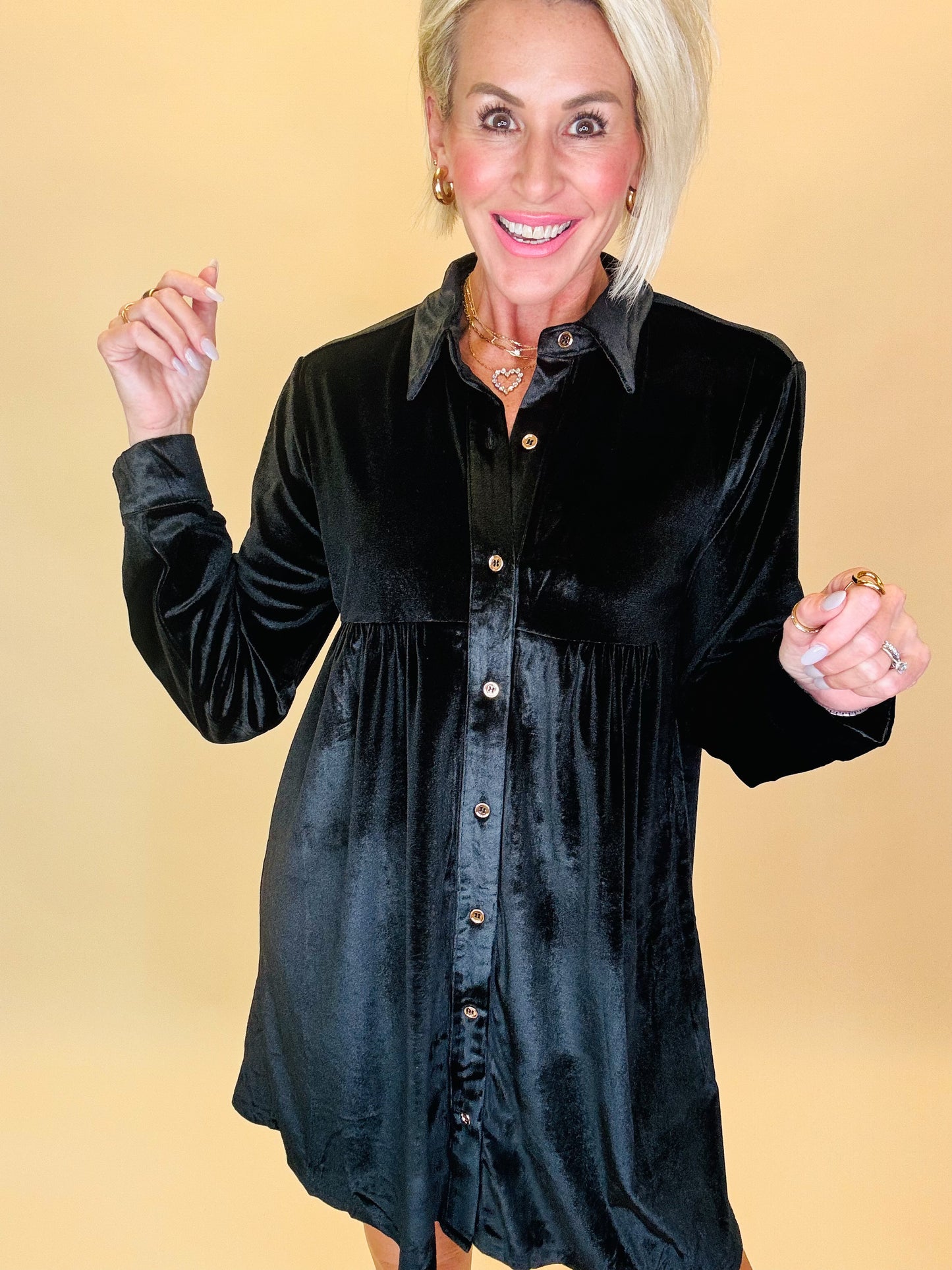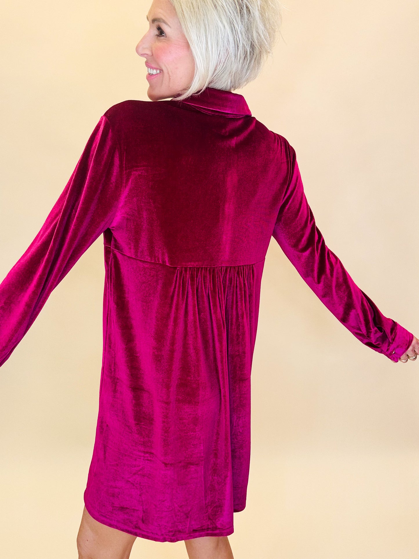 Slip into luxe comfort with this rich velvet button-down dress—soft, shimmery, and stunning from every angle. Designed with a relaxed, flowy silhouette and subtle gathered detailing, it moves beautifully and flatters effortlessly. The silky velvet catches the light with every step, giving you that glam-but-easy vibe perfect for holiday events, date nights, or elevated everyday style.