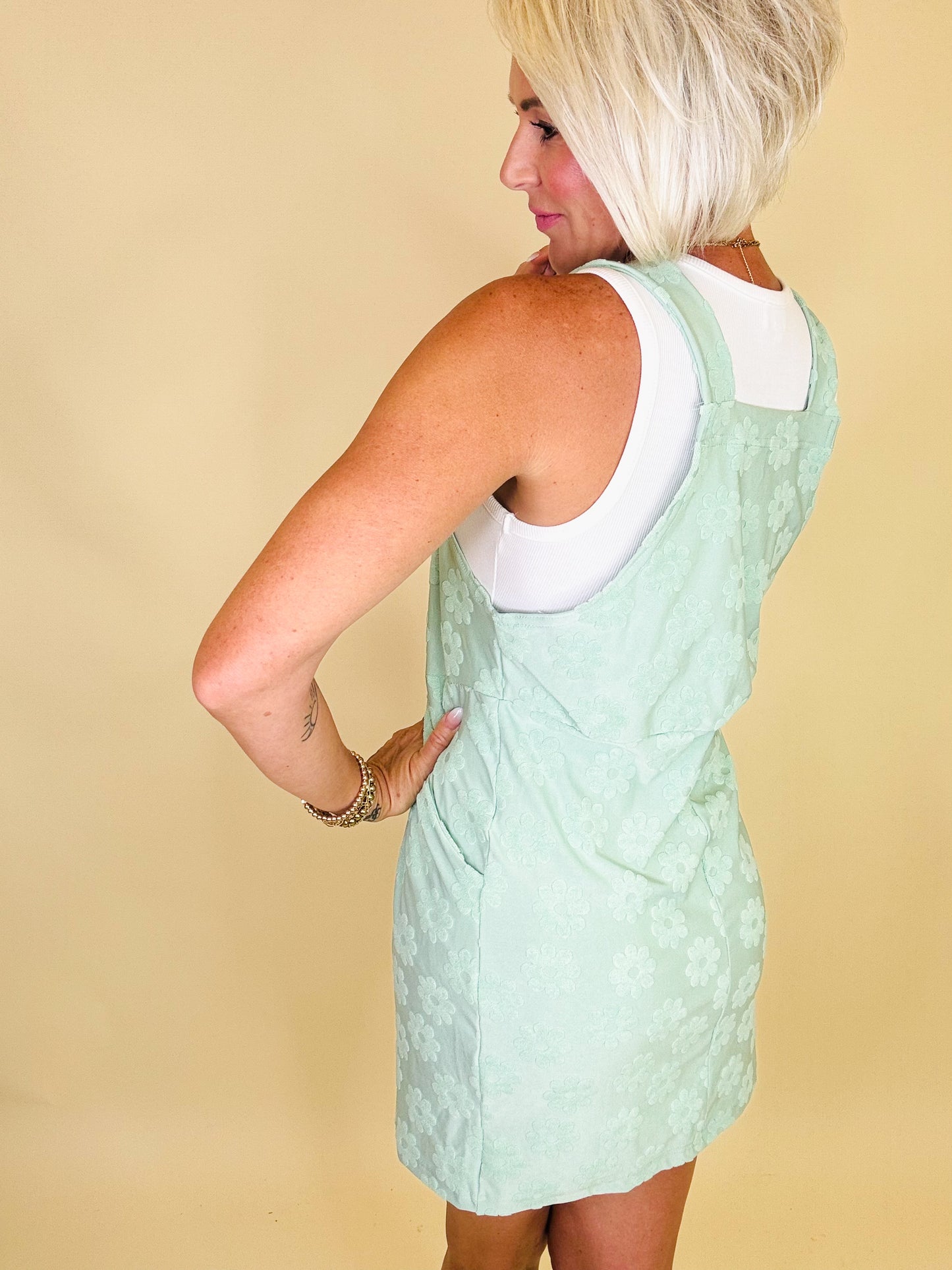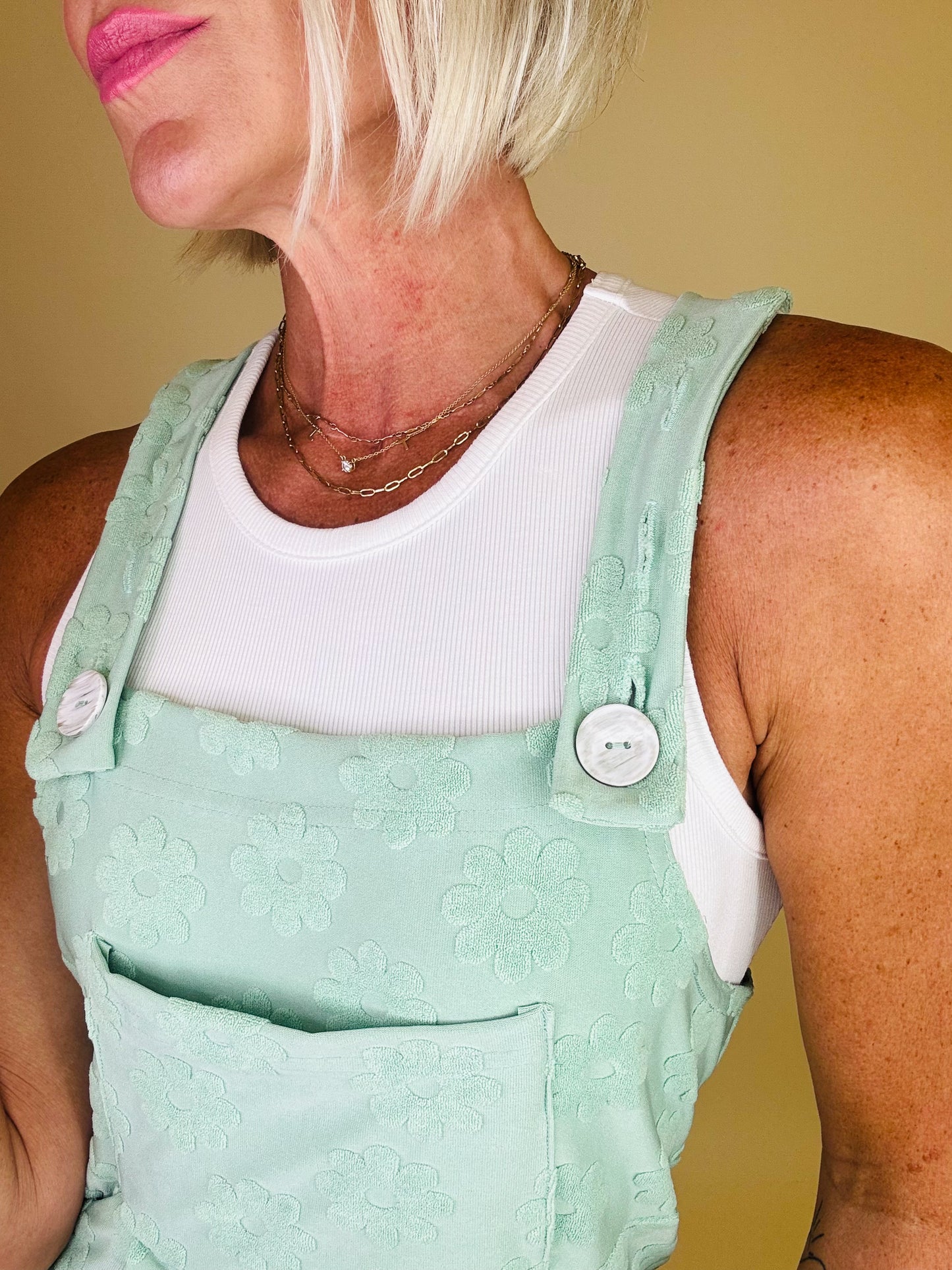 The most popular style overalls got a makeover and now in a SKIRT! Features our best selling “daisy” fabric! Laid-back Spring inspired raised terry floral pattern on a soft stretchy fabric! Perfect for warmer weather. Details include oversized side pockets with front pleating and an adjustable button strap for a perfect length (fasten the button up or down to adjust length) complete with a stylish front bib pocket.
