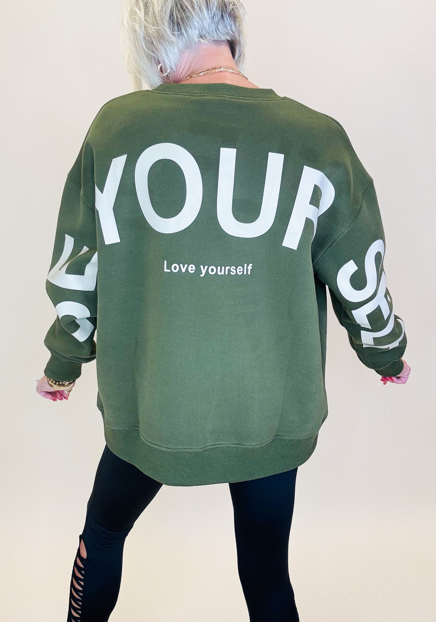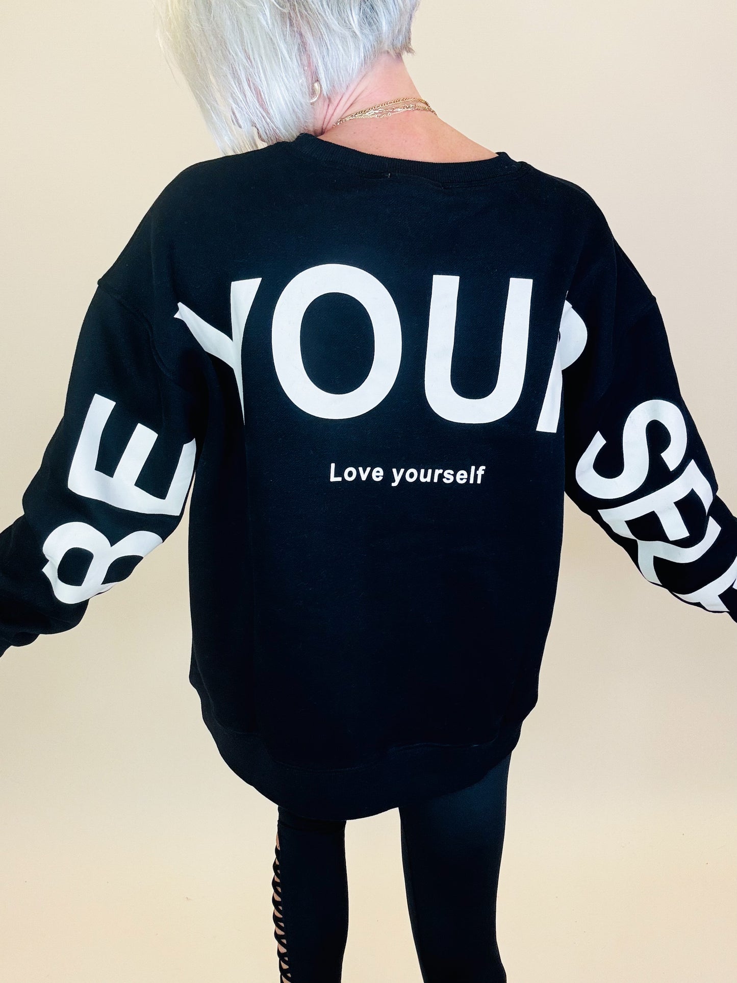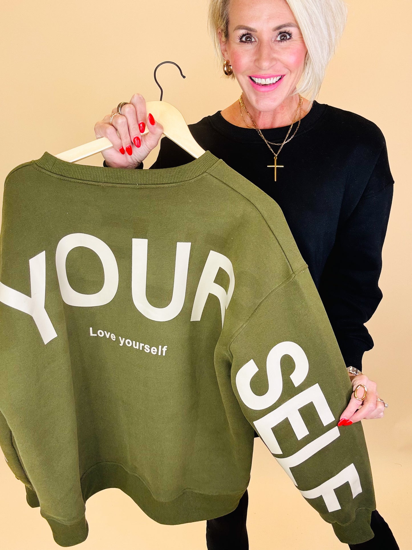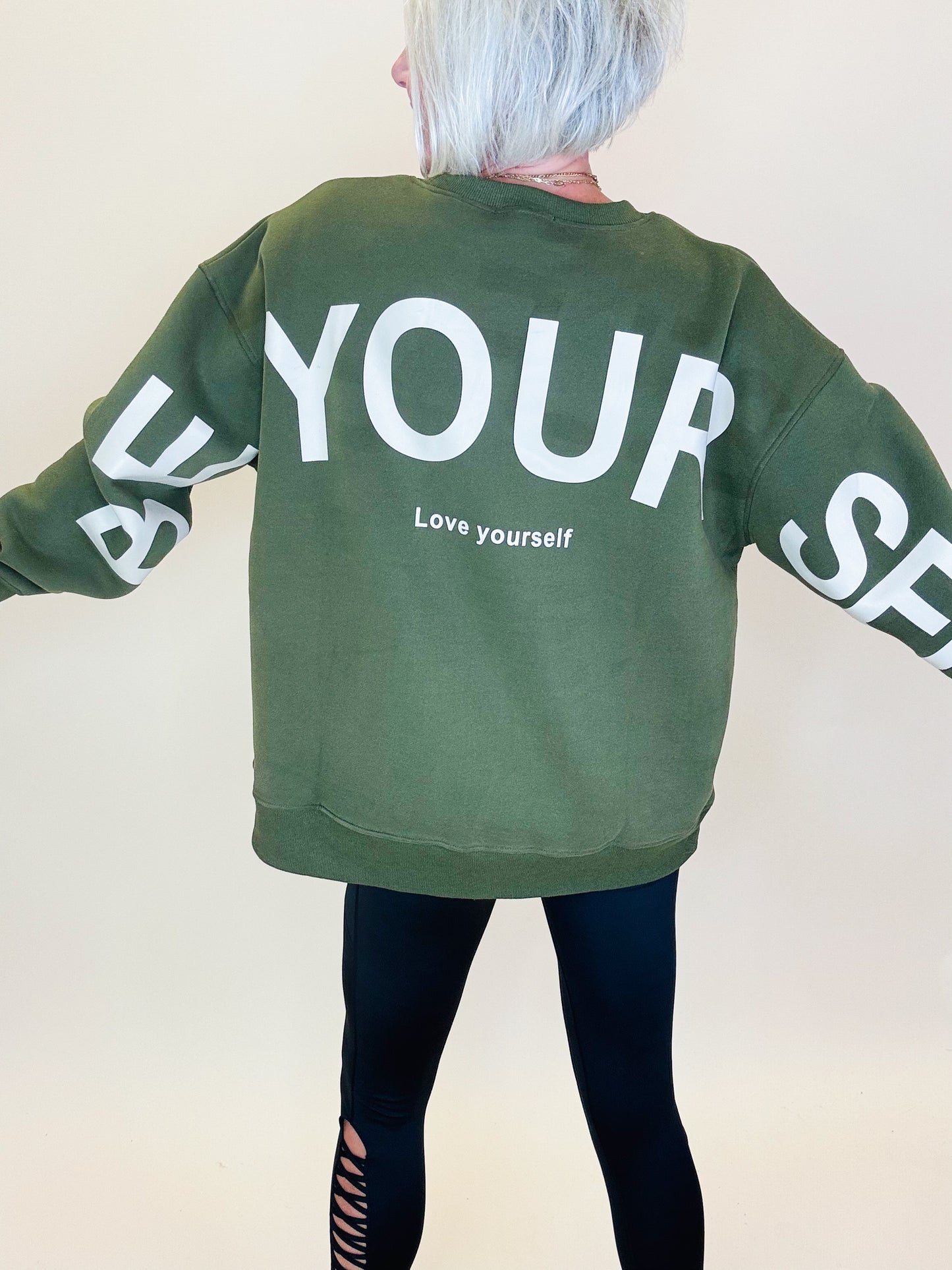 The Be Yourself Sweatshirt is your new go-to for comfort with confidence. Designed with bold block lettering across the back and sleeves that reads “BE YOURSELF,” this cozy crewneck reminds you to love yourself loud and proud. Crafted in a soft fleece fabric with a relaxed fit, it’s perfect for pairing with leggings or denim on casual days. Available in classic black and cool olive green — a simple statement that says it all: be comfy, be bold, be unapologetically you