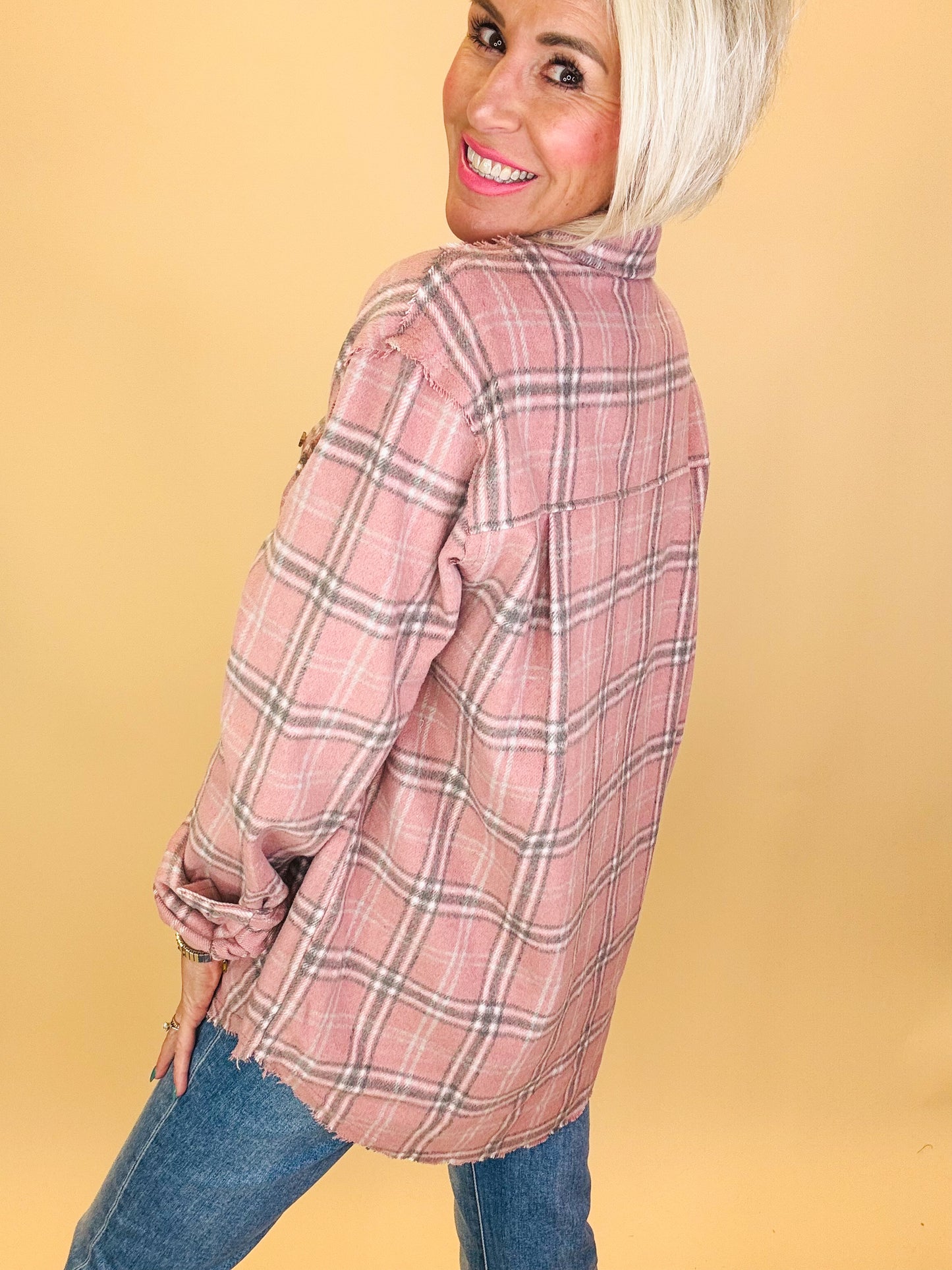 Soft, sweet, and a little rugged — the Dusty Rose Flannel is the perfect blend of feminine charm and laid-back style. Featuring a muted pink plaid with hints of gray and white, this lightweight button-down has a relaxed fit and raw hem for that effortlessly lived-in look. Cozy enough for cool days but stylish enough to wear year-round, it’s a wardrobe must-have for every season.