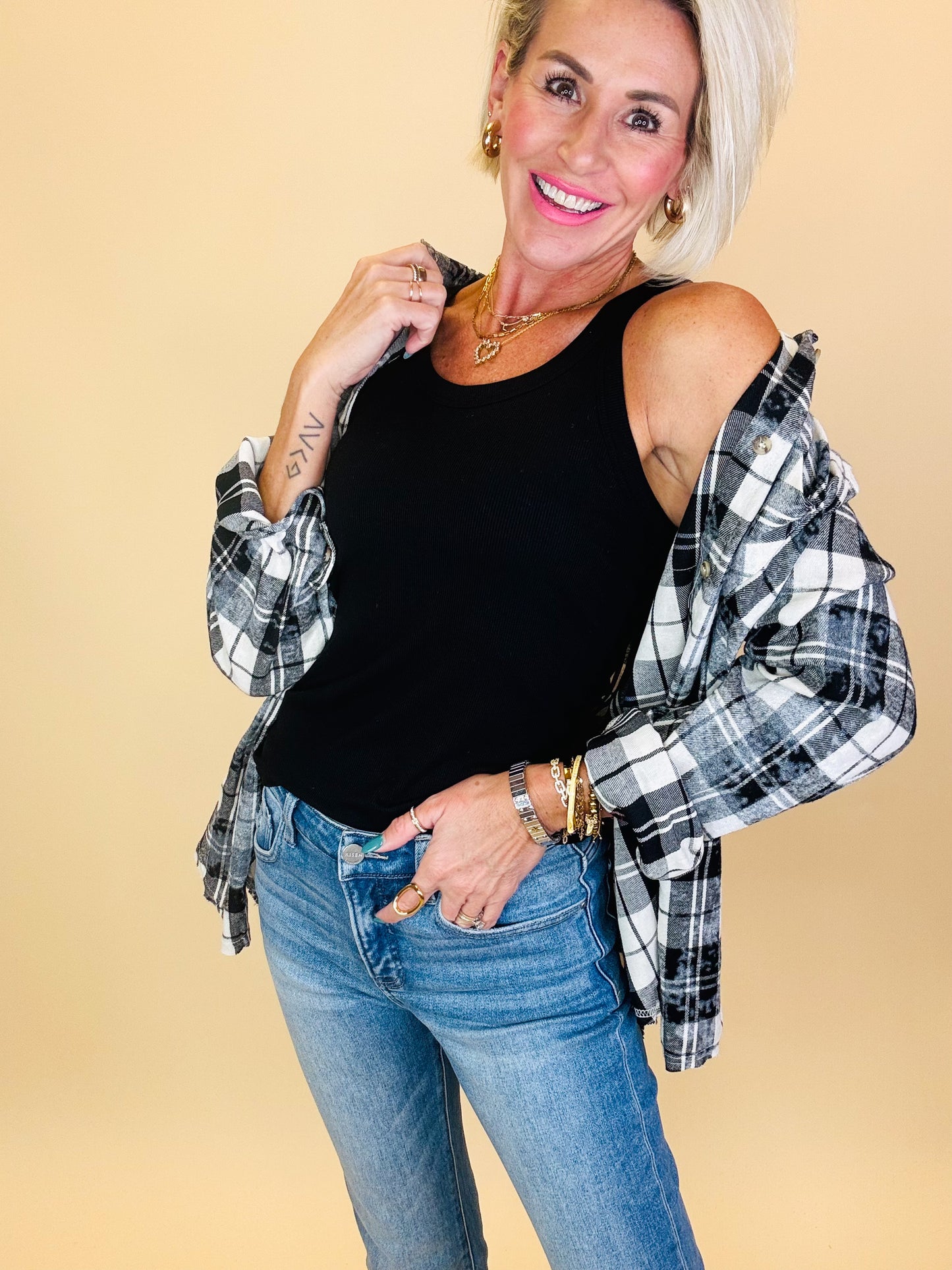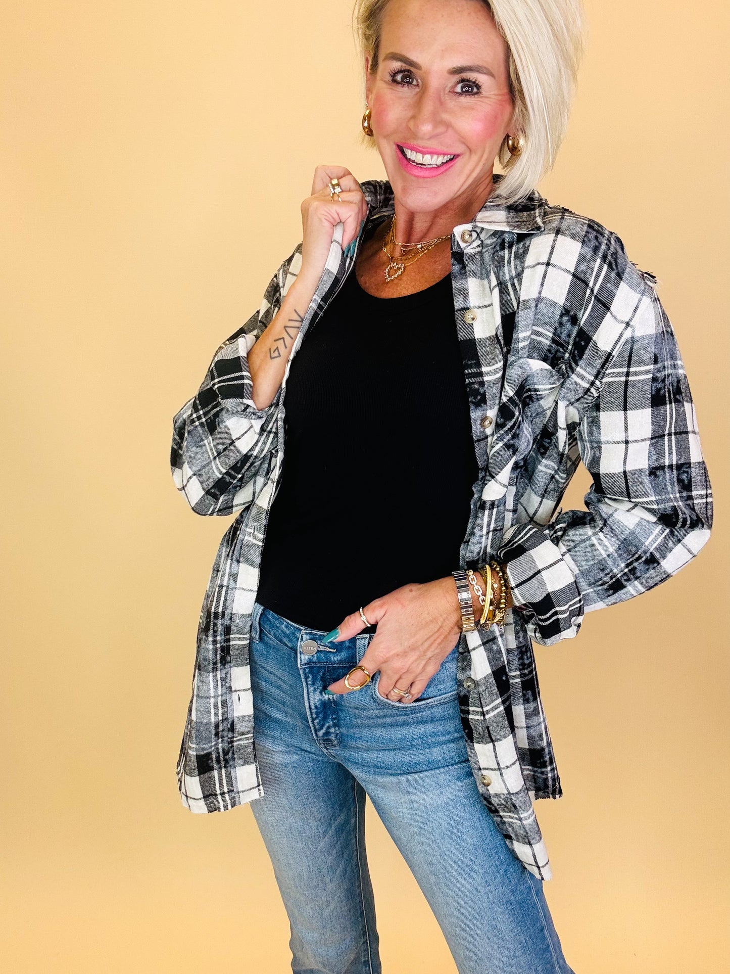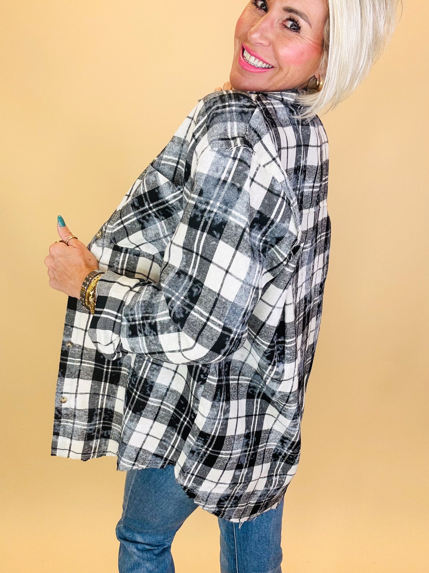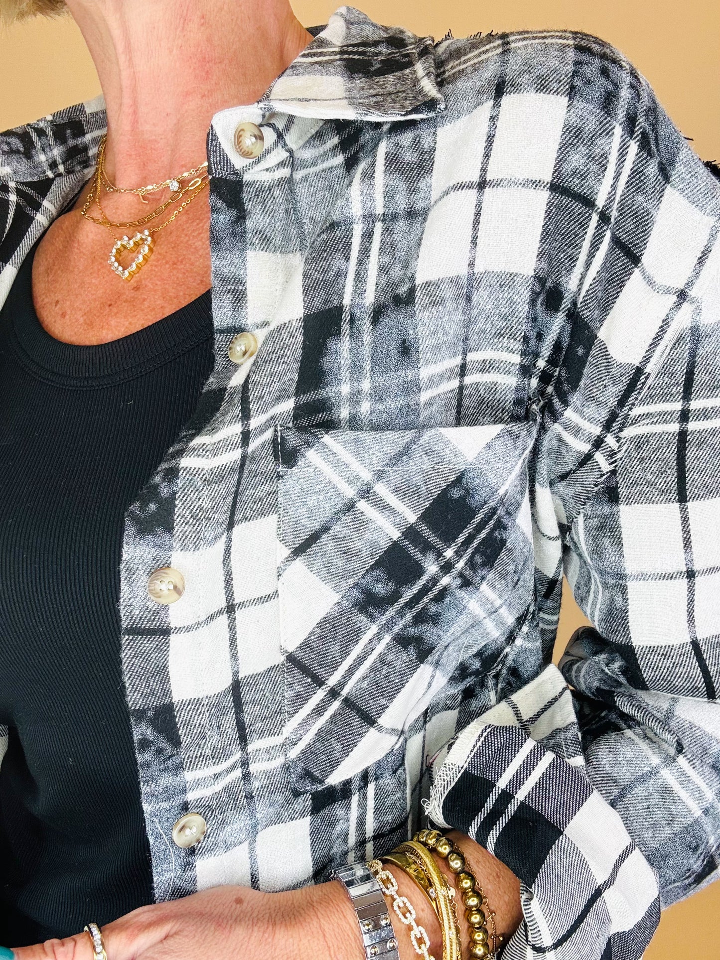 Stay cozy and classic in the Frosted Timber Flannel. This soft black-and-white plaid button-down features a lightly washed finish for that perfectly worn-in look and feel. With a relaxed silhouette and front pocket detail, it’s the ultimate layering piece for transitioning through the seasons — equal parts rugged and effortlessly chic.