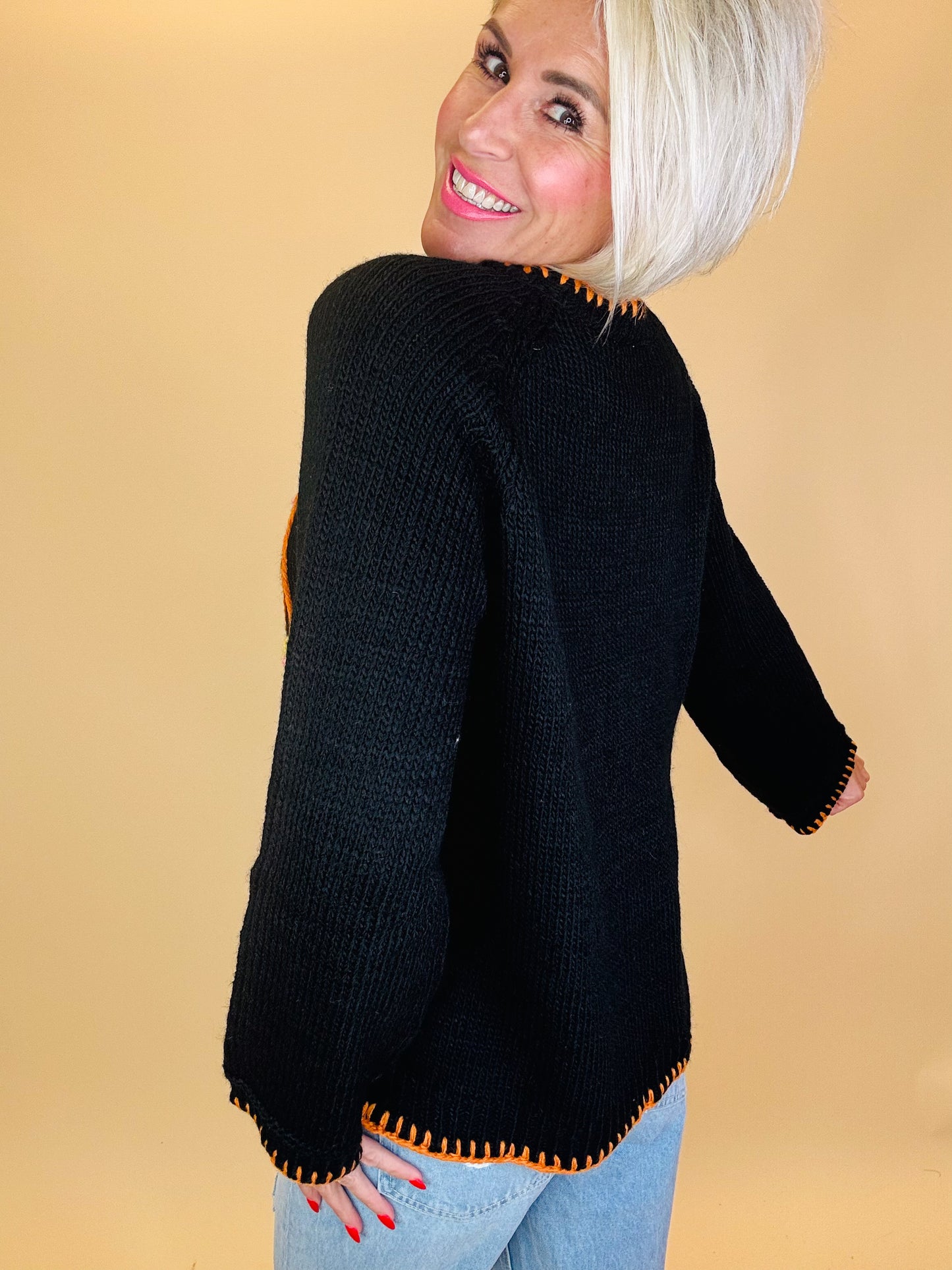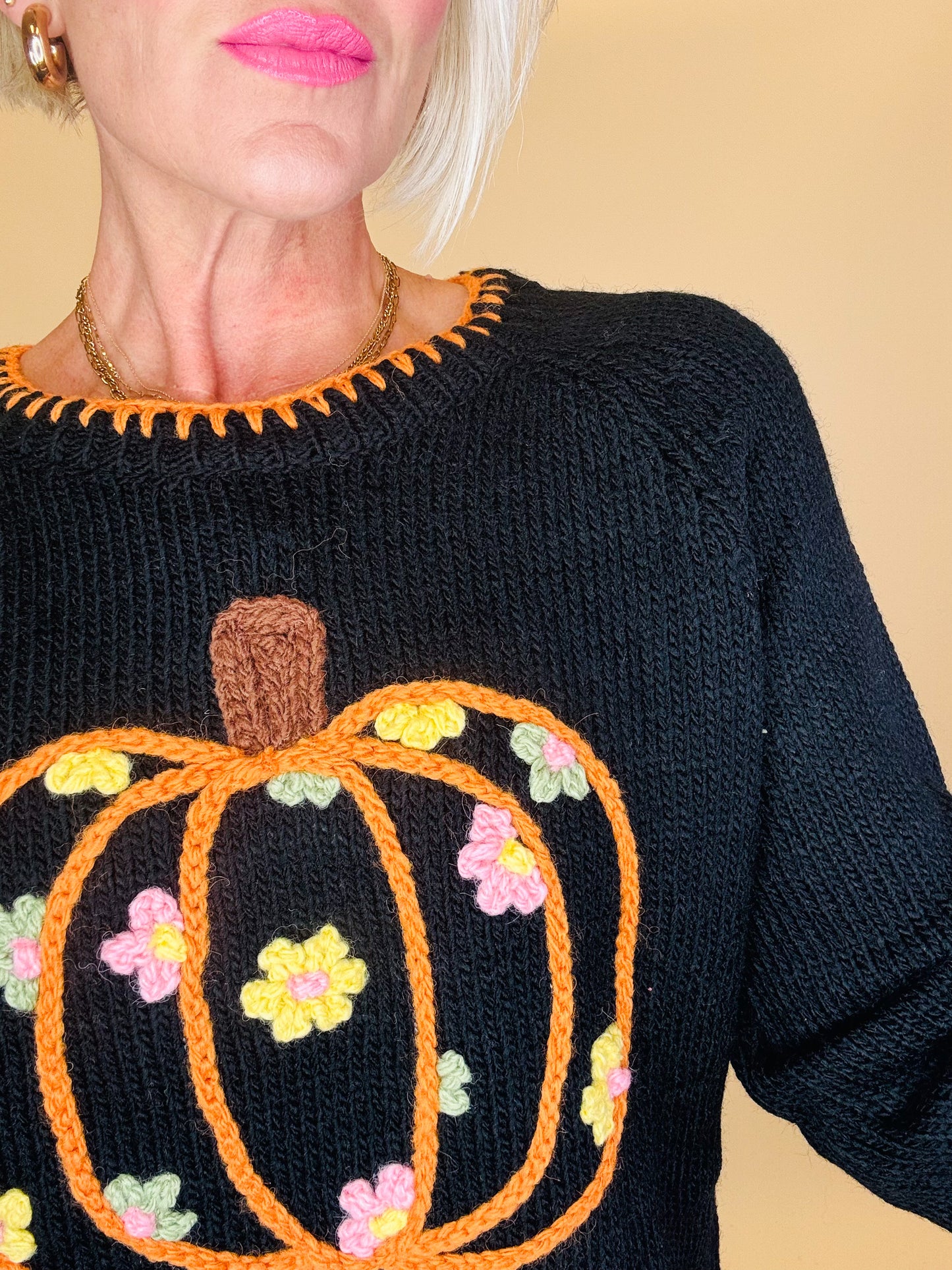 This soft black knit features a charming pumpkin design outlined in orange crochet with pastel floral accents for a feminine twist on fall. The orange whipstitch trim along the neckline, cuffs, and hem adds a handcrafted touch that makes this piece pop. Pair it with your favorite jeans or corduroy skirt for that effortlessly festive look — perfect for pumpkin patches, cider sipping, and crisp autumn days.