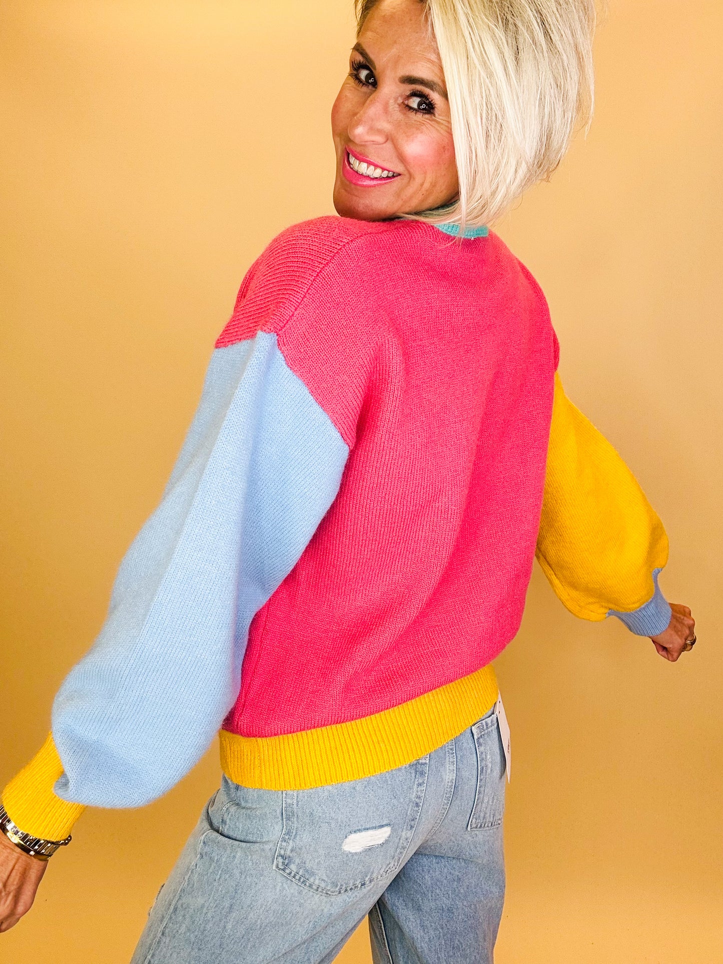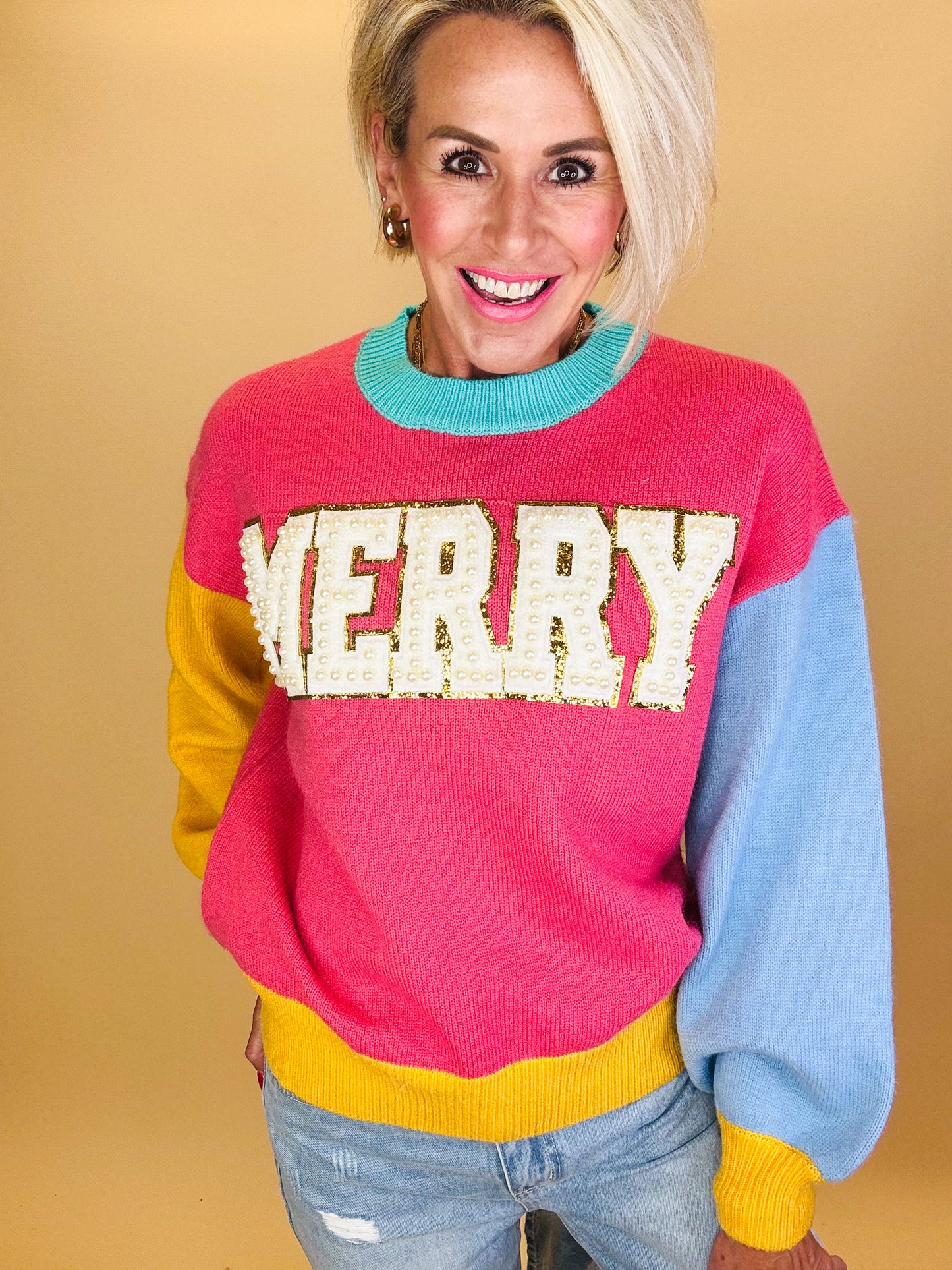 Stay cozy and cheerful all season long in the Merry Moments Sweater! This playful pullover mixes bold hues of pink, sky blue, and sunny yellow for a modern twist on festive style. The oversized pearl-and-gold “MERRY” lettering adds just the right touch of sparkle, while the relaxed fit and soft knit keep you comfy from cocoa nights to holiday parties. Pair it with denim or sparkly joggers for the happiest look of the season!