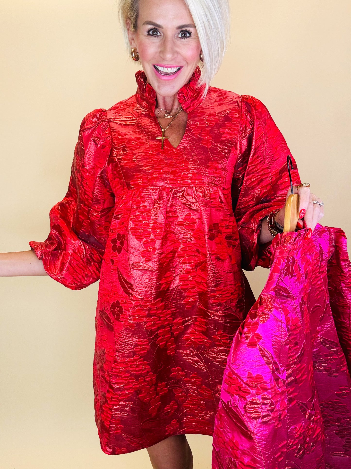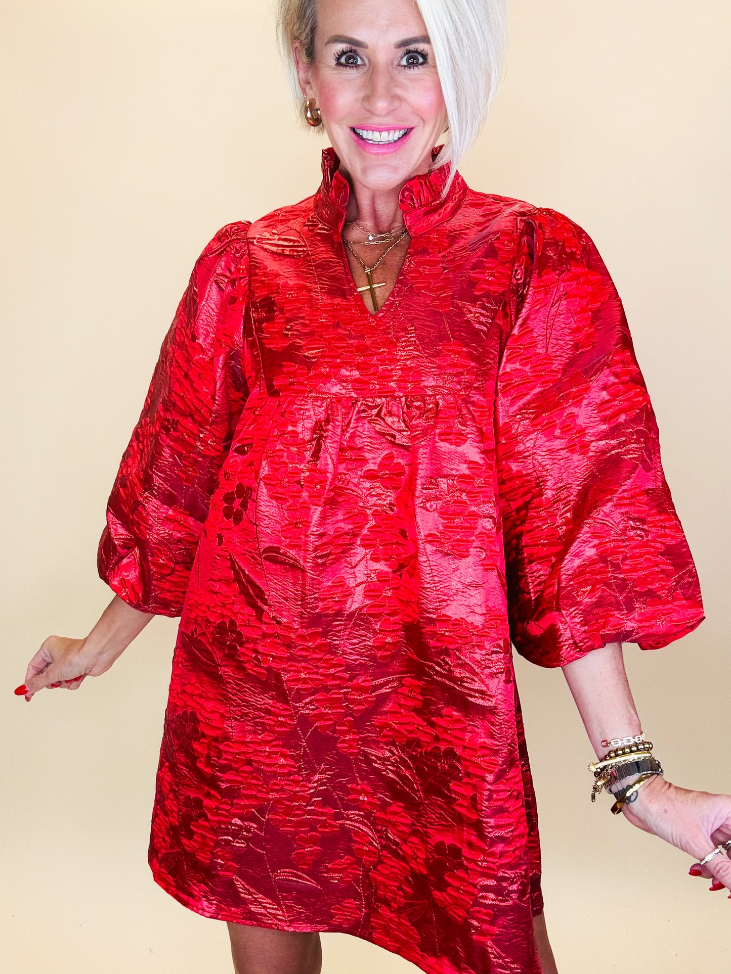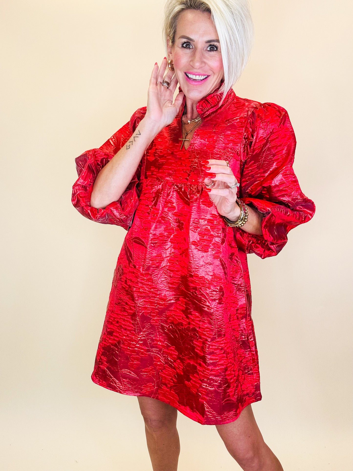 Make a bold entrance in the red carpet romance dress! A show-stopping piece that radiates confidence and celebration. This luxe jacquard mini features vibrant colors with a subtle metallic sheen that catches every glimmer of light. The voluminous puff sleeves, structured mock neck, and easy A-line silhouette create the perfect balance of drama and elegance. Pair it with gold accessories and heels for holiday parties, date nights, or any moment that deserves to shine