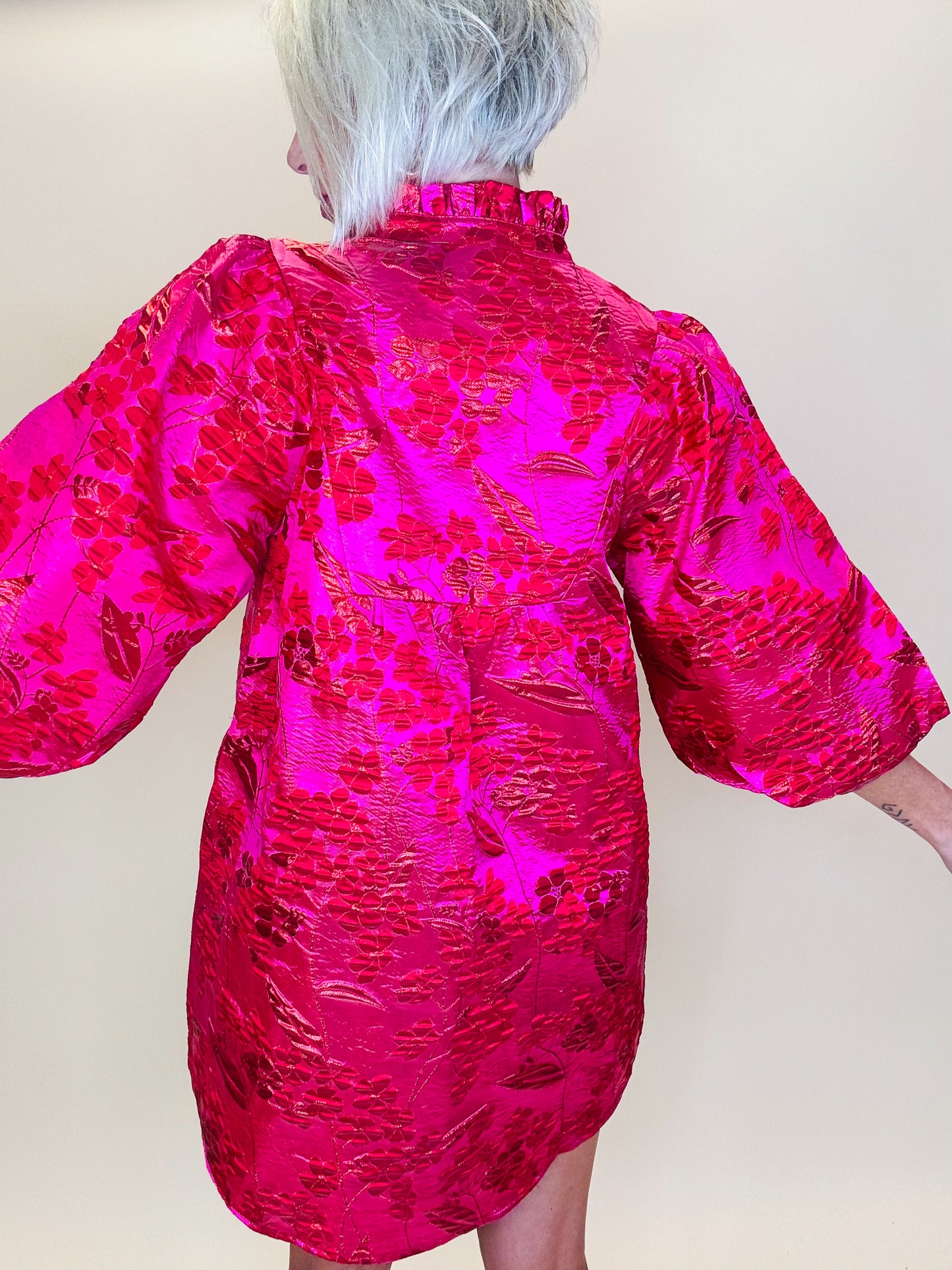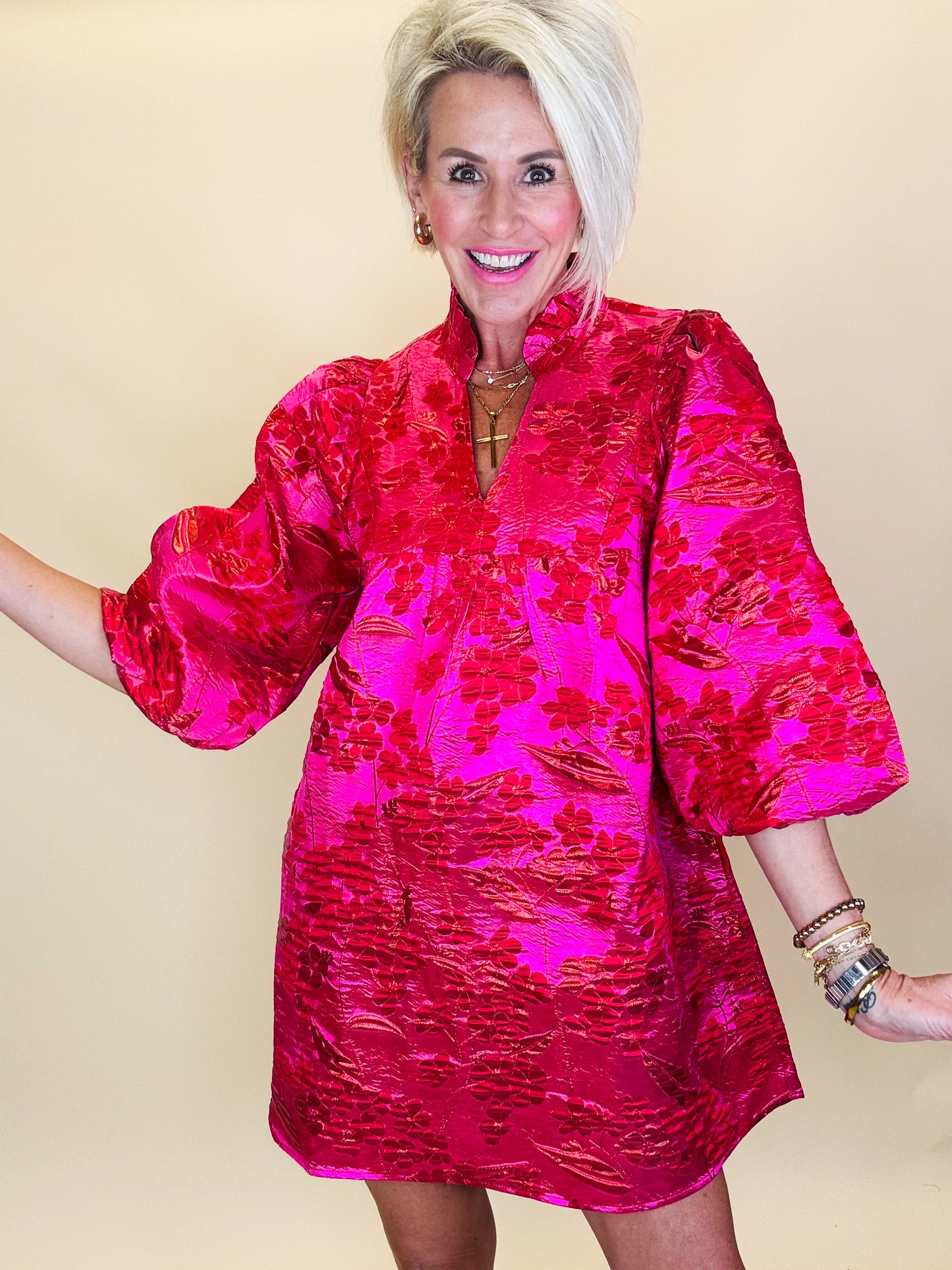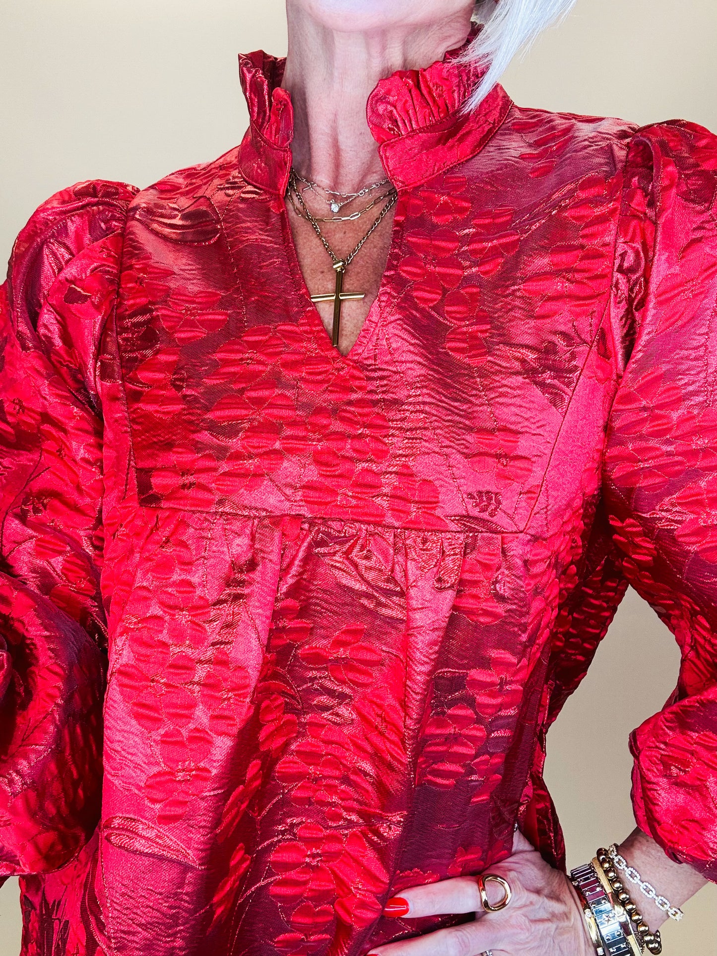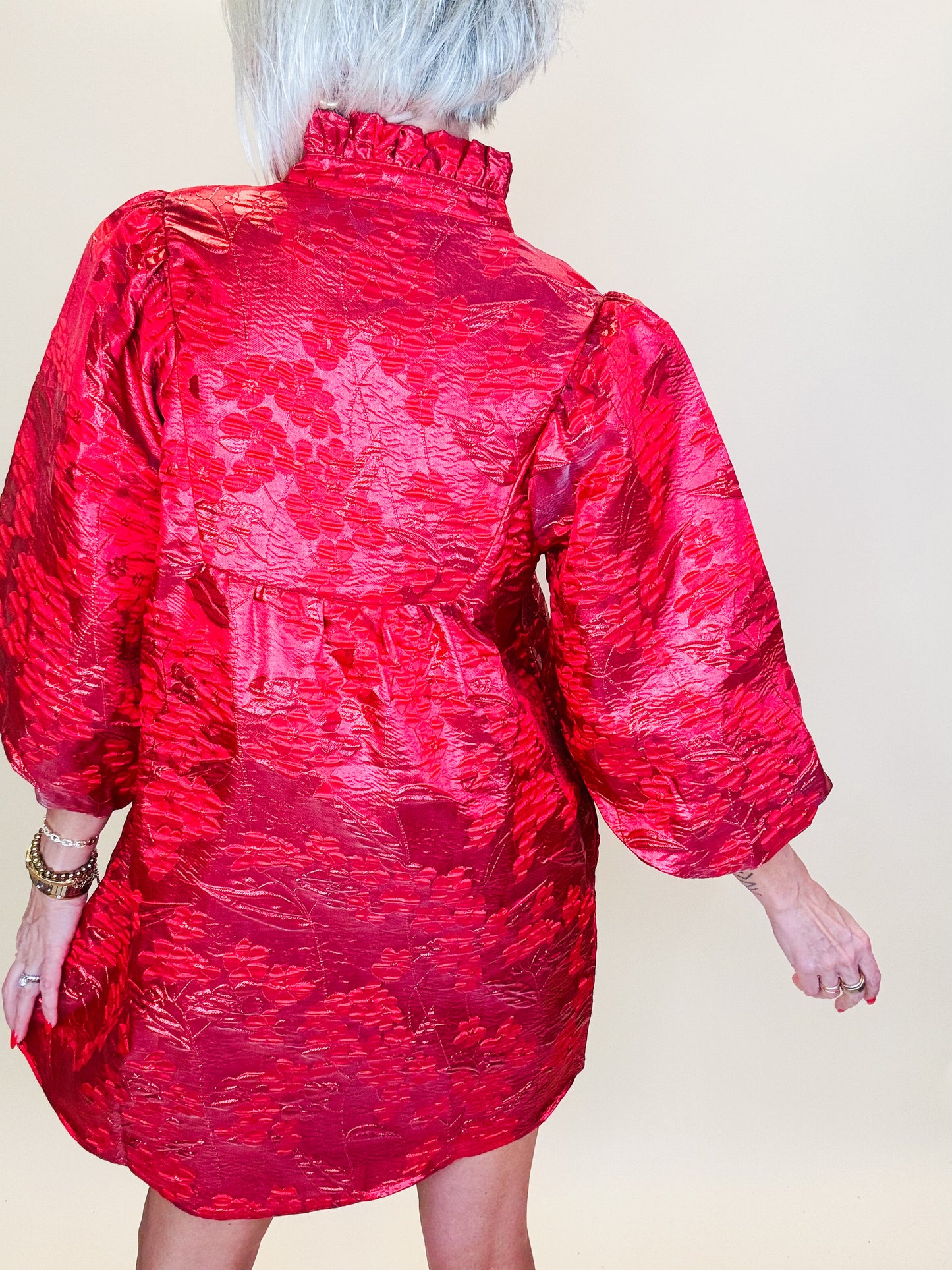 Make a bold entrance in the red carpet romance dress! A show-stopping piece that radiates confidence and celebration. This luxe jacquard mini features vibrant colors with a subtle metallic sheen that catches every glimmer of light. The voluminous puff sleeves, structured mock neck, and easy A-line silhouette create the perfect balance of drama and elegance. Pair it with gold accessories and heels for holiday parties, date nights, or any moment that deserves to shine