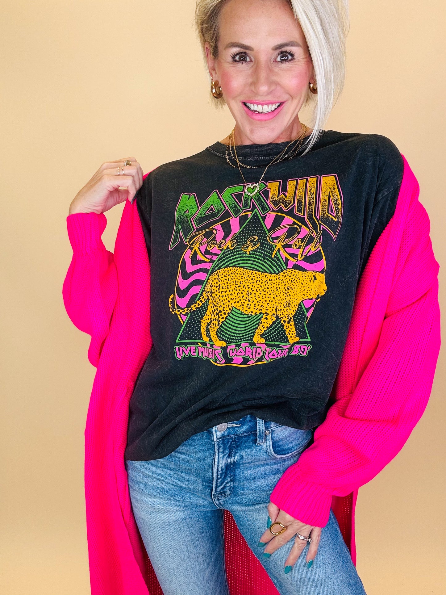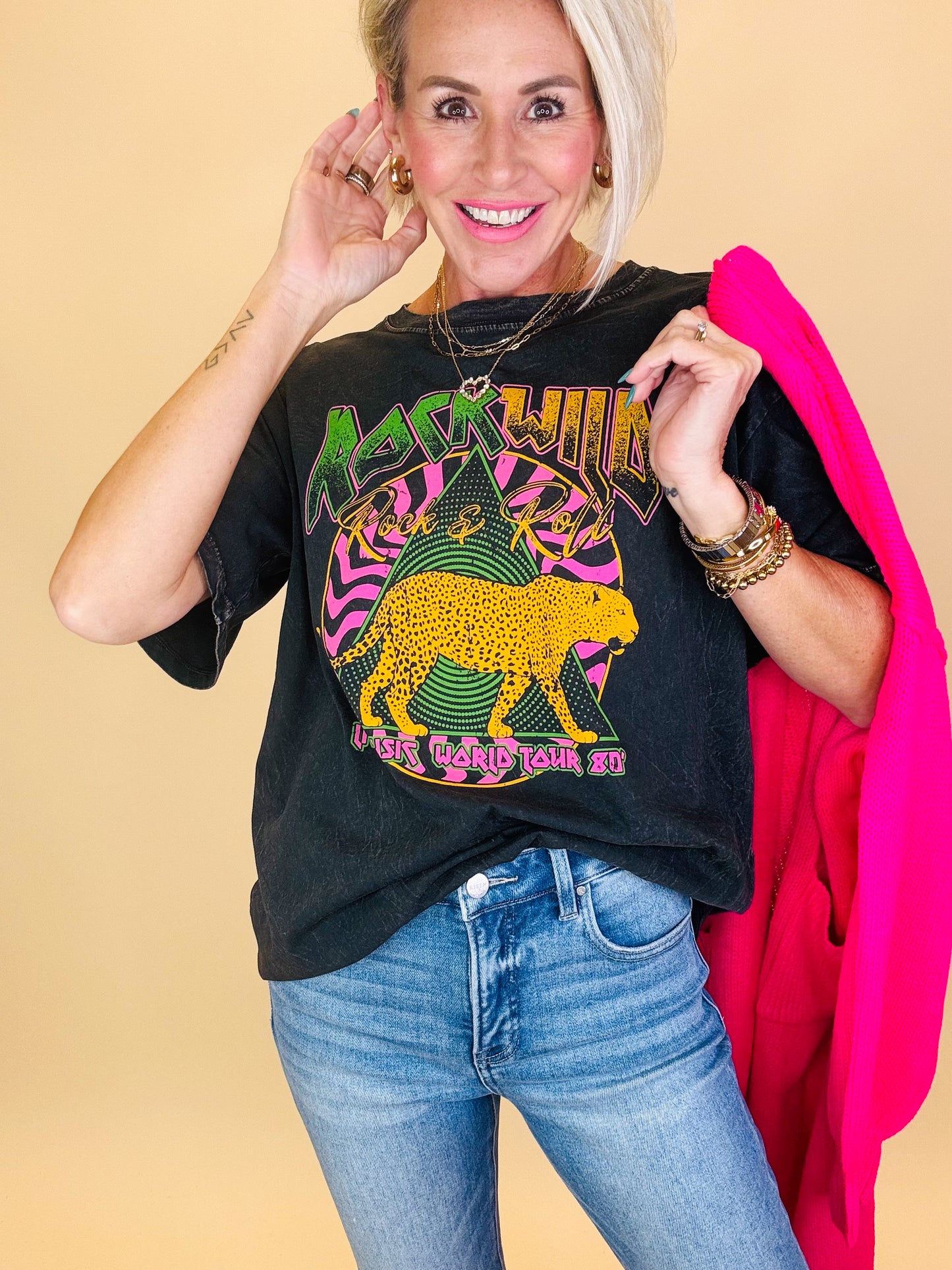 Turn up the attitude with the Rock Wild Tour Tee. This vintage-washed black graphic tee brings the perfect mix of retro and fierce — featuring bold neon graphics, a vibrant leopard design, and an old-school “Rock & Roll World Tour” print that screams rebel energy. Its relaxed, lived-in feel makes it an instant favorite for edgy everyday style.