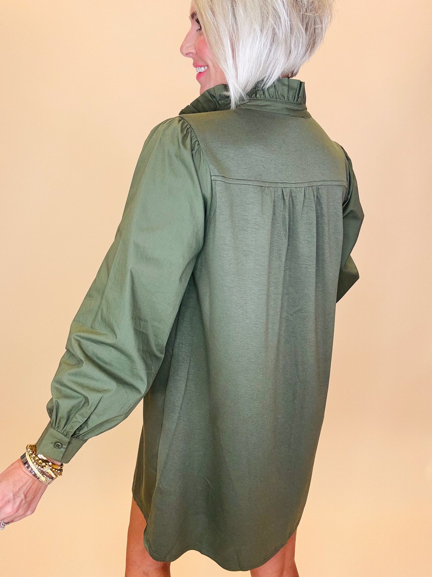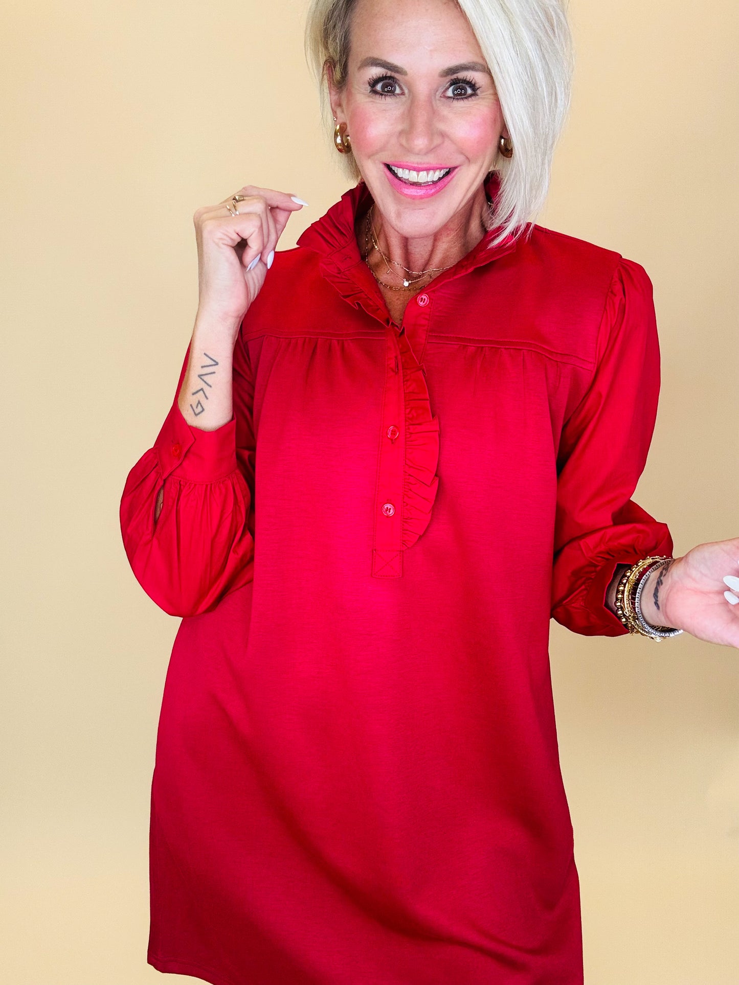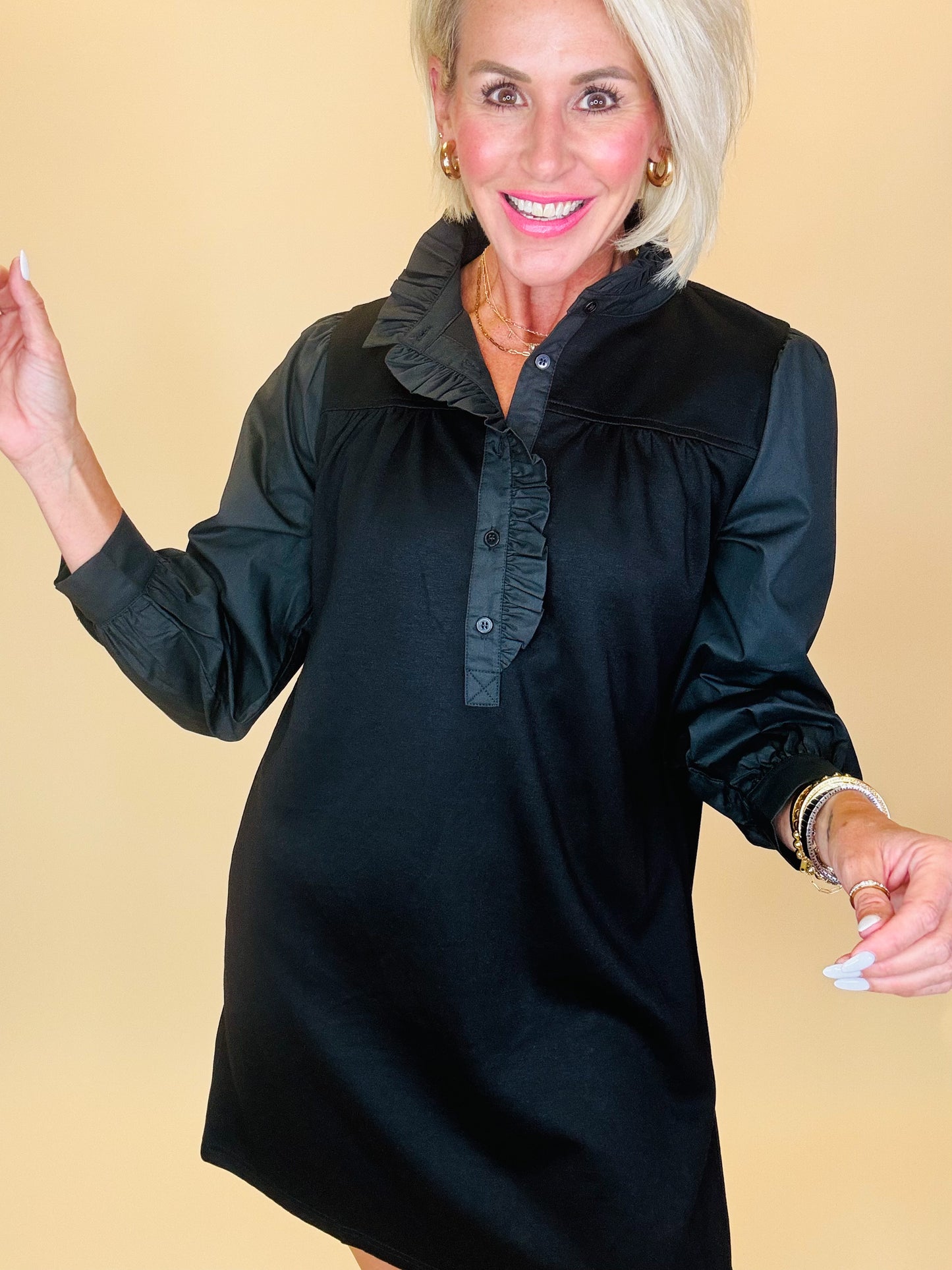 This little dress is where classic meets chic with a touch of feminine flair. Designed in a tunic-style silhouette, it features a collared neckline with delicate ruffle trim and a partial button placket for a refined touch. The long sleeves are crafted with a subtle sheen and gathered at the cuffs, adding structure and elegance to the look. Falling above the knee, this dress is versatile enough to wear casually with boots or dressed up with heels and bold accessories. A timeless staple with a modern twist.