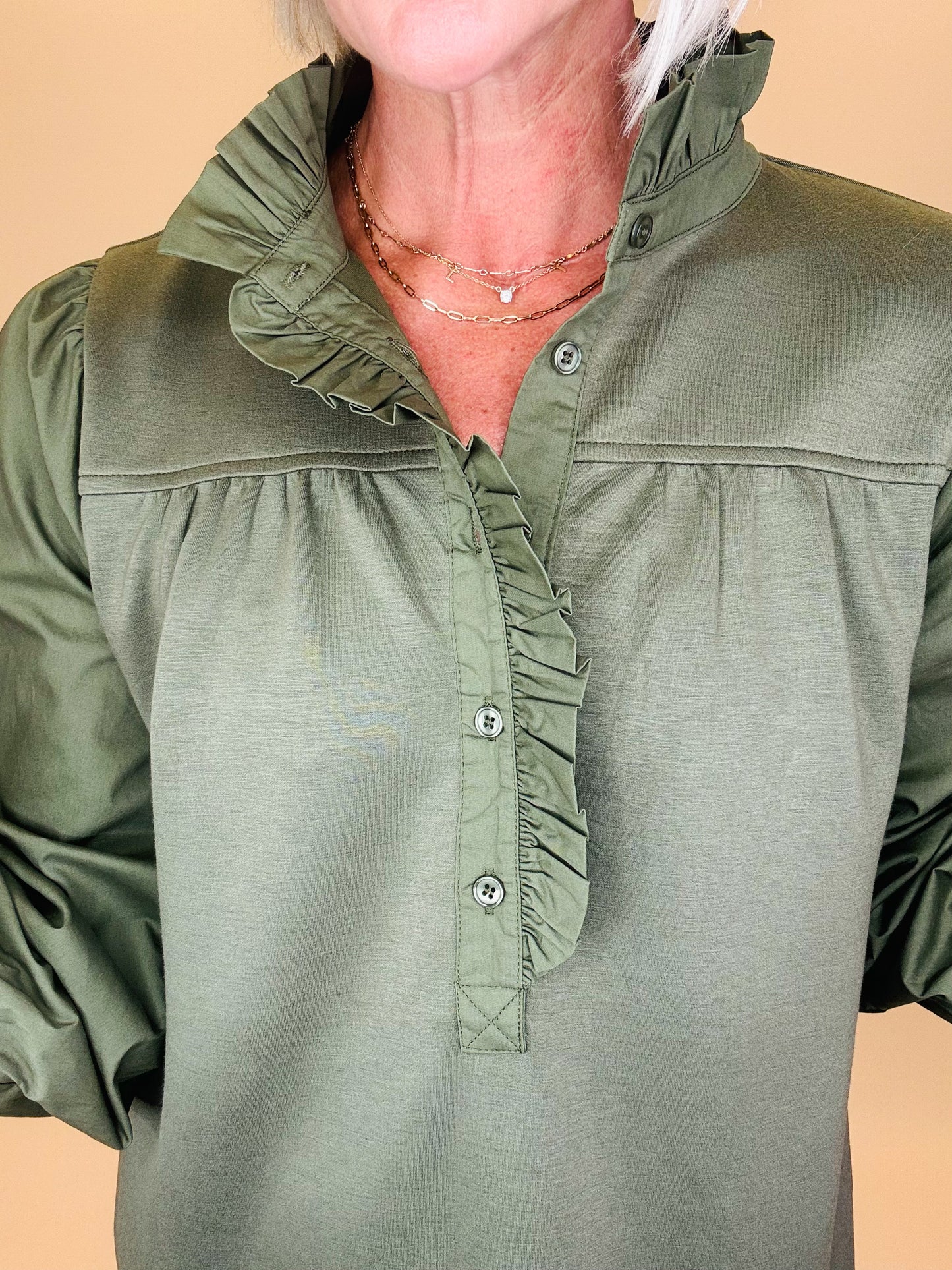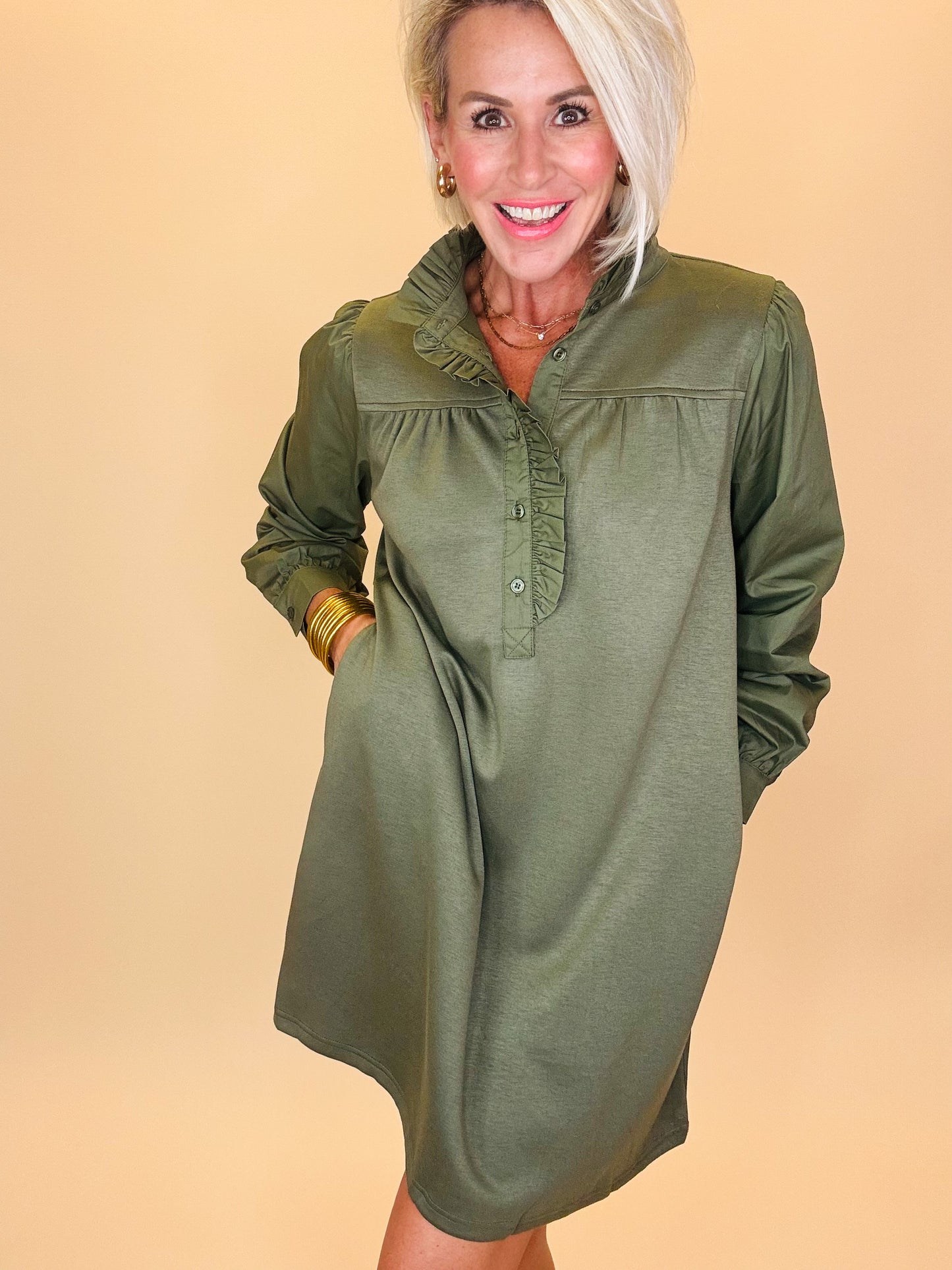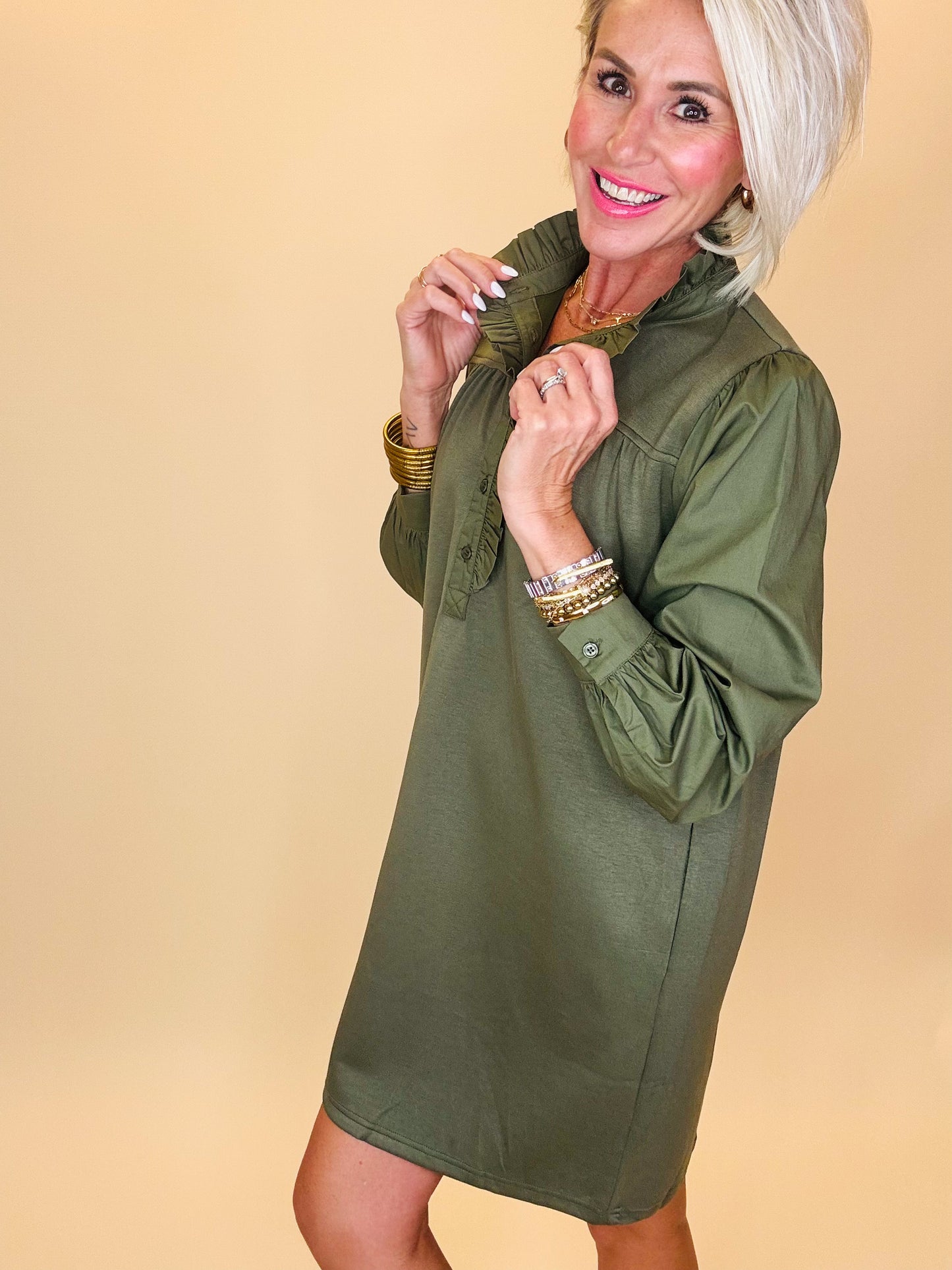 This little dress is where classic meets chic with a touch of feminine flair. Designed in a tunic-style silhouette, it features a collared neckline with delicate ruffle trim and a partial button placket for a refined touch. The long sleeves are crafted with a subtle sheen and gathered at the cuffs, adding structure and elegance to the look. Falling above the knee, this dress is versatile enough to wear casually with boots or dressed up with heels and bold accessories. A timeless staple with a modern twist.