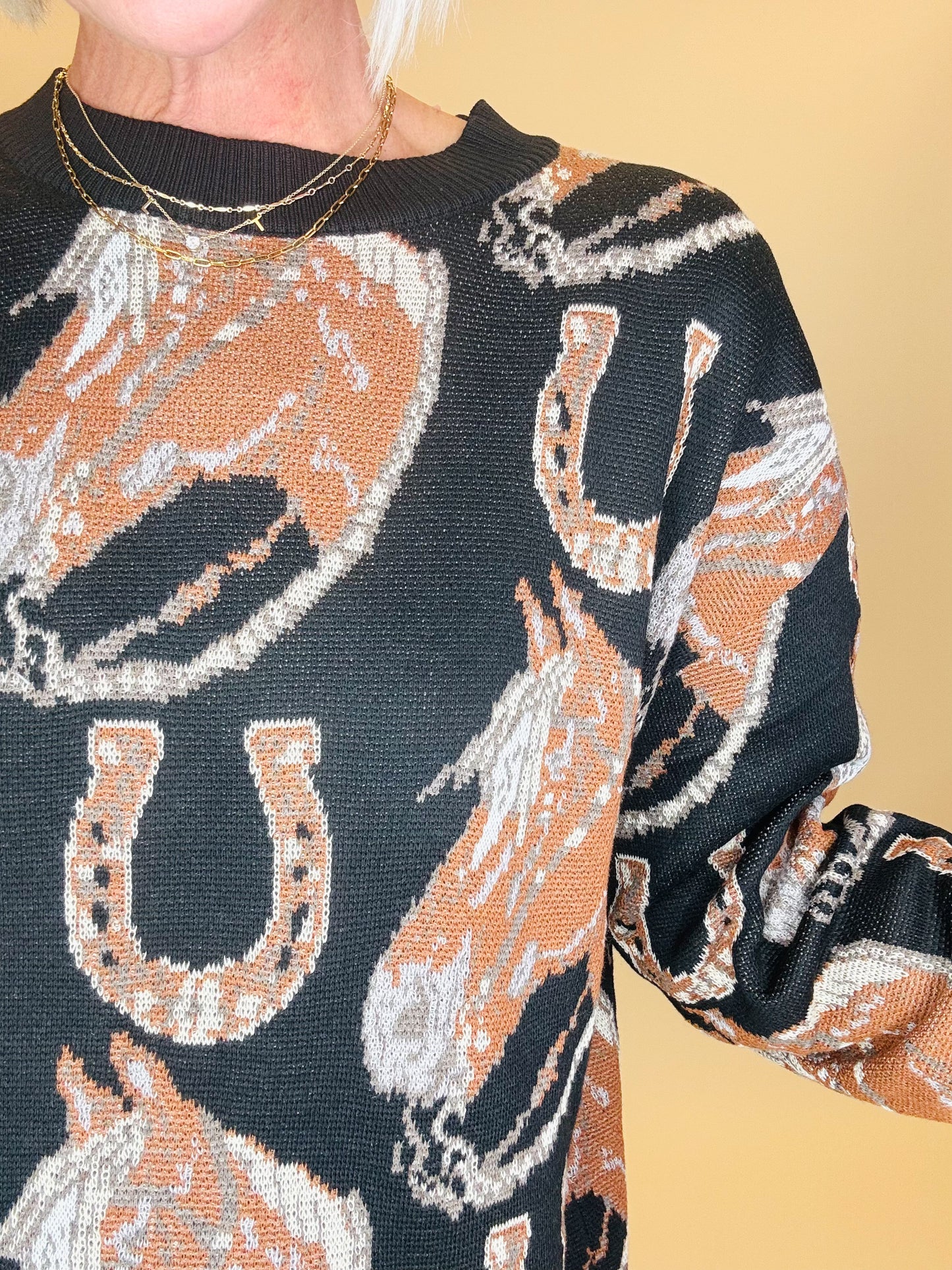 Saddle up in style with this statement-making sweater dress! Covered in galloping horse heads and lucky horseshoe motifs, it’s the perfect blend of western charm and cozy chic. The relaxed fit and soft knit fabric make it easy to wear, while the bold allover print ensures you’ll stand out in any crowd. Pair it with your favorite cowboy boots for a true rodeo-ready vibe or dress it up with booties for a night out.