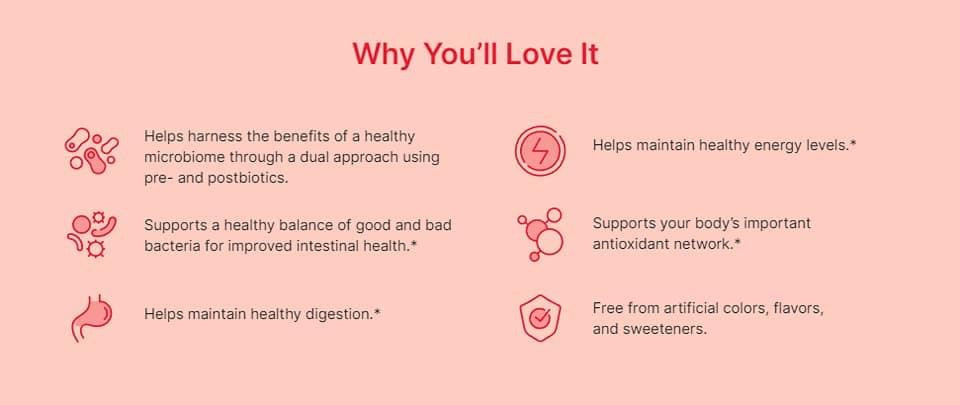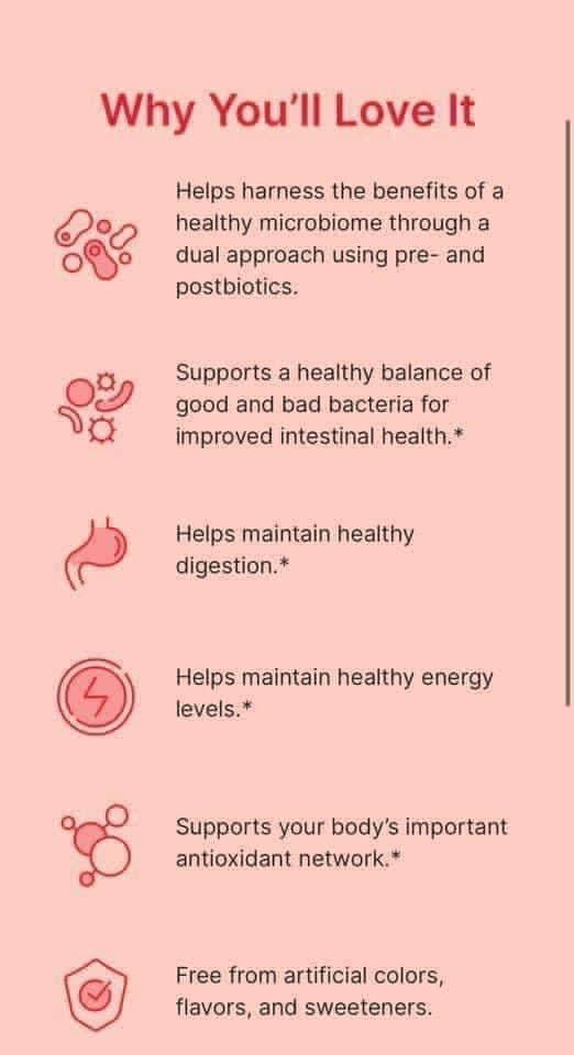 NUBIOME SUPPORTS VITAL INTESTINAL BALANCE WITH DUAL -ACTION SOLUTION OF PRE AND POSTBIOTICS, PLUS A HEALTHY BOOST OF CAFFEINE FOR ADDED ENERGY!