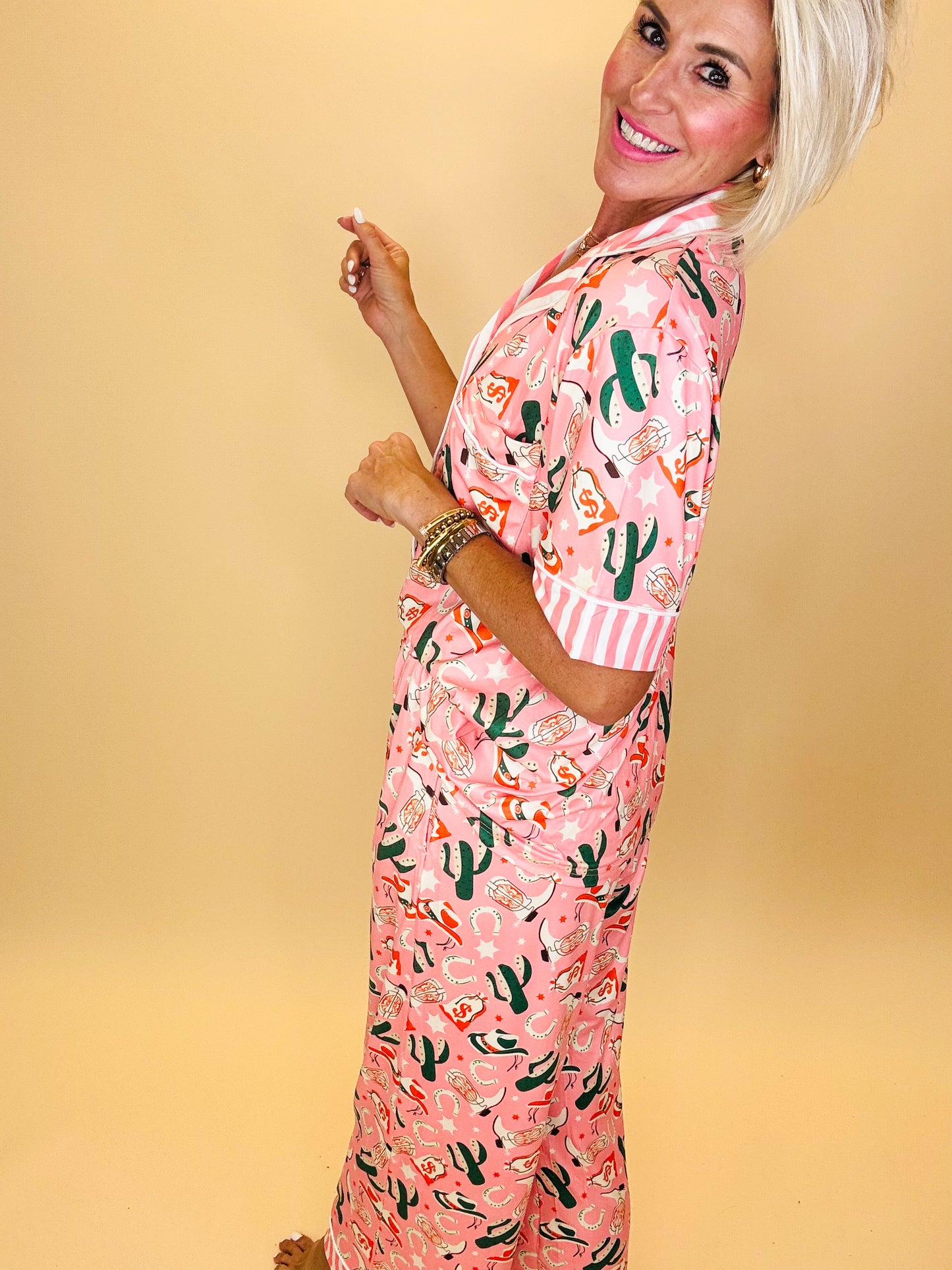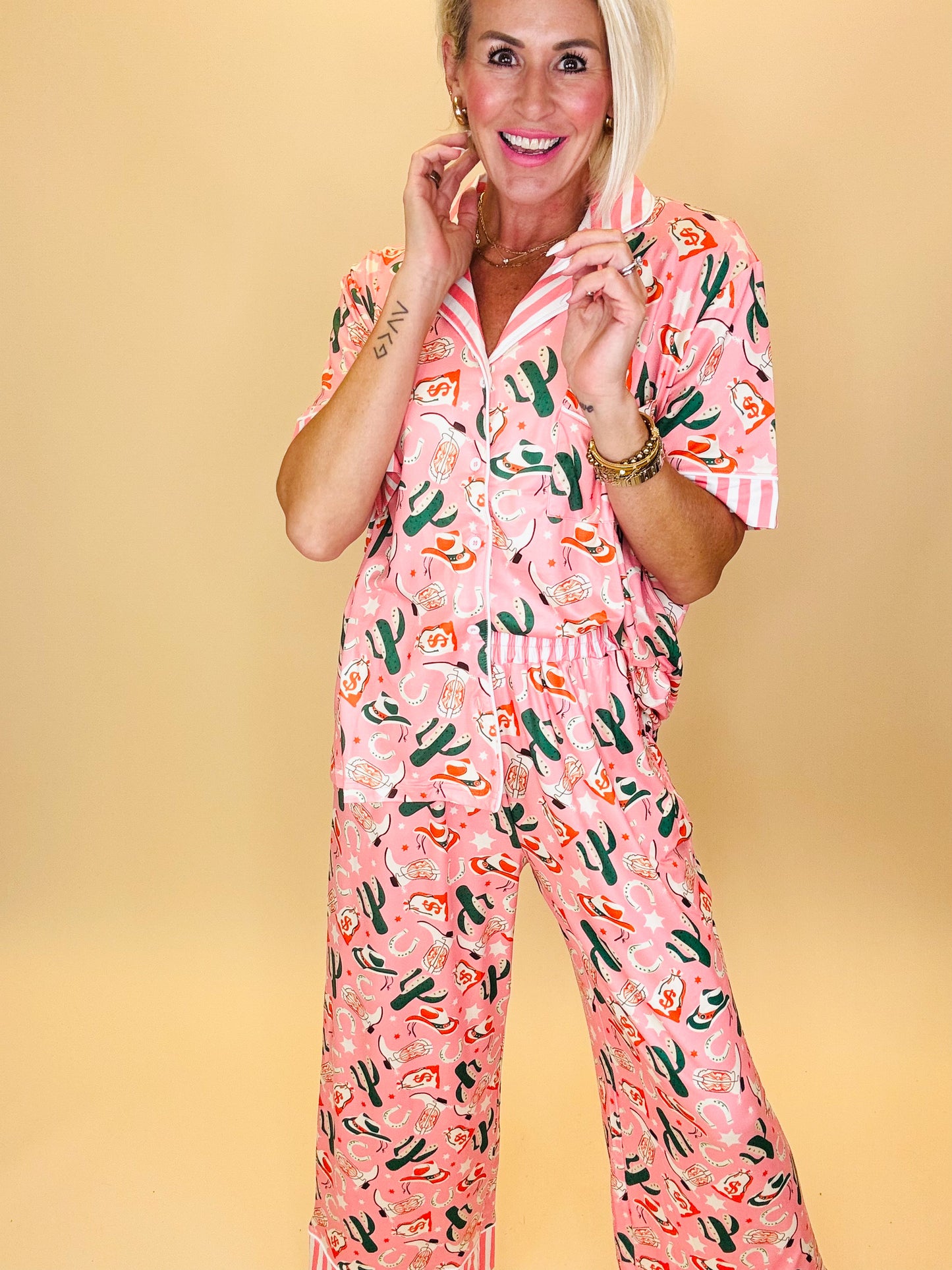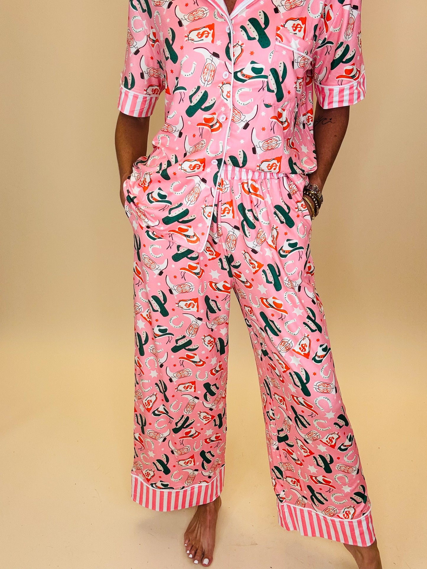 A playful two-piece pajama set in a soft blush-pink base, featuring an all-over Southwestern print of cowboy hats, boots, cacti, money bags, and stars. The top has a classic button-down style with short sleeves, a collared neckline, and contrasting pink-and-white striped trim along the collar and cuffs. The matching pants have an elastic waistband for comfort, with coordinating striped trim at the hem. Made from a buttery soft lightweight fabric, this set blends cozy lounge vibes with a bold, cowgirl-inspired print—perfect for adding personality to your bedtime or lazy day look.