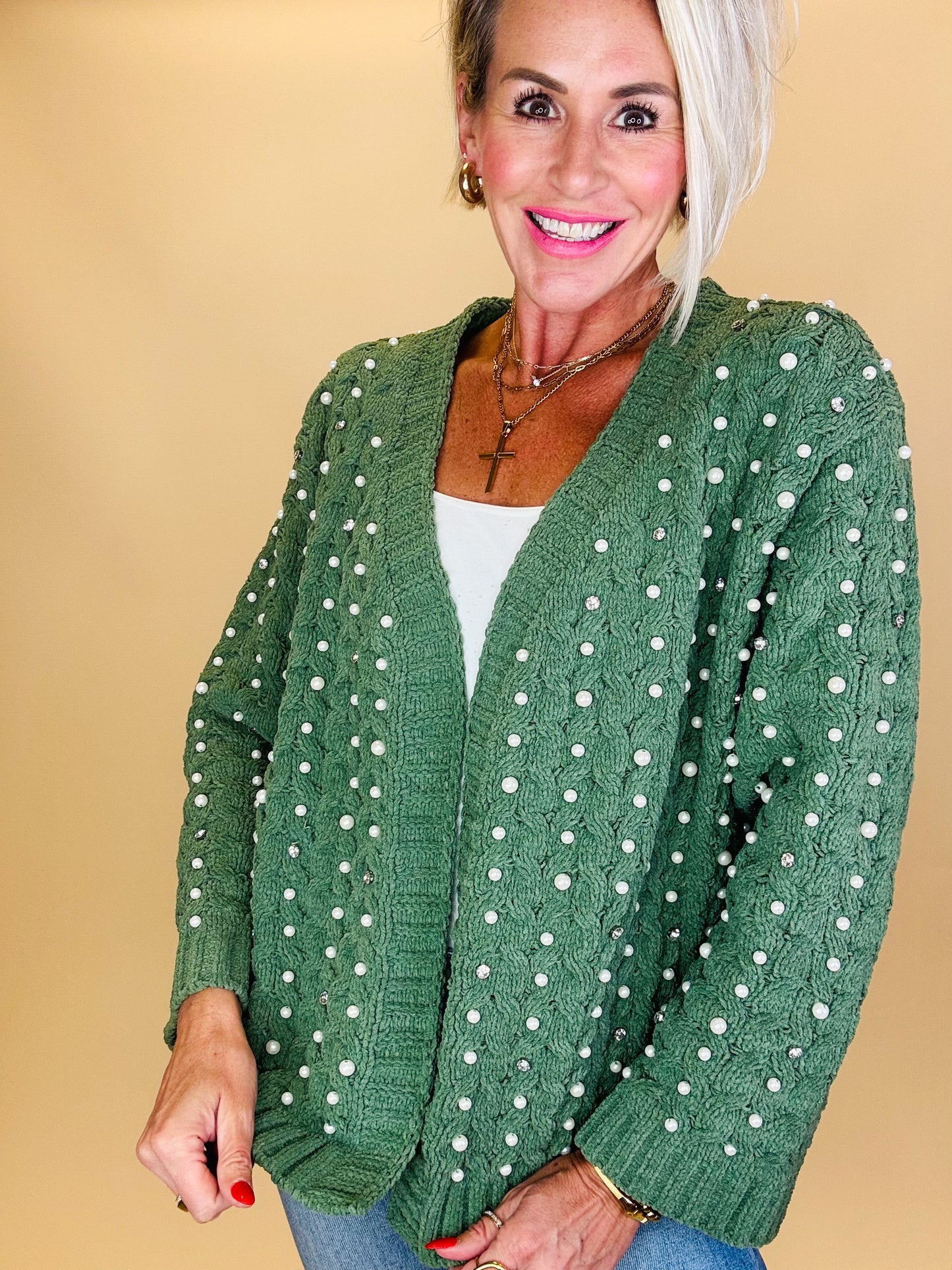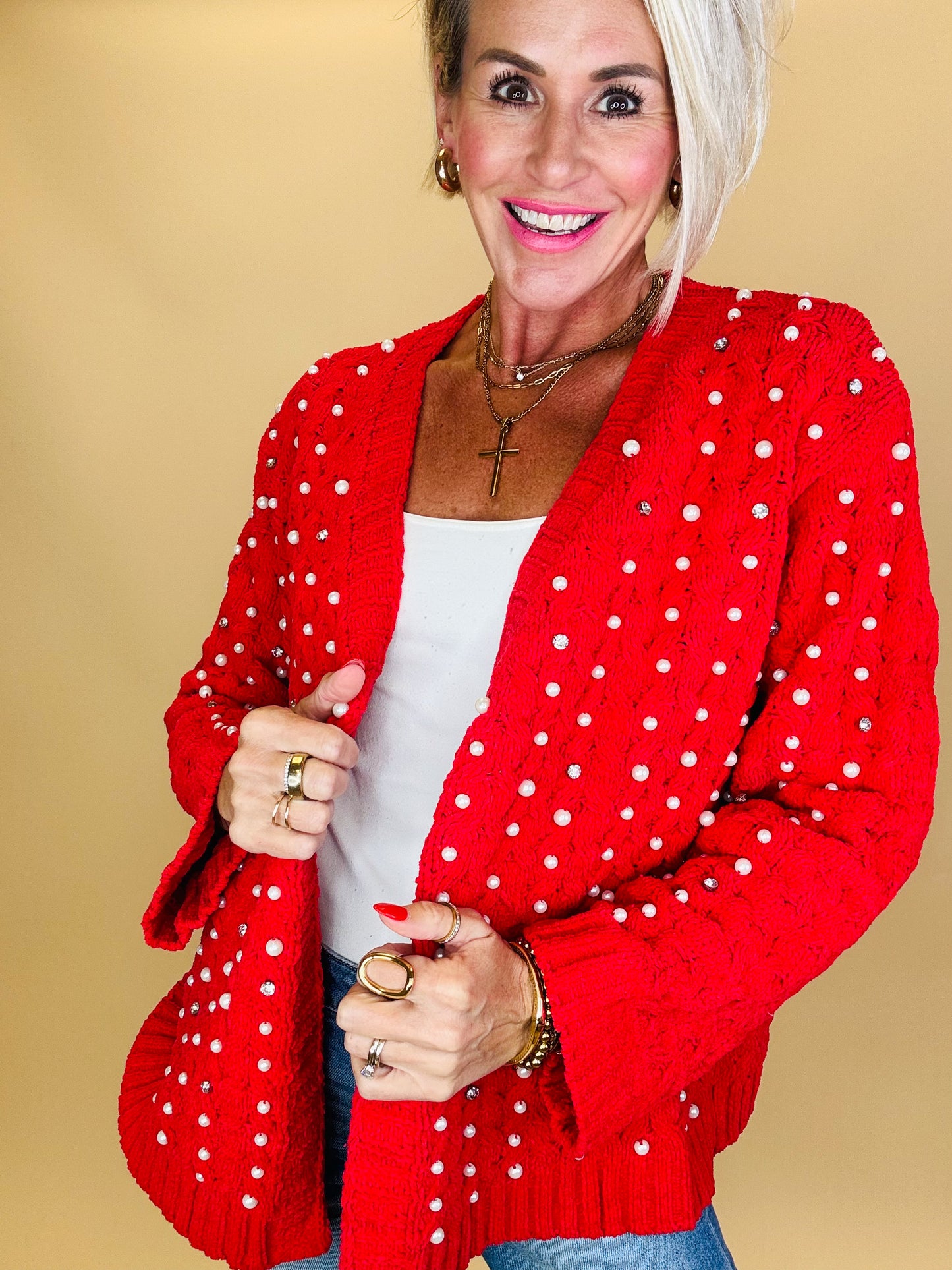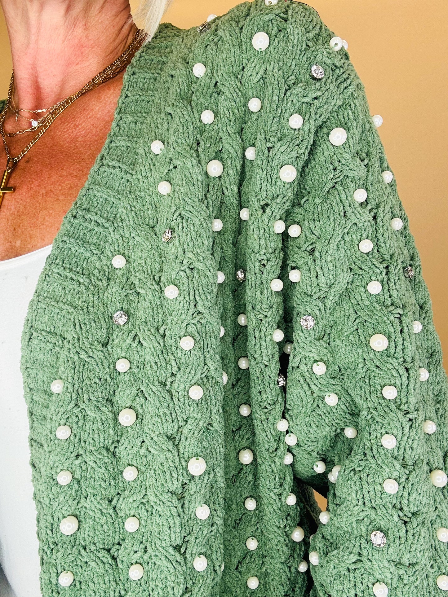 Cozy meets chic in this open-knit cardigan adorned with pearl and gem embellishments. The textured design and scattered pearls give it a timeless, elegant touch—perfect for dressing up a holiday outfit or adding sparkle to your everyday look. With its relaxed fit and soft knit, this cardigan layers effortlessly over dresses, blouses, or tees, making it a versatile piece you’ll reach for all season long.