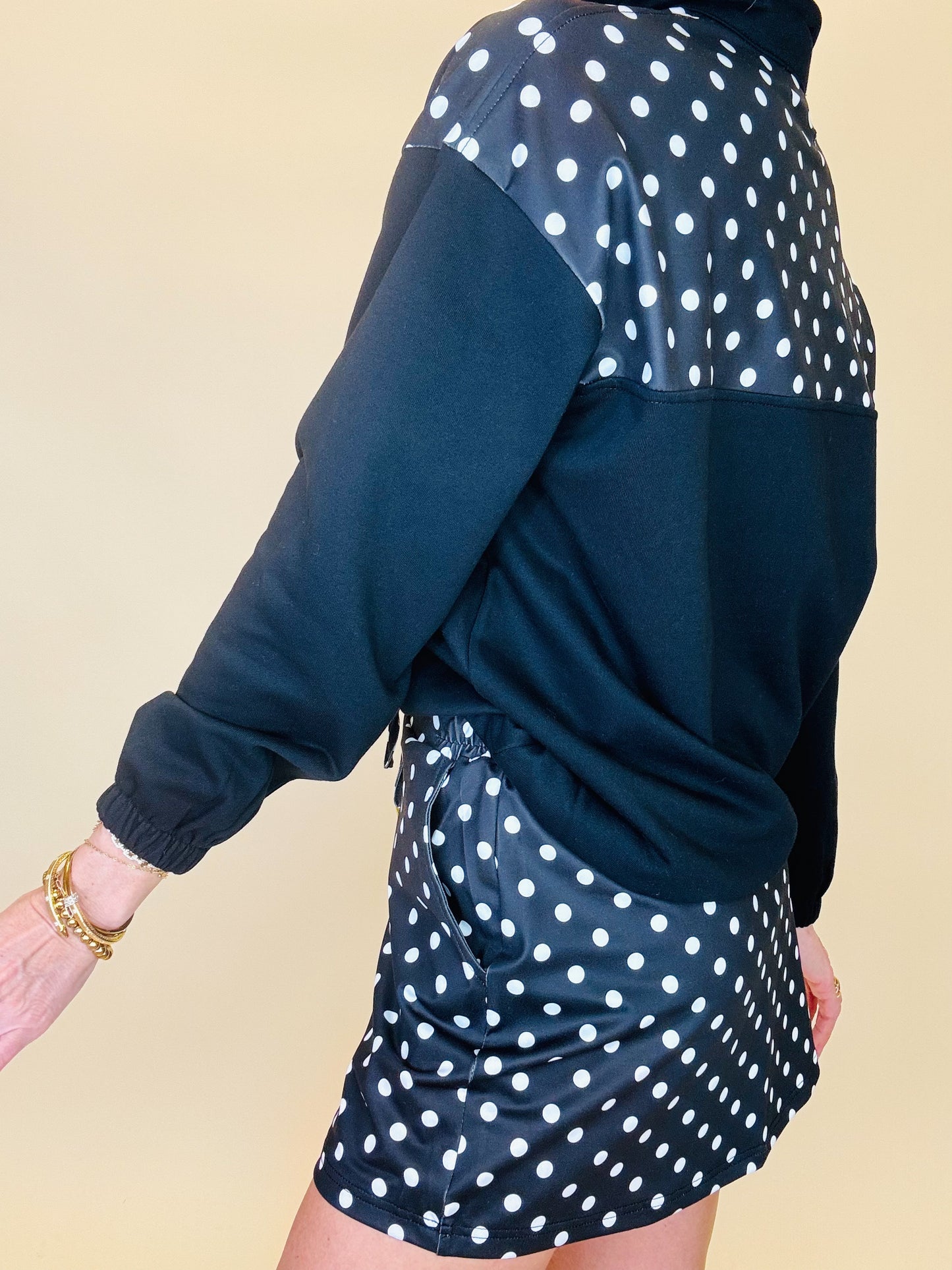 Rock a playful, trendy look with this Black Polka Dot Skort that blends comfort with contemporary style. The lightweight fabric keeps you cool while the elastic back waistband and integrated shorts provide all-day wearability. Functional side pockets and an adjustable drawstring make this piece as practical as it is fun!