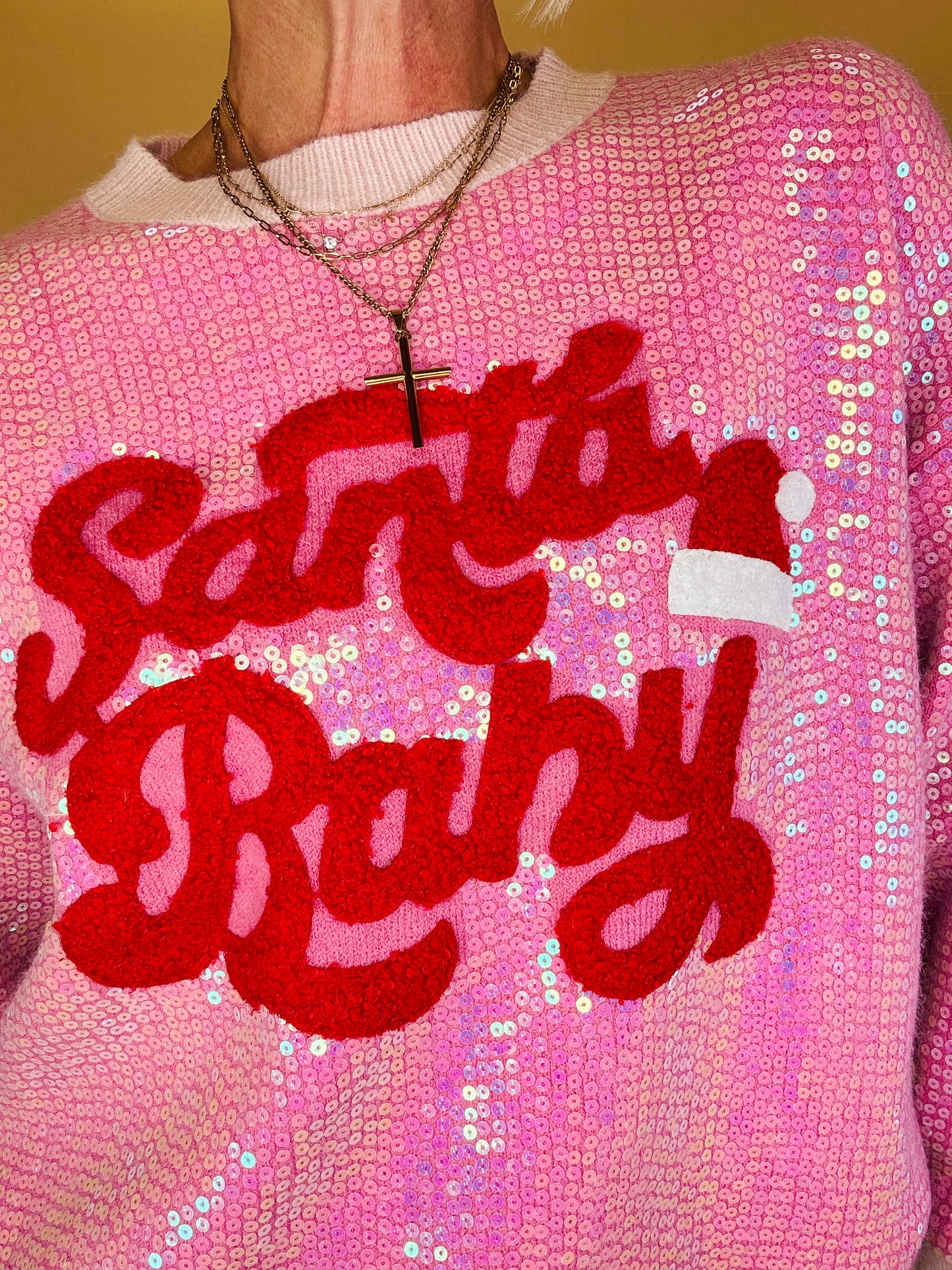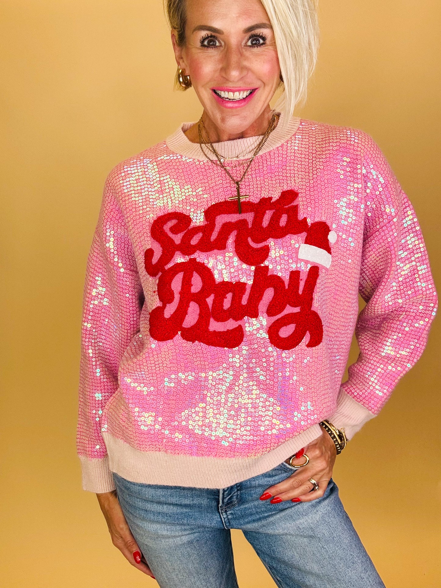 Make spirits bright in this glamorous Santa Baby sweater, decked out in all-over sequins for a festive shimmer that shines from every angle. The bold chenille lettering and playful Santa hat detail add a touch of holiday charm, while the cozy knit keeps you comfy and chic. Available in both mint and pink, it’s the perfect statement piece for holiday parties, girls’ nights, or anytime you’re ready to sleigh the season in style.