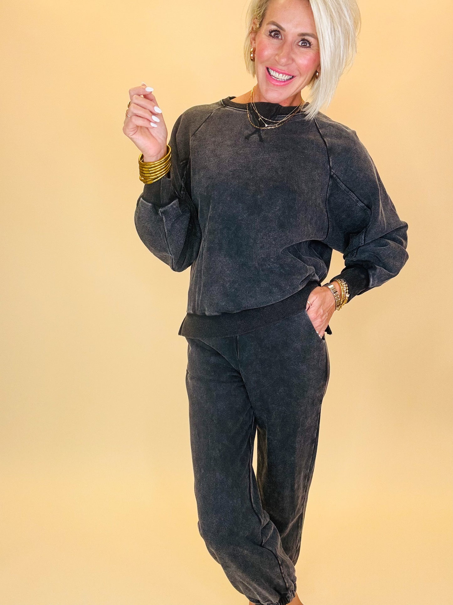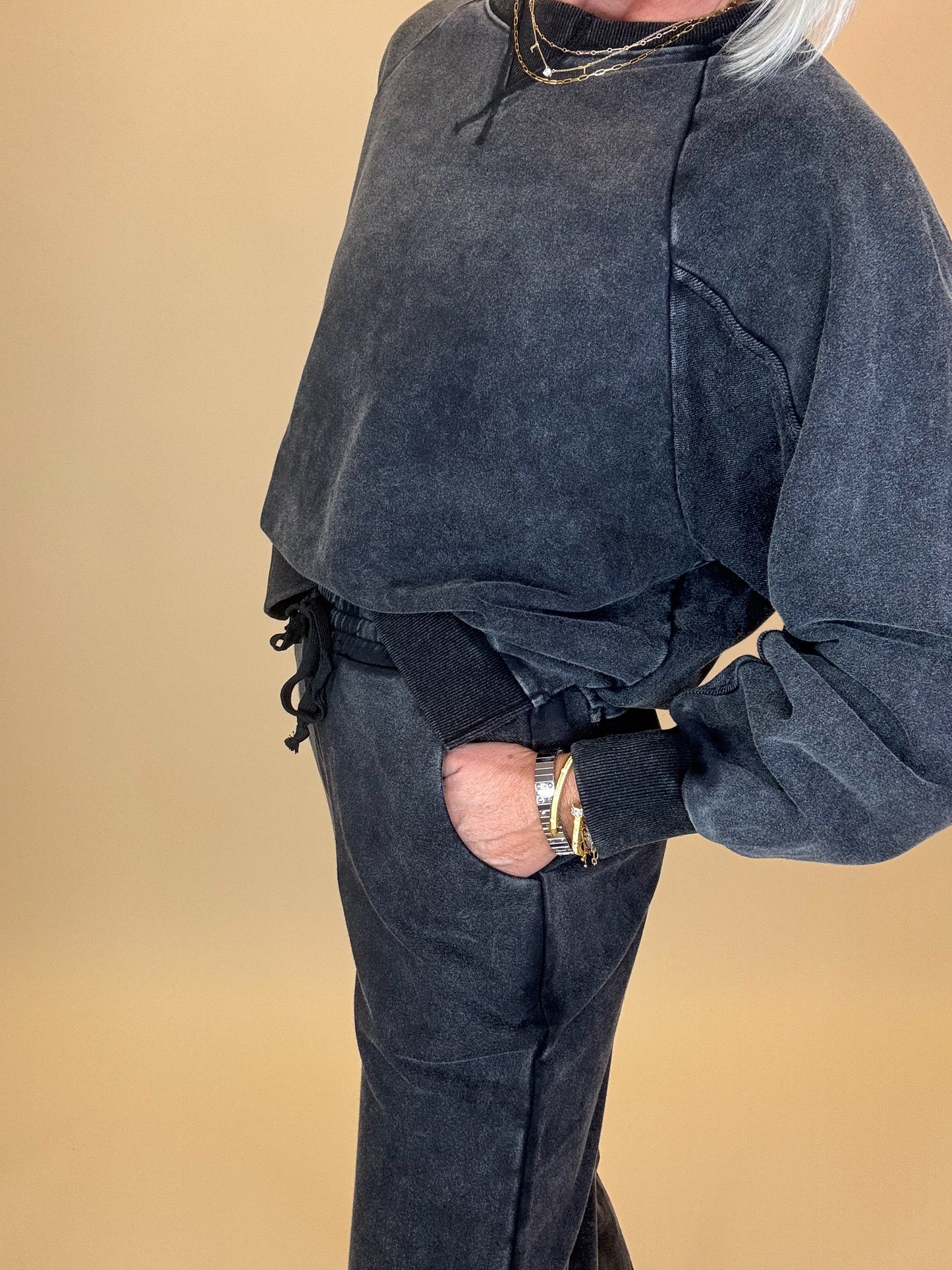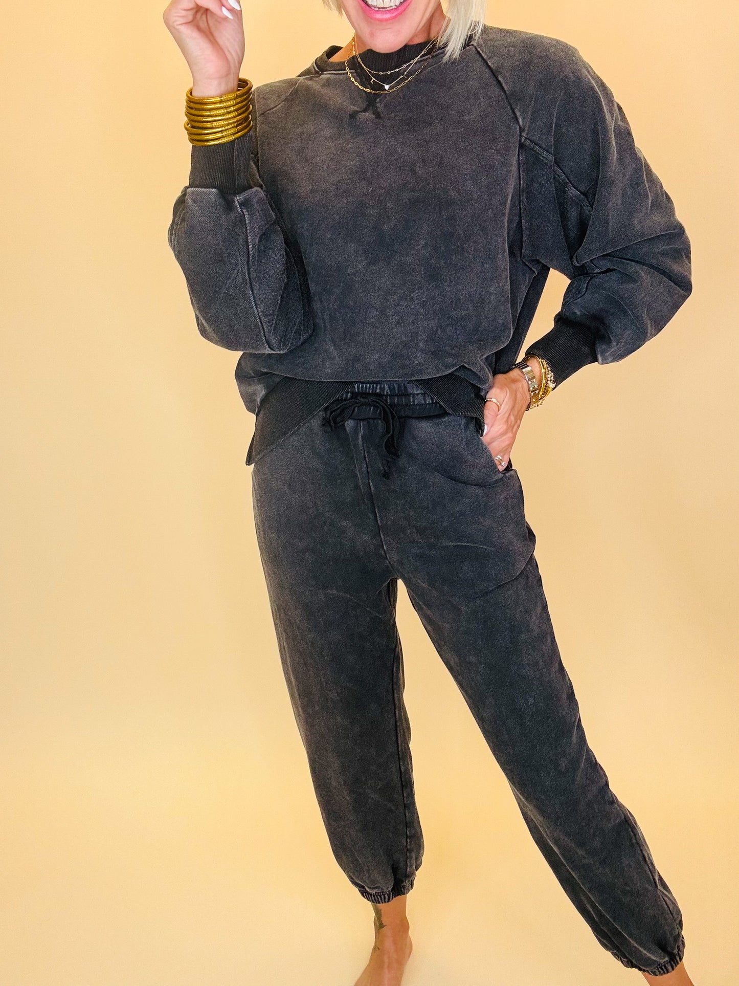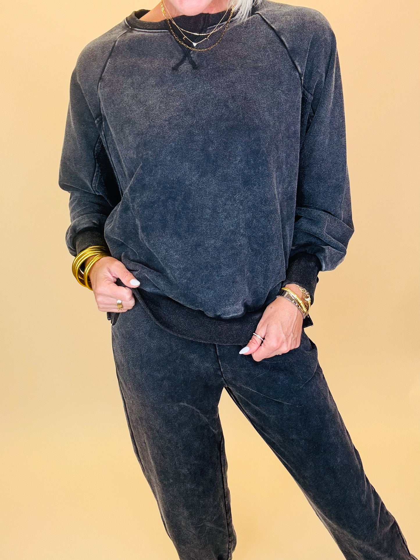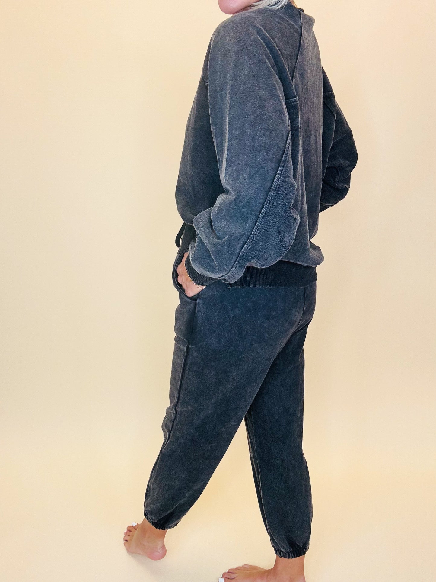 Comfy never looked this cool. This washed black lounge set features a relaxed crewneck sweatshirt and matching joggers with an effortlessly lived-in vibe. Designed with a mineral wash finish, it gives that perfect vintage edge while staying soft and cozy for everyday wear. Whether you’re lounging at home, running errands, or grabbing coffee with friends, this set is your go-to for laid-back style with a trendy twist.