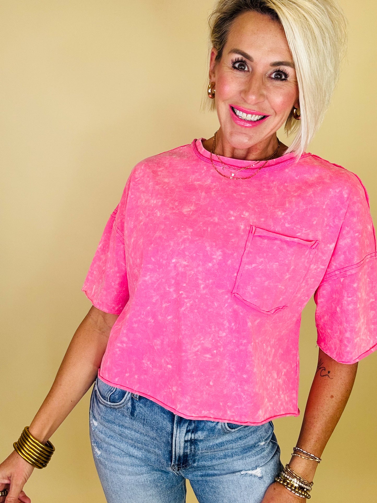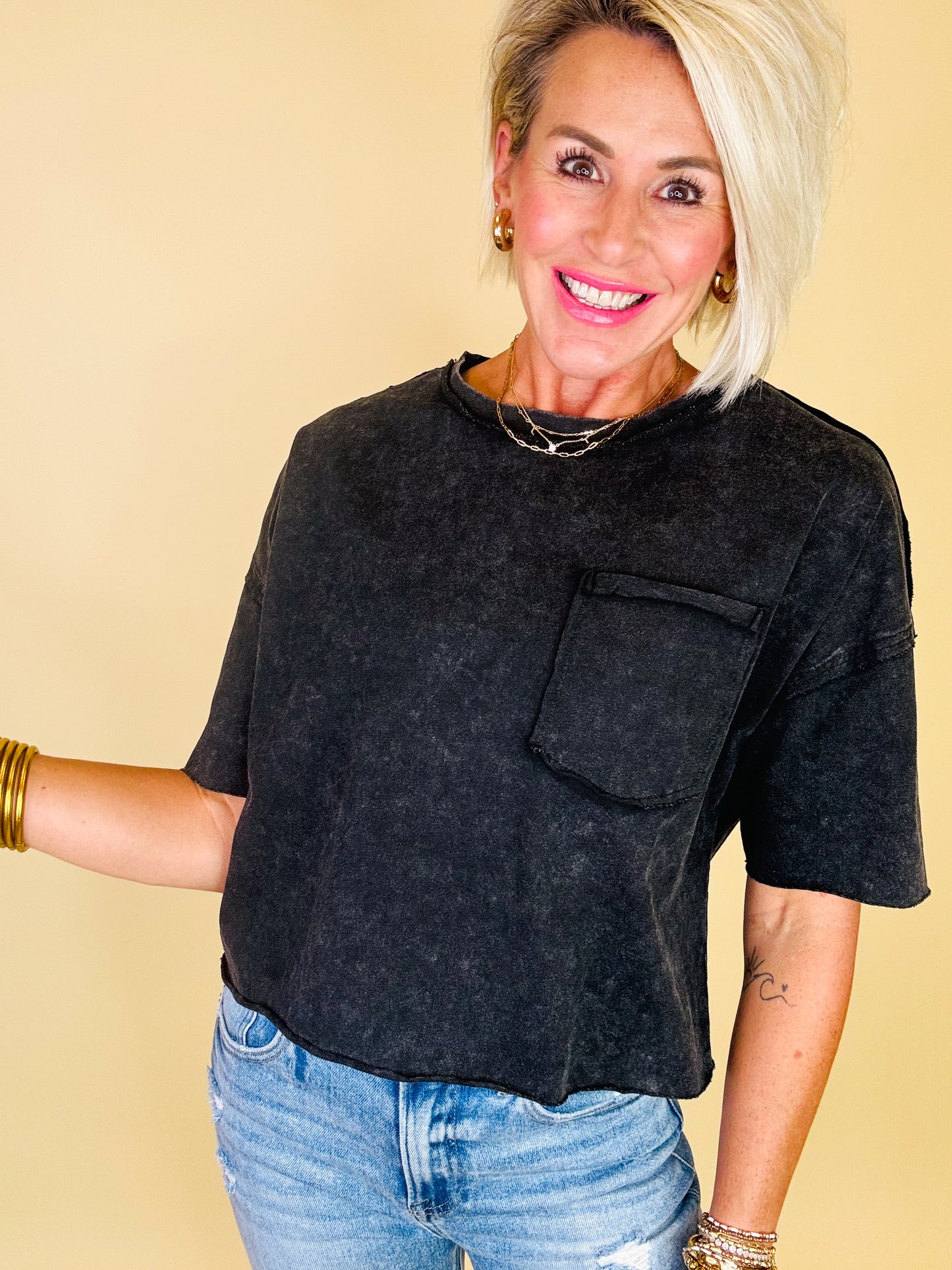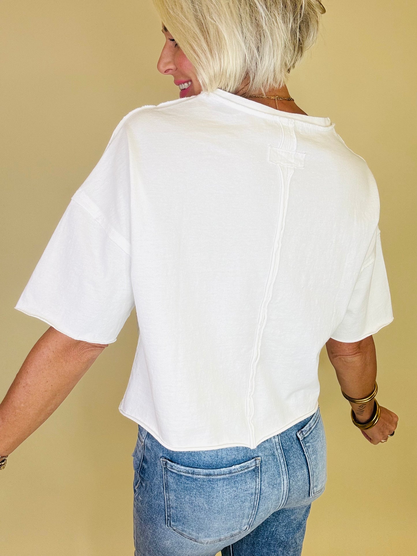 The perfect washed cotton, boyfriend tee that everyone needs! Features a raw, pocket and seam detailing on the back!