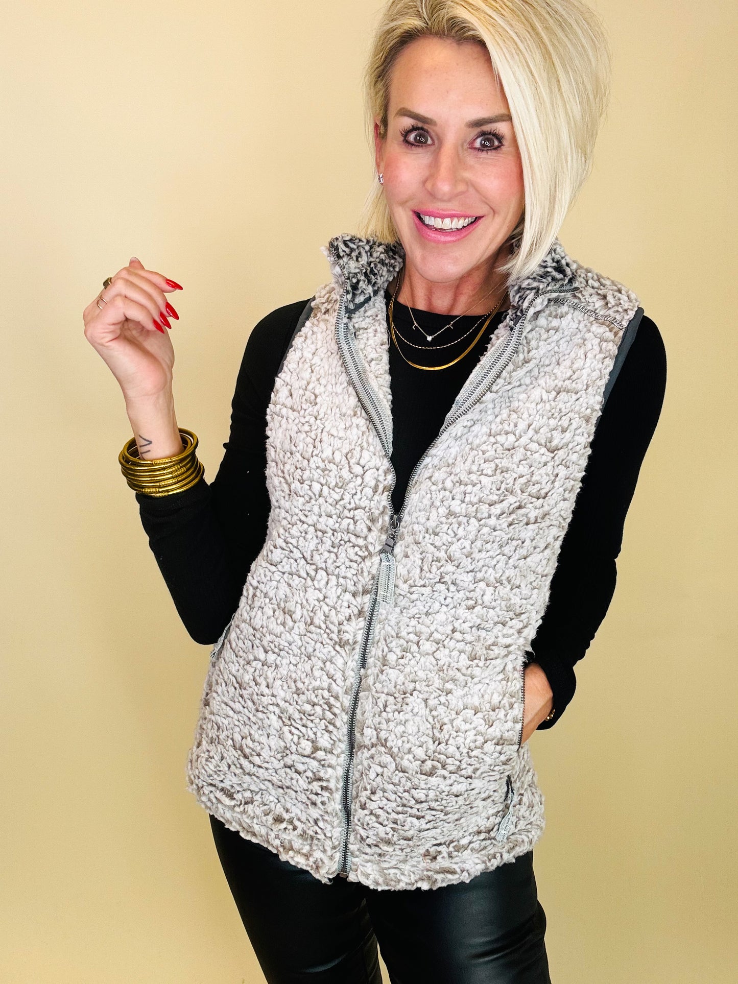 The cutest sherpa vest perfect for layering up with your favorite flannels or ls bodysuits or tees this fall/winter! Not heavy at all , great fit and so soft!