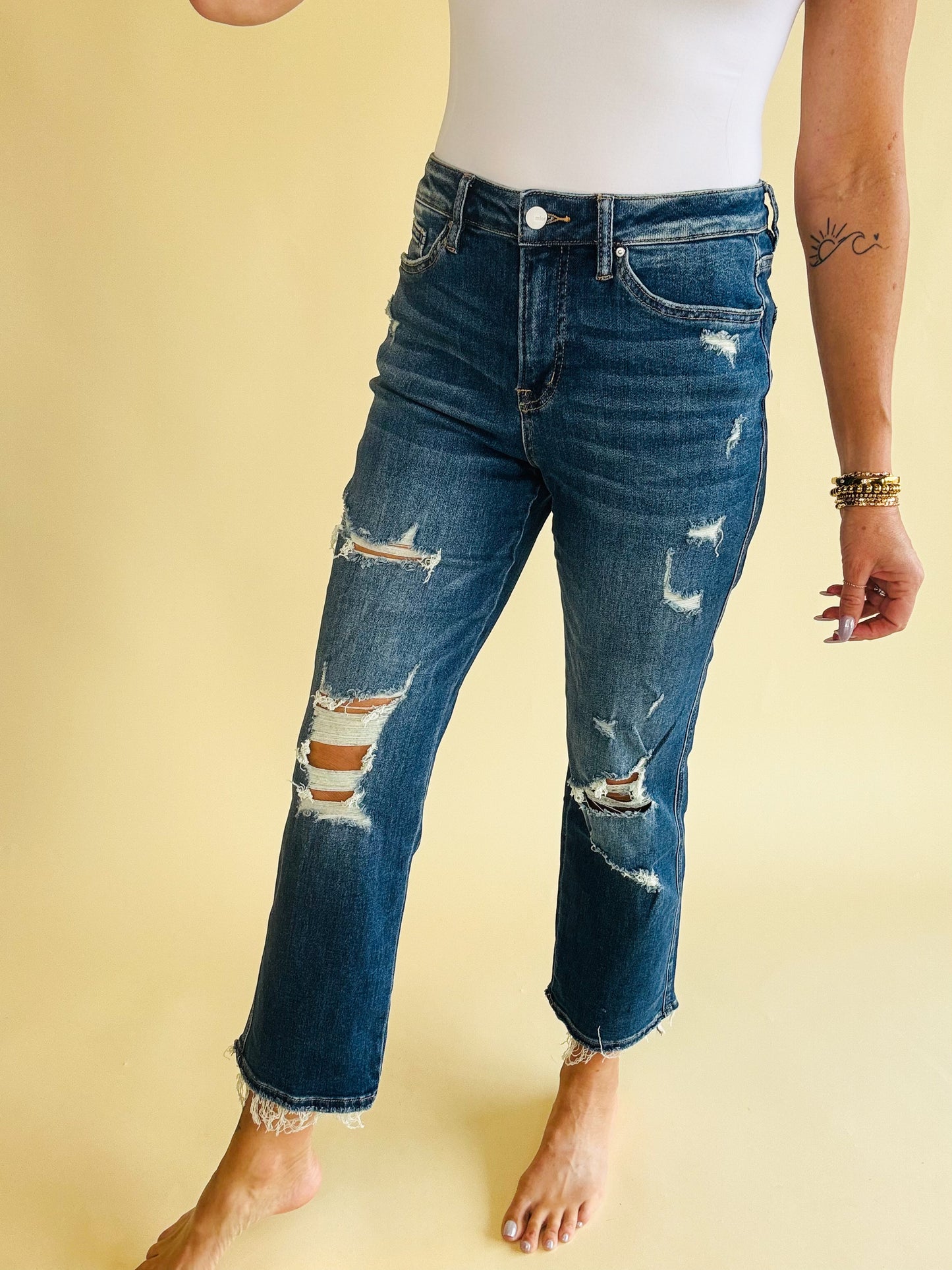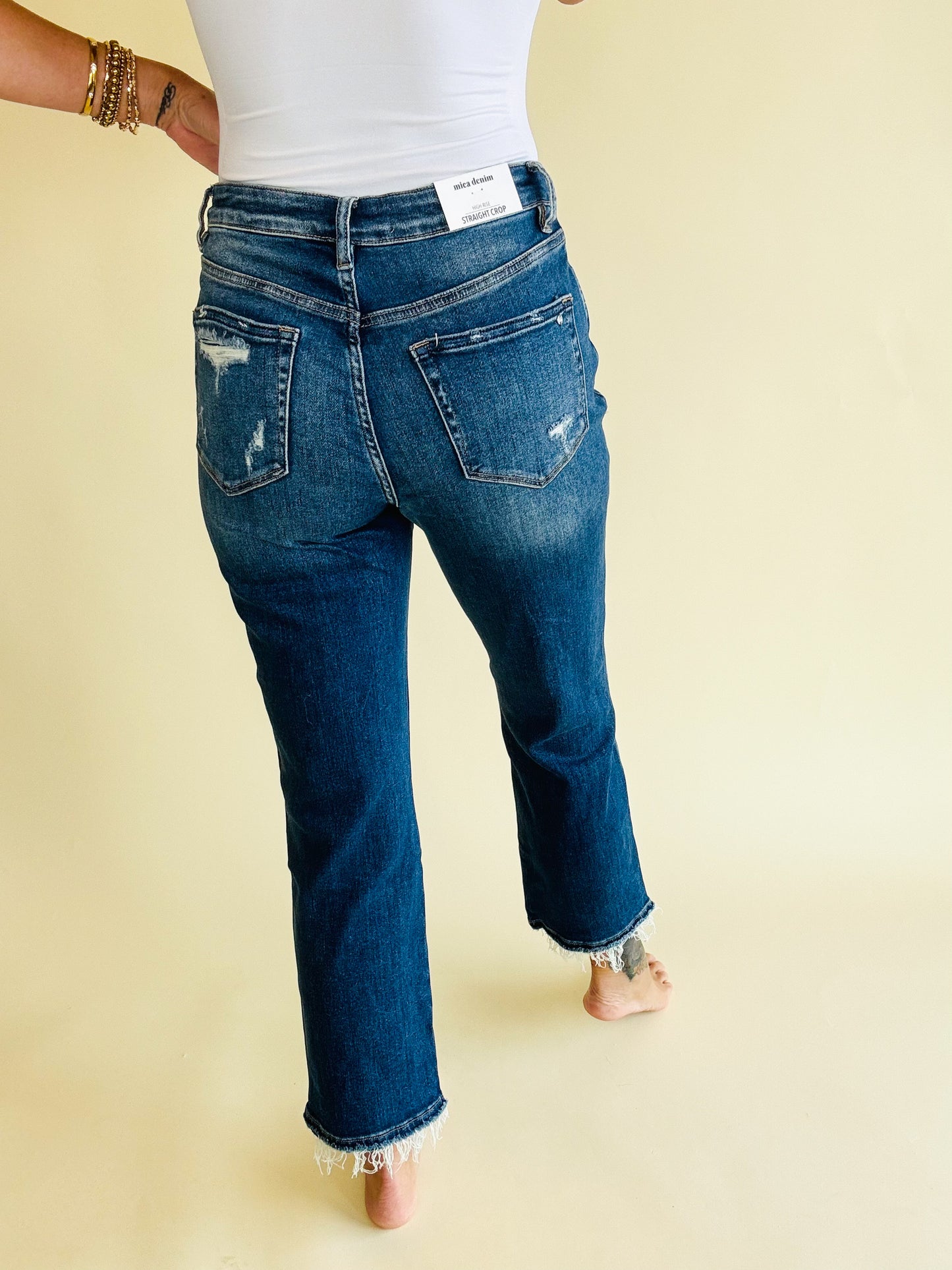 Dark distressed denim with straight cropped style and great stretch! Perfect for sneakers this fall/winter!