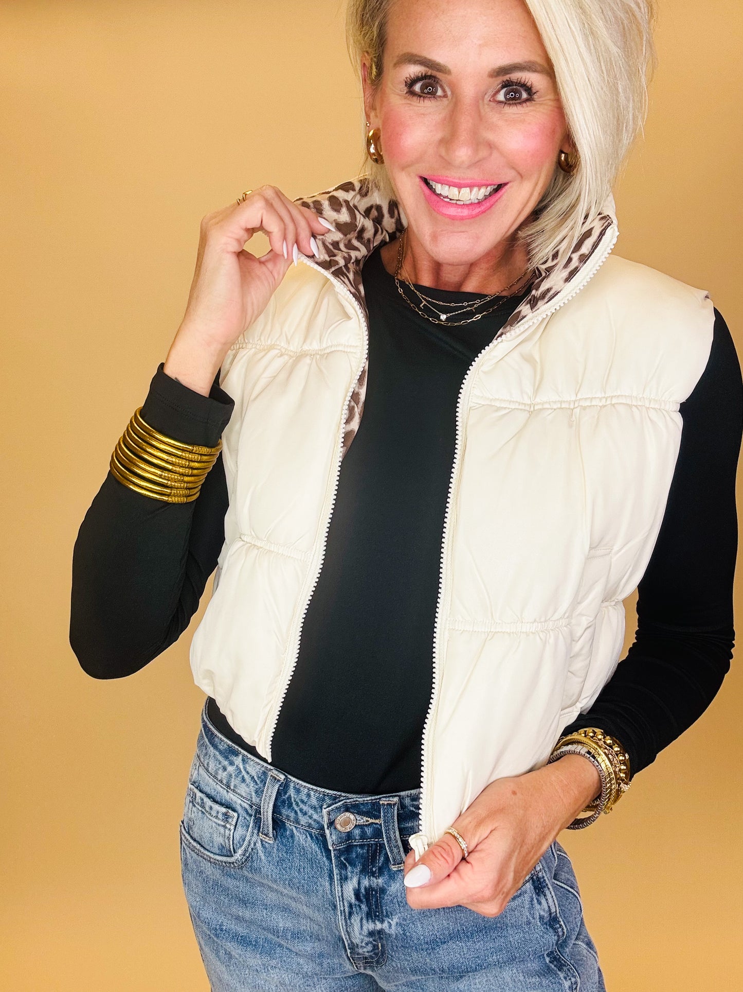 This reversible puffer vest brings two looks in one chic piece. On one side, brown, black or cream quilted finish keeps it classic and versatile, while the reverse reveals a bold leopard print for a fun, statement-making twist. Designed with a zip-front closure and a lightweight, cozy fit, it’s perfect for layering over sweaters, long sleeves, or hoodies. Whether you’re keeping it neutral or showing off your wild side, this vest is the ultimate mix of function and fashion for fall and winter styling.