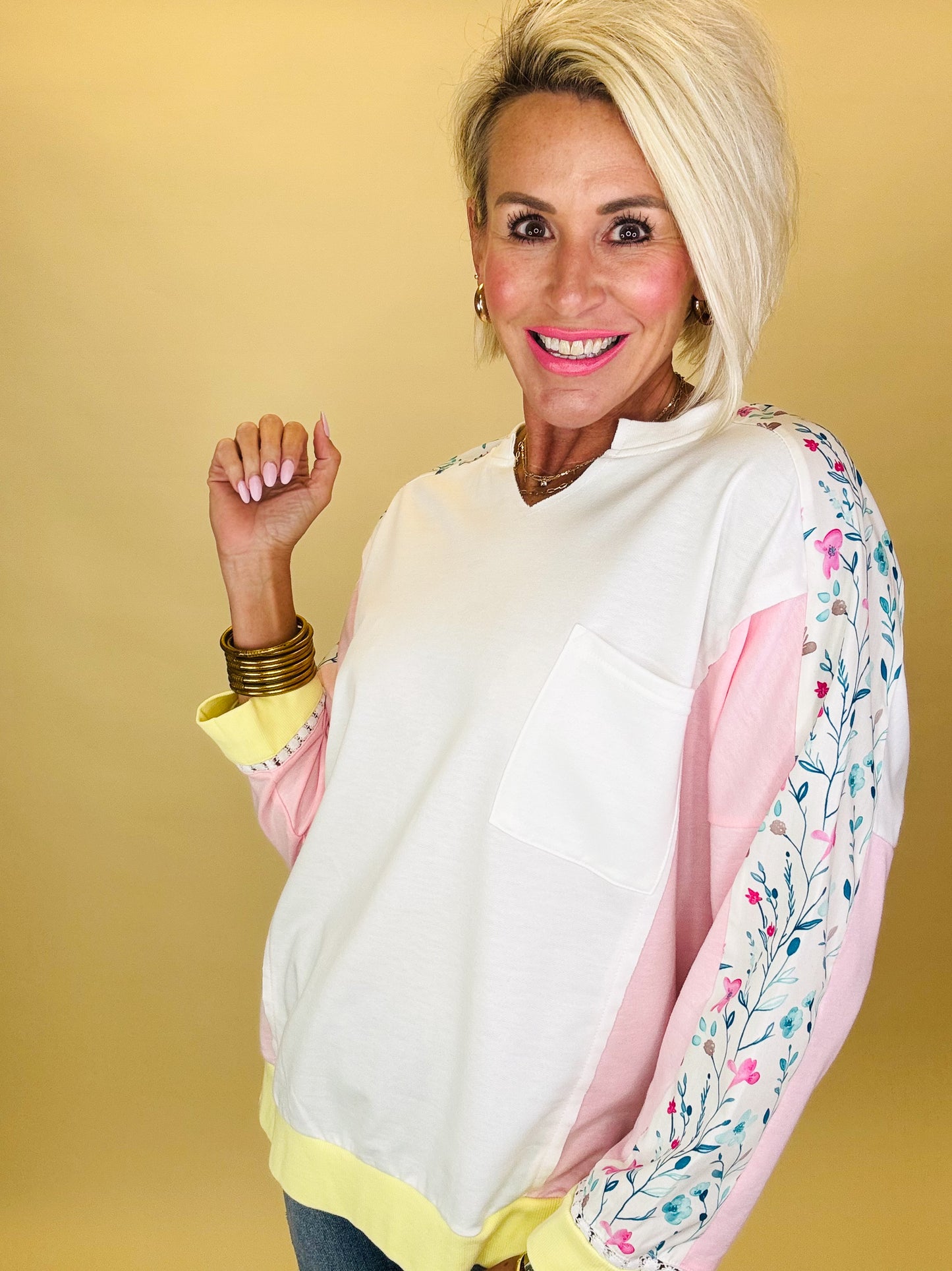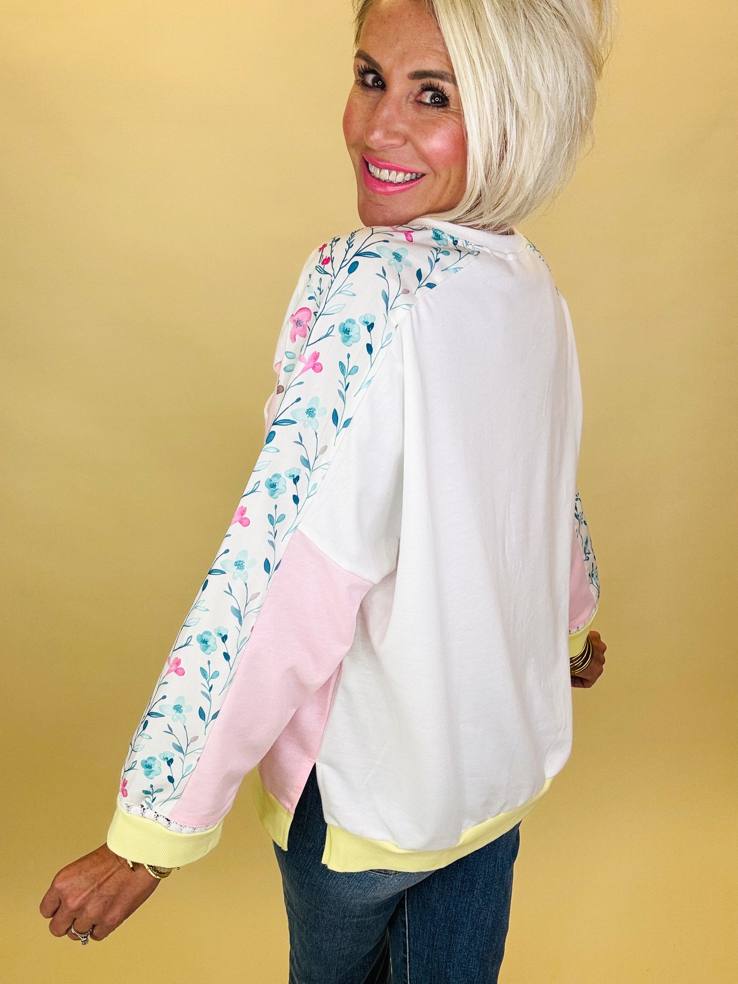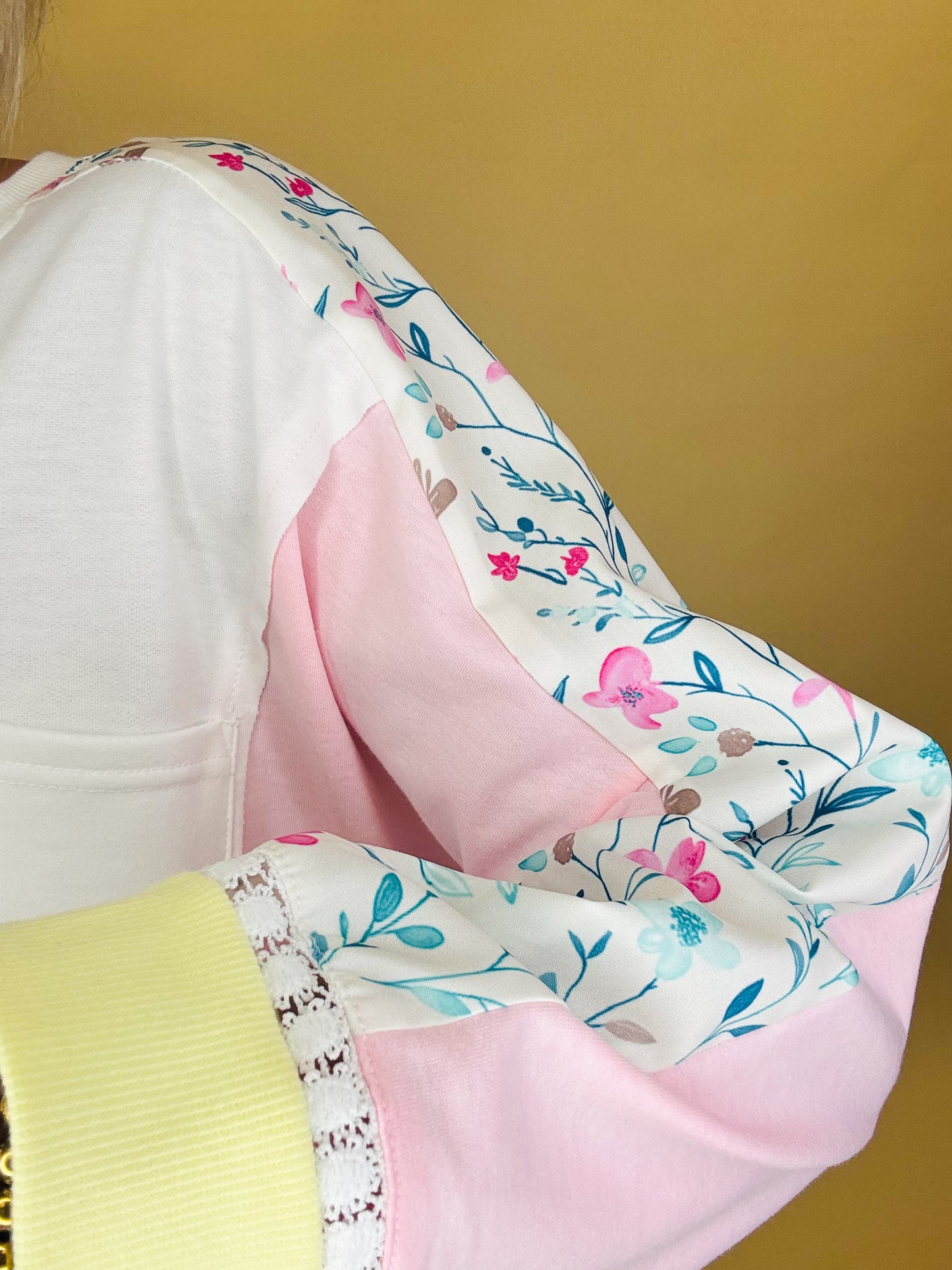 Bright, playful, and oh-so-fresh — this pullover is giving us all the vibes! With soft pastel color blocking, a comfy relaxed fit, and sleeves detailed with whimsical floral prints, it’s the perfect blend of cozy and cute. The contrast yellow cuffs and hem add just the right pop of sunshine to your look.