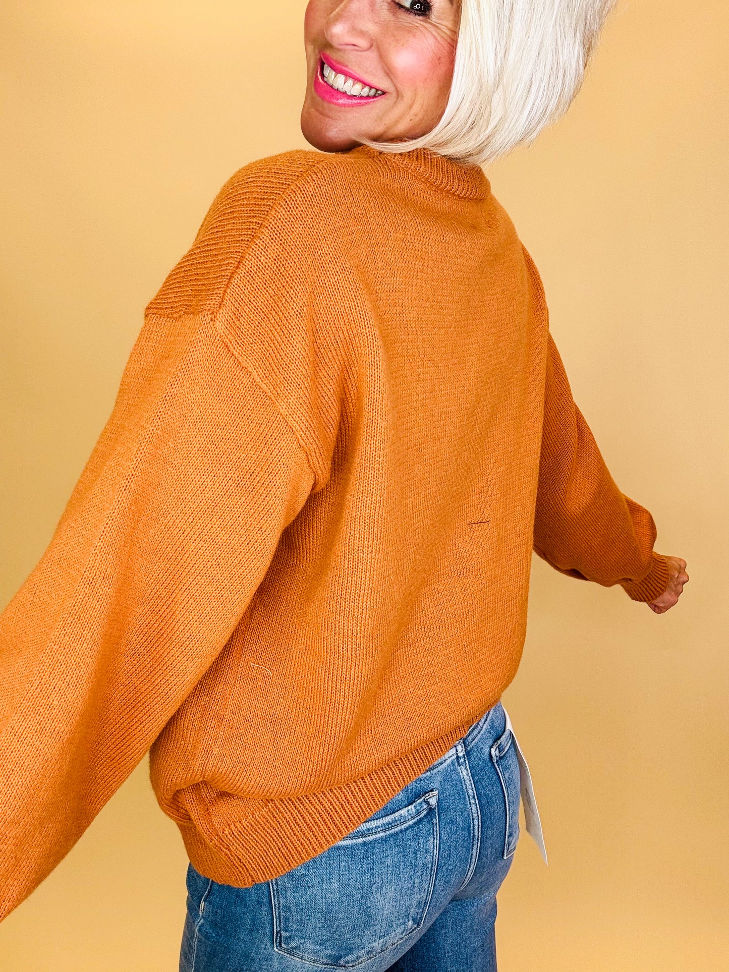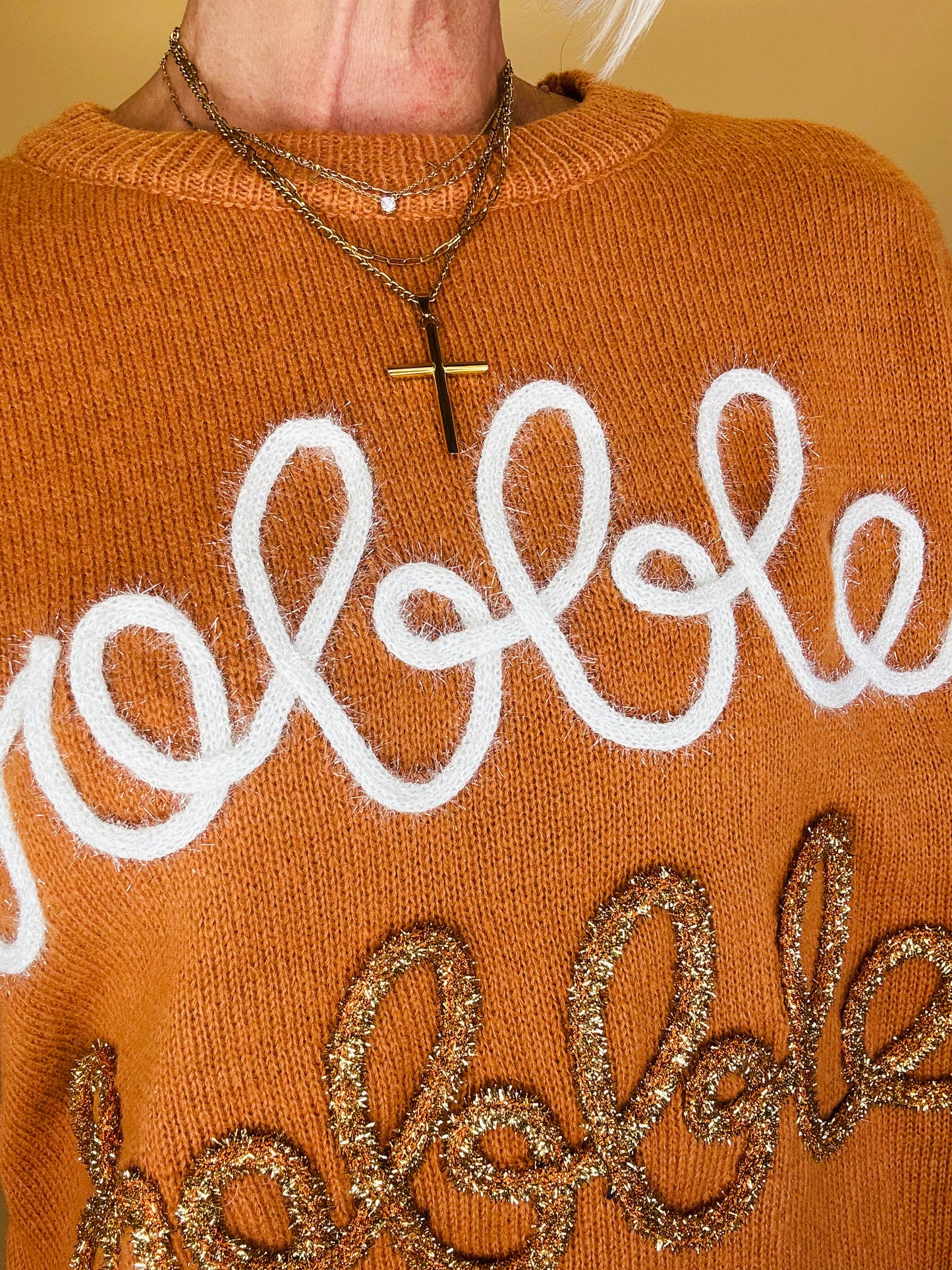 This festive sweater is Thanksgiving-ready with a playful twist. Crafted in a warm pumpkin spice hue, it features the word “gobble gobble” embroidered across the front in bold textured script—white on top and sparkling gold on bottom for a fun, eye-catching contrast. With its cozy knit fabric, ribbed neckline, cuffs, and hem, this sweater is perfect for holiday gatherings, family dinners, or just celebrating the season in comfort and style.