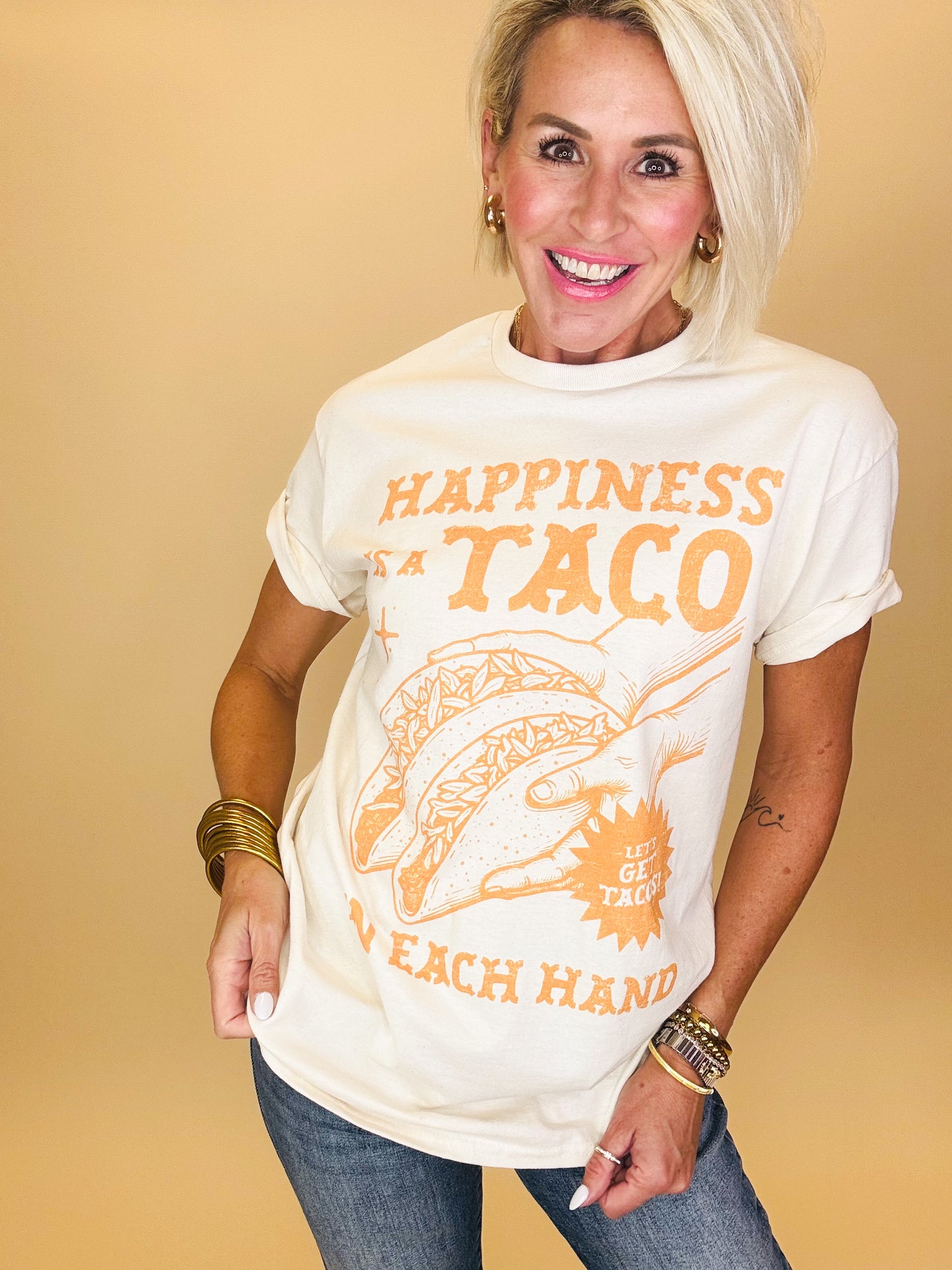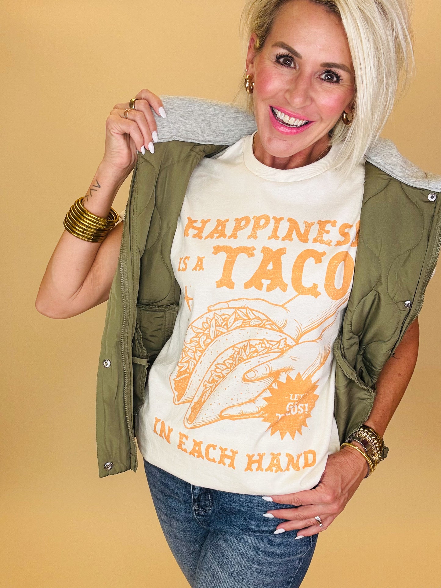 - “Happiness is a Taco in Each Hand” graphic with taco illustration