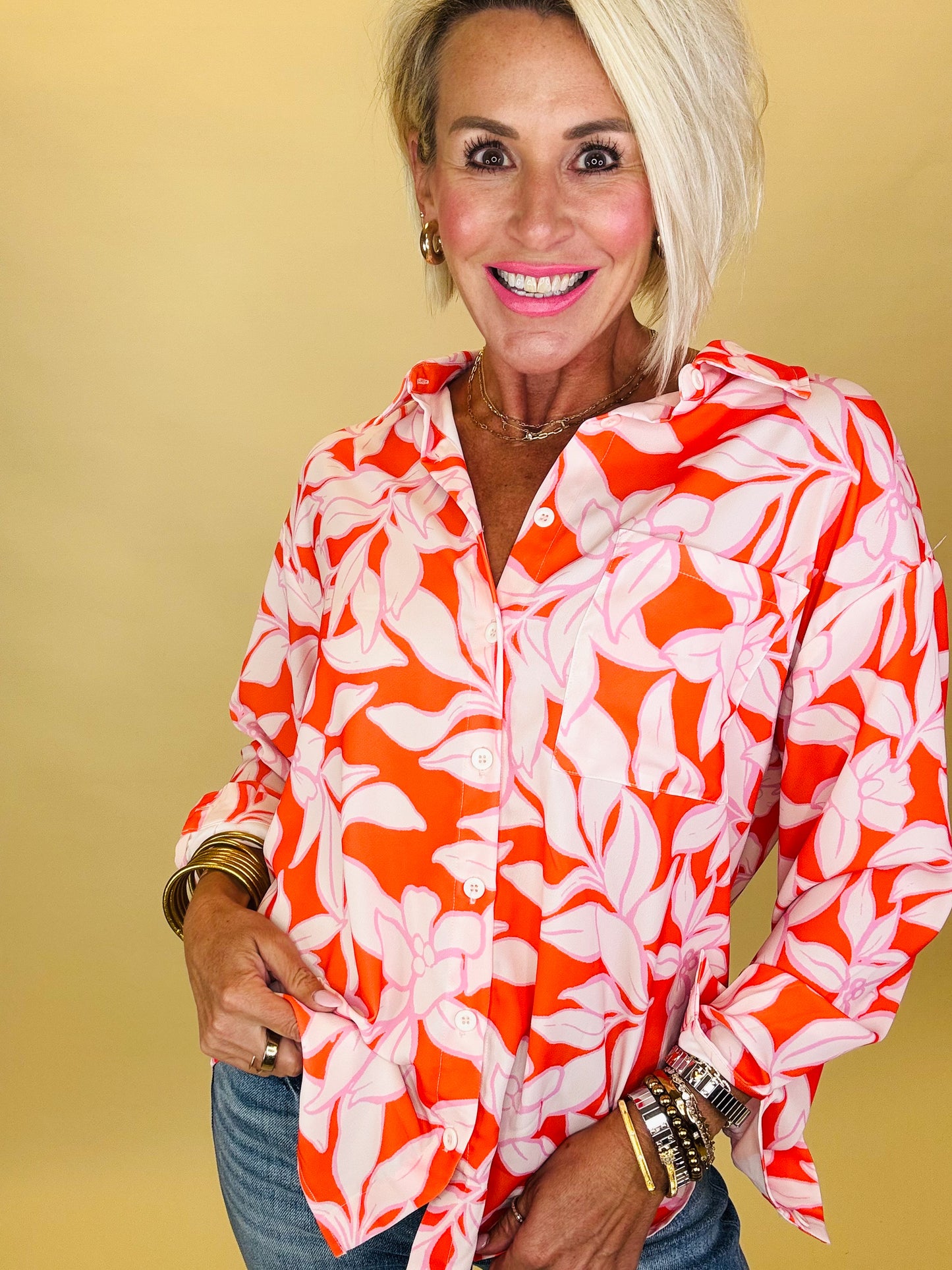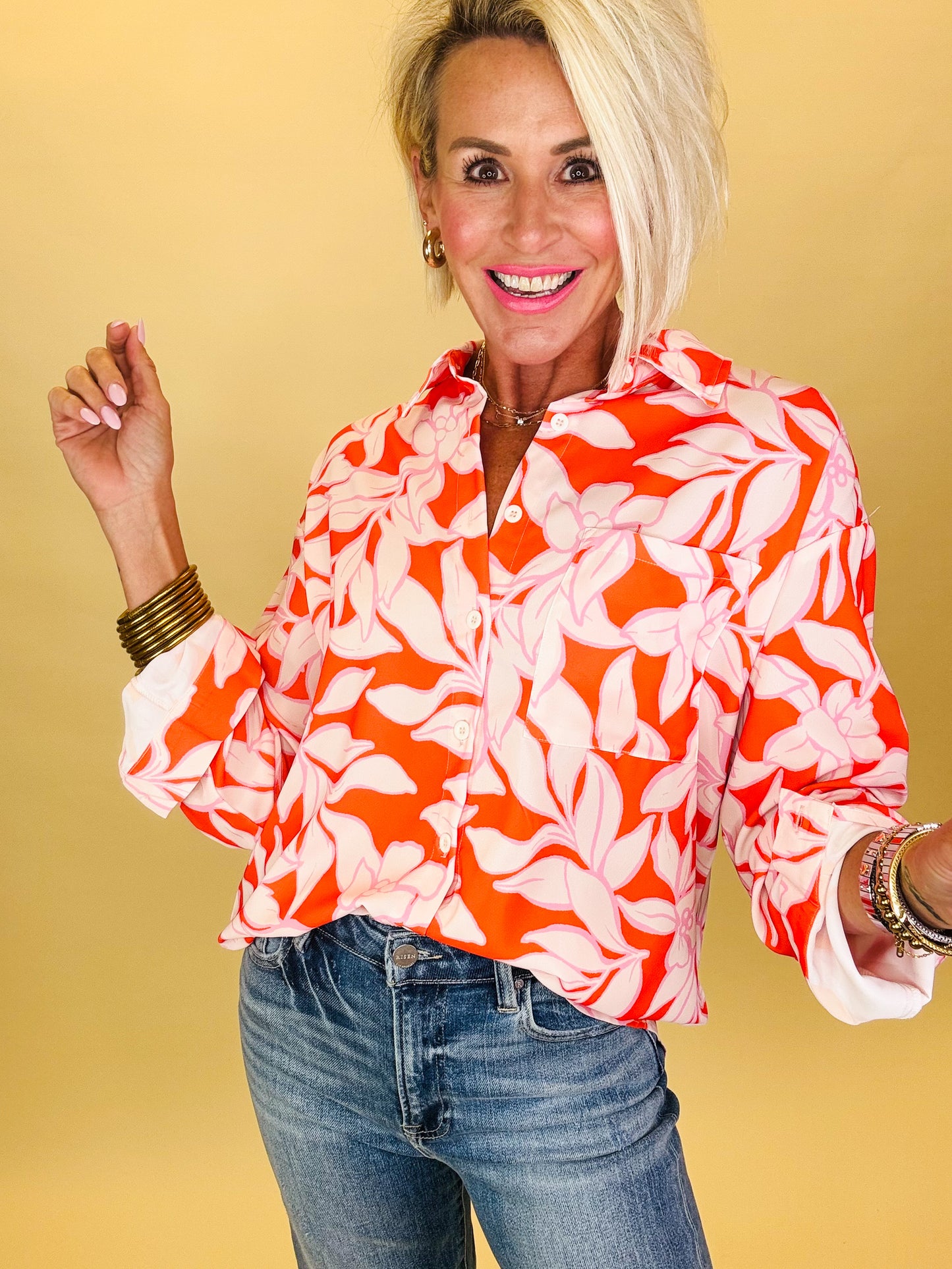 Fall in love with bold color and playful charm in the Maple Kiss Top. Featuring a vibrant mix of fiery orange and soft blush petals, this button-down brings the energy of autumn leaves in full bloom. Its relaxed fit makes it effortlessly chic—perfect for pairing with denim by day or dressing up for a cozy fall night out