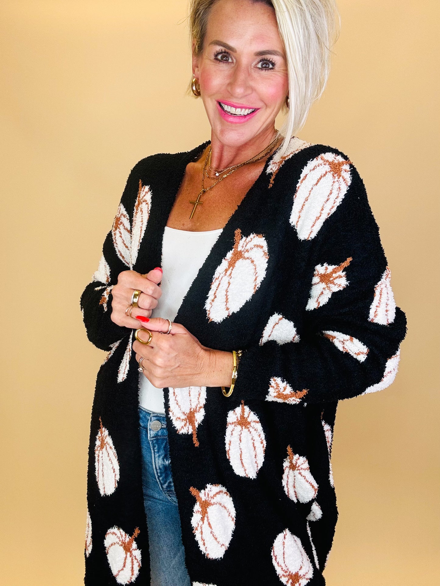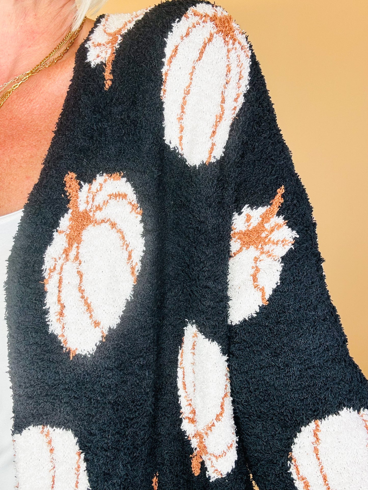 Wrap yourself in festive comfort with this pumpkin-patterned cardigan. Designed in a soft, plush knit, it features an open-front silhouette that drapes effortlessly for a relaxed and cozy fit. The black backdrop makes the playful ivory-and-caramel pumpkins pop, giving it just the right mix of chic and seasonal charm. Perfect for layering over tees, tanks, or dresses, this cardigan will be your go-to piece for pumpkin patch outings, Thanksgiving gatherings, or simply curling up on a crisp fall night.
