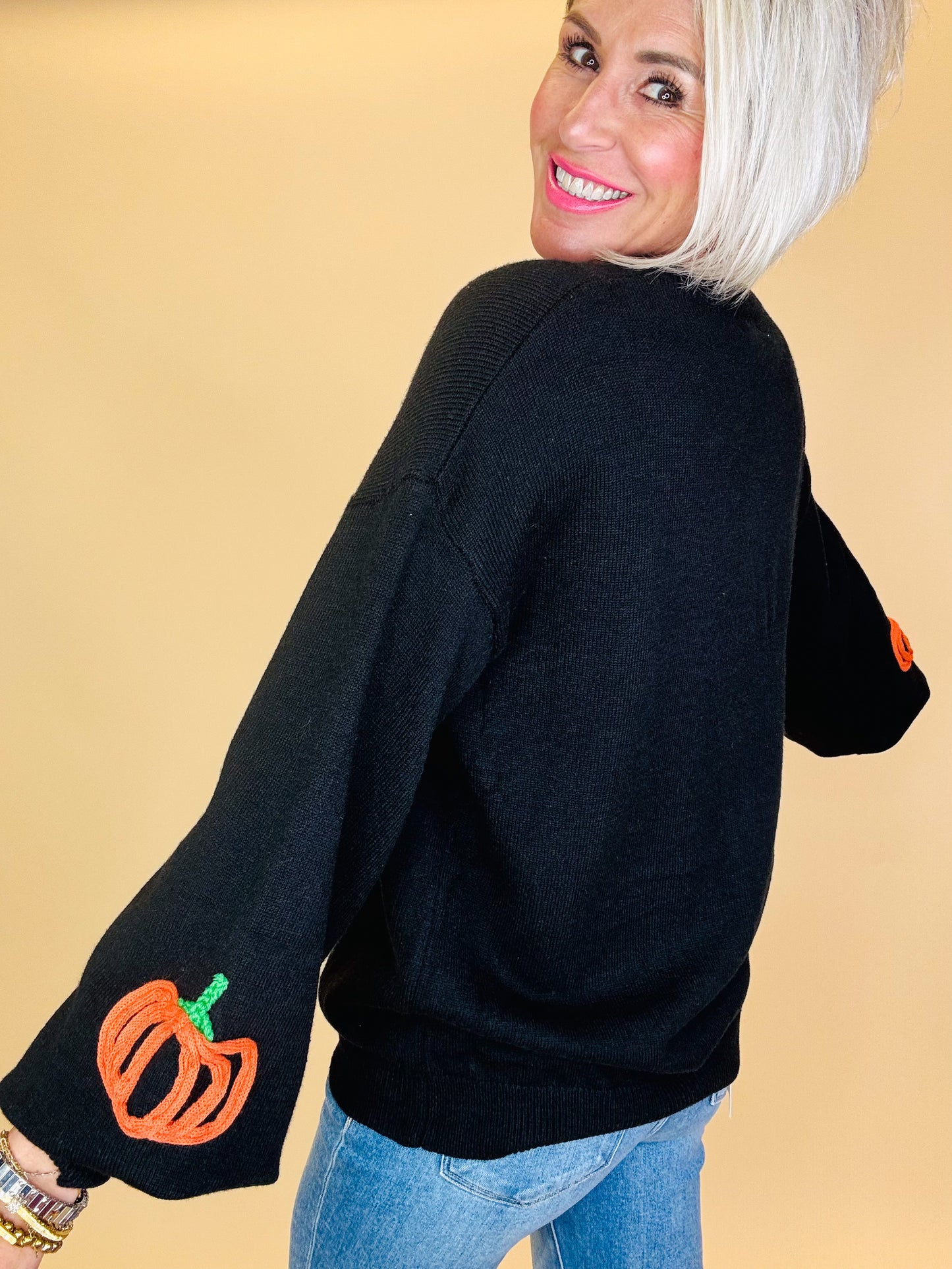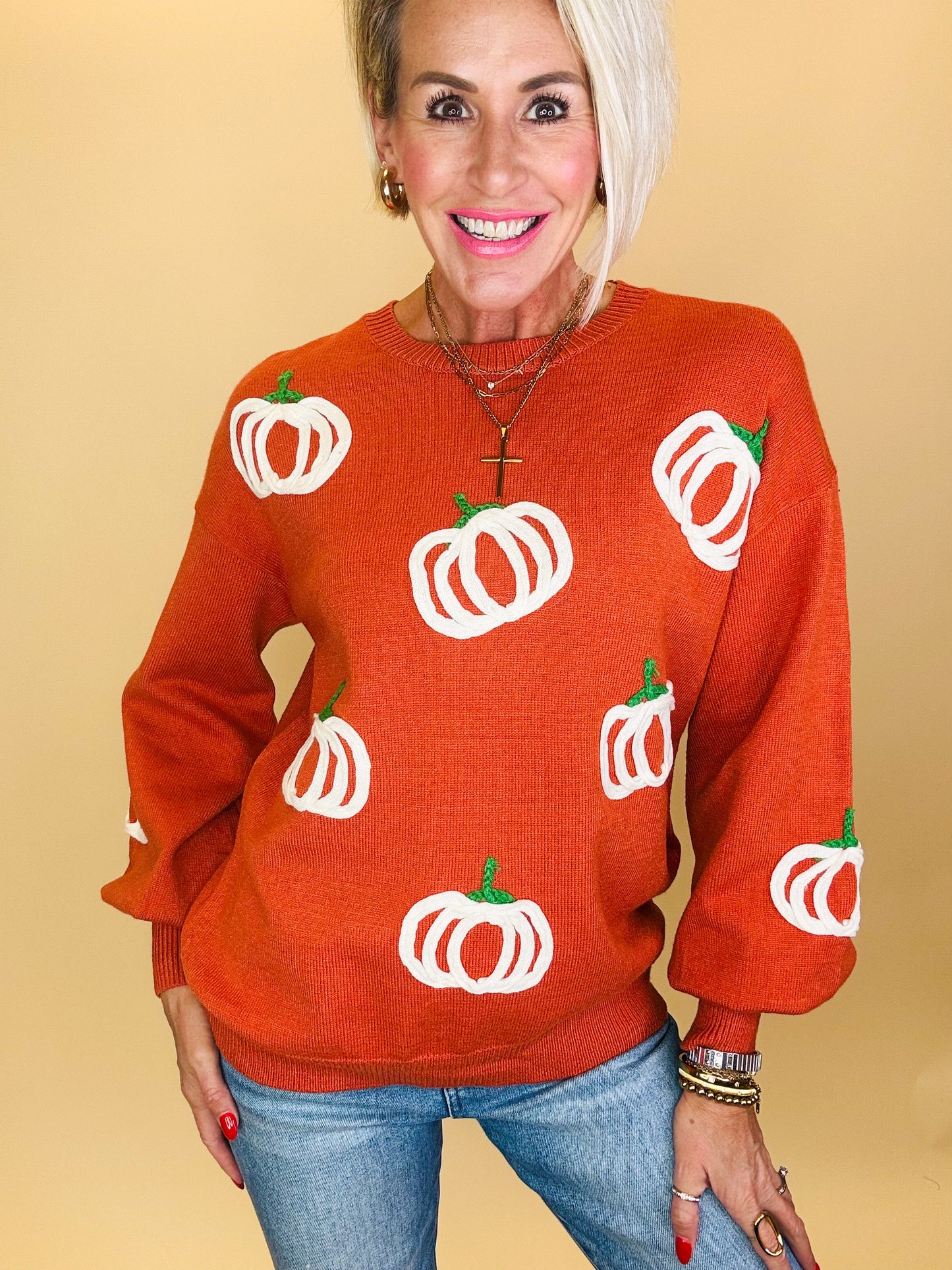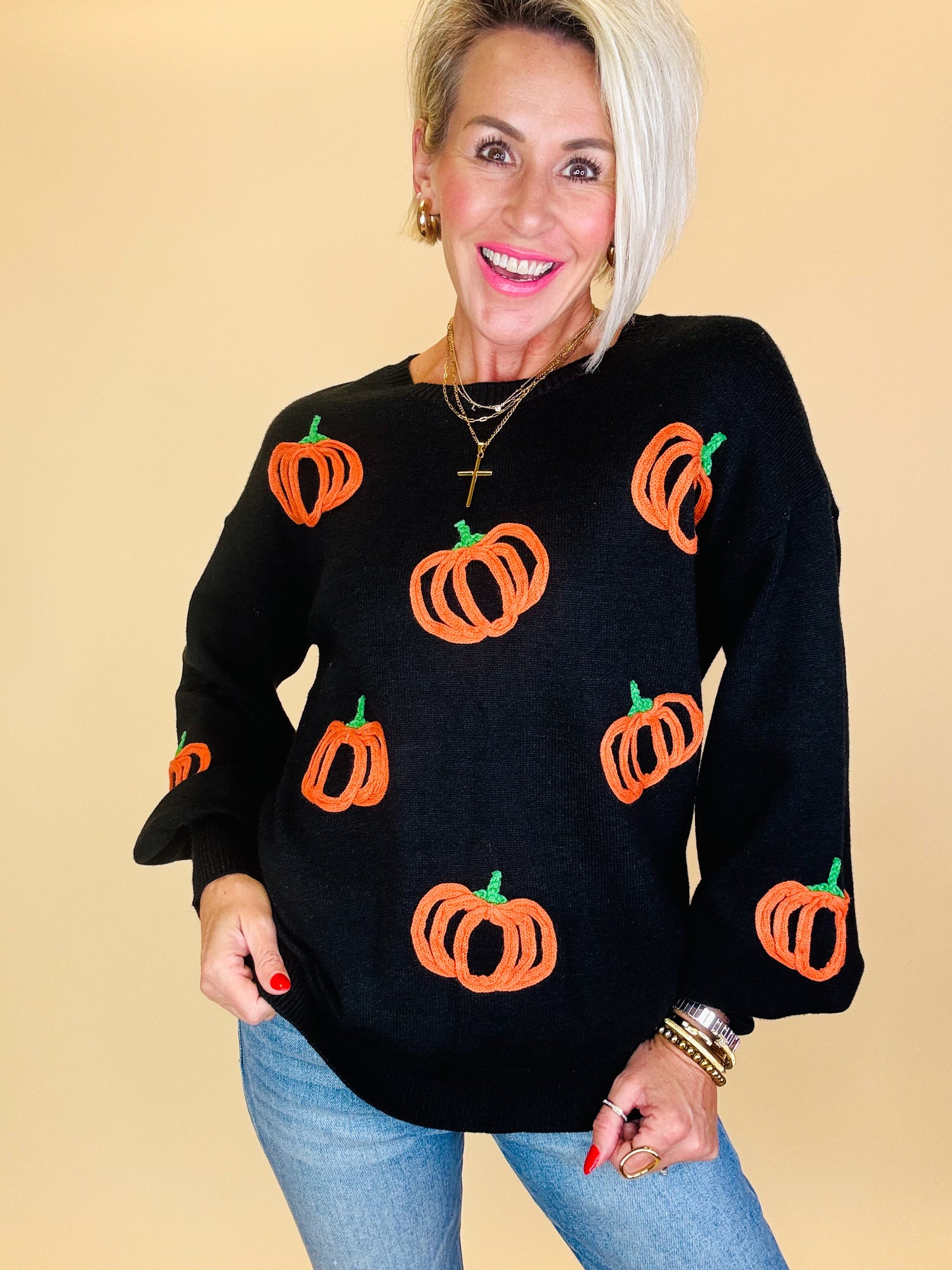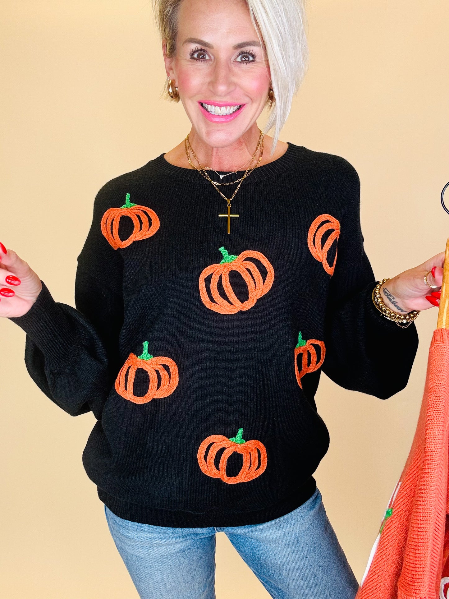 Celebrate sweater weather with a playful twist! The Pumpkin Patch Pullover is a cozy knit sweater sprinkled with cheerful embroidered pumpkins, bringing all the fall vibes wherever you go. Available in both classic black with bold orange pumpkins or rustic pumpkin spice with cream accents, this sweater is the perfect pick for pumpkin patch outings, fall festivals, or just sipping cider by the fire.