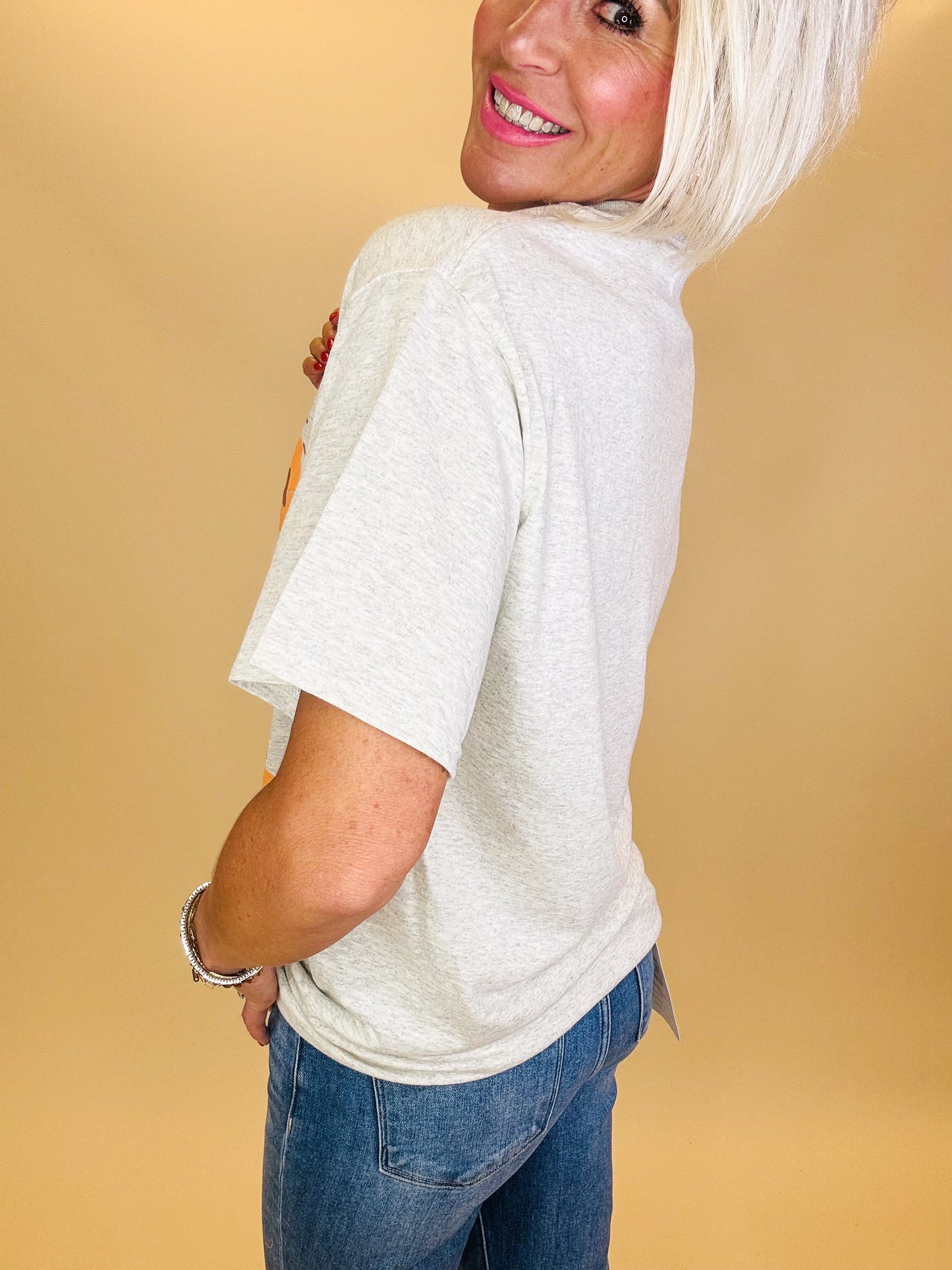 This heather gray tee celebrates fall in the most colorful way. The front showcases a bold graphic of overlapping pumpkin-inspired florals in vibrant shades of orange, plum, purple, magenta, and navy. Centered within a framed design, the words “PUMPKIN SEASON” complete the festive look. Made from soft cotton with a relaxed unisex fit, it’s the perfect tee for pumpkin patch outings, cozy layering, or simply showing off your love for autumn’s best season.