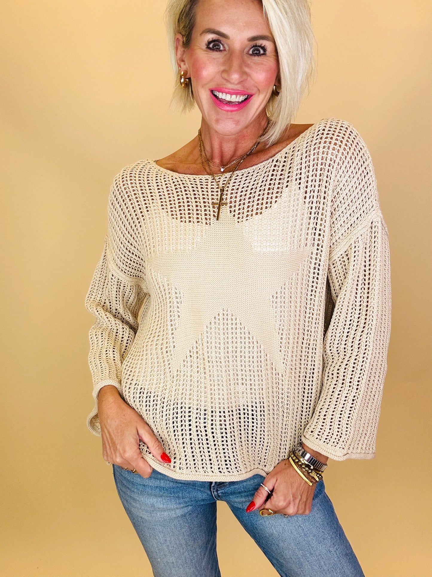 Shine bright in effortless style with the Starlight Breeze Sweater. This lightweight open-knit pullover features a relaxed fit with a bold star design woven into the front, giving it that laid-back yet standout vibe. The airy fabric makes it perfect for layering year-round—throw it over a tank with shorts on breezy summer nights or pair it with denim for cozy fall days. Chic, versatile, and just the right touch of playful charm.