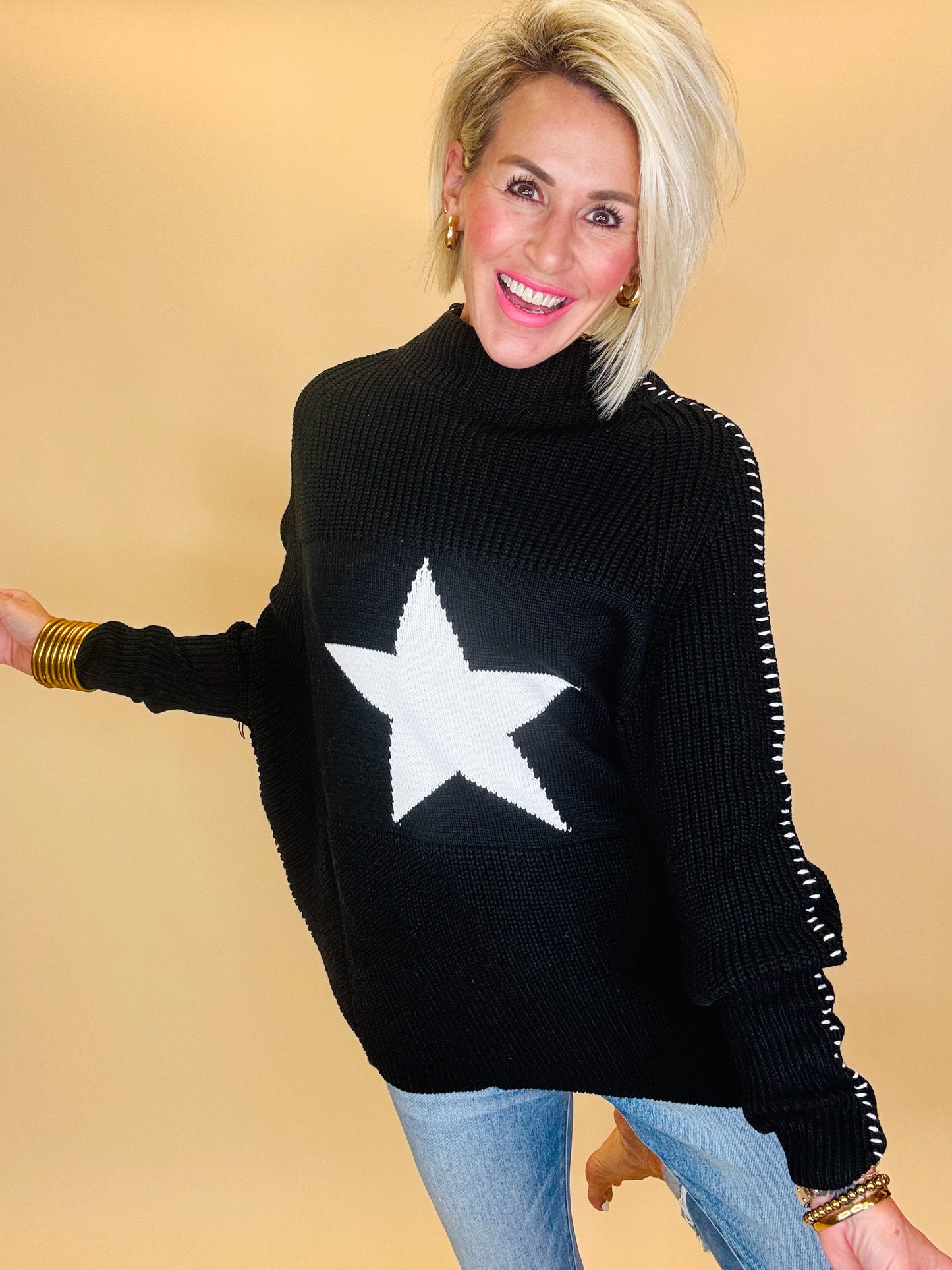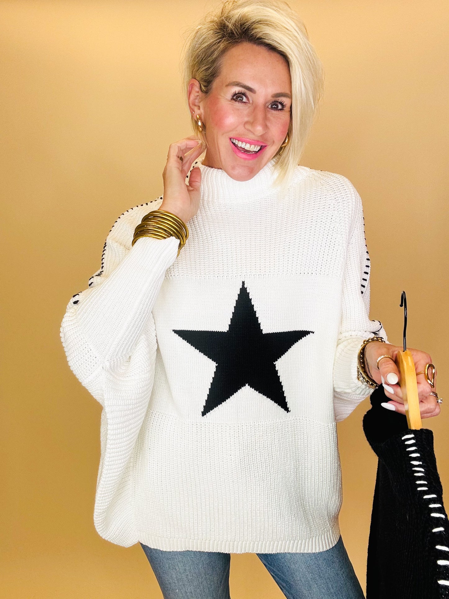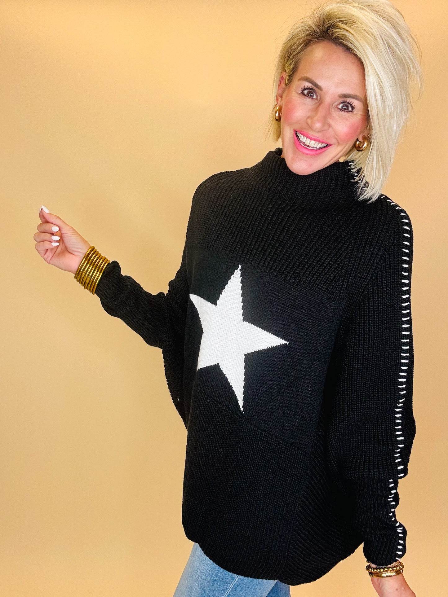 Make a statement without saying a word in the Starstruck Sweater. This cozy knit features a bold star across the front and playful contrast stitching along the shoulders and sleeves. With its relaxed fit and drop-shoulder design, it’s the perfect blend of laid-back comfort and standout style. Pair it with your favorite denim and boots for an effortlessly cool look that shines day or night.