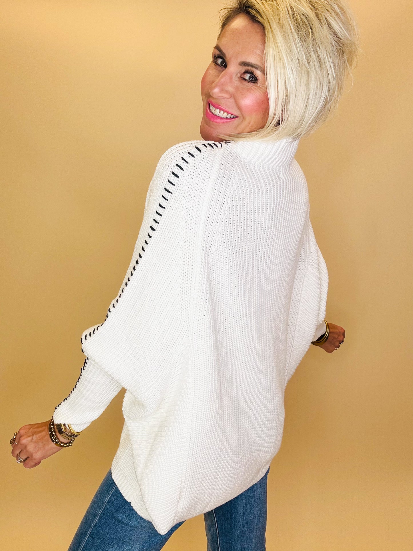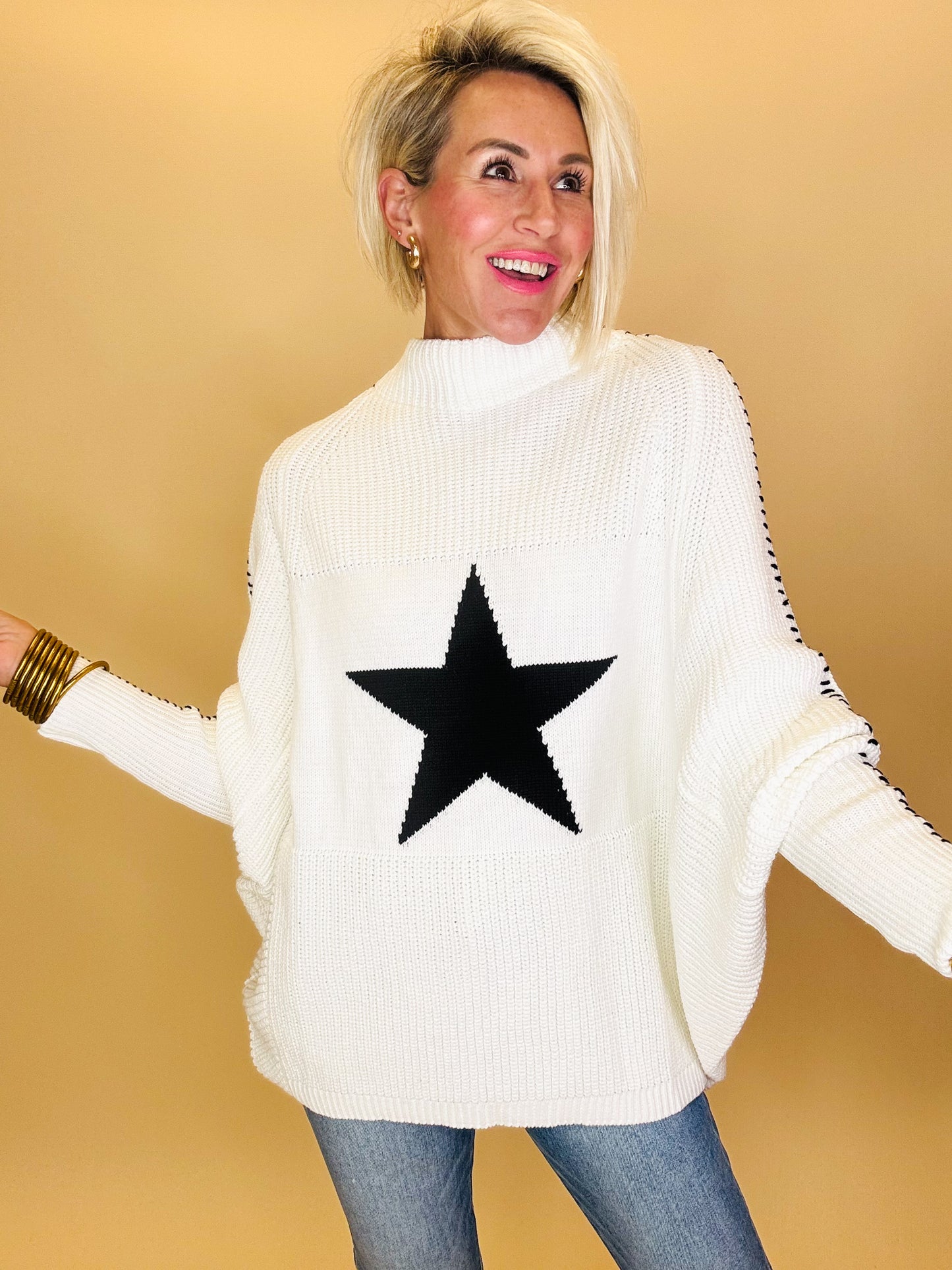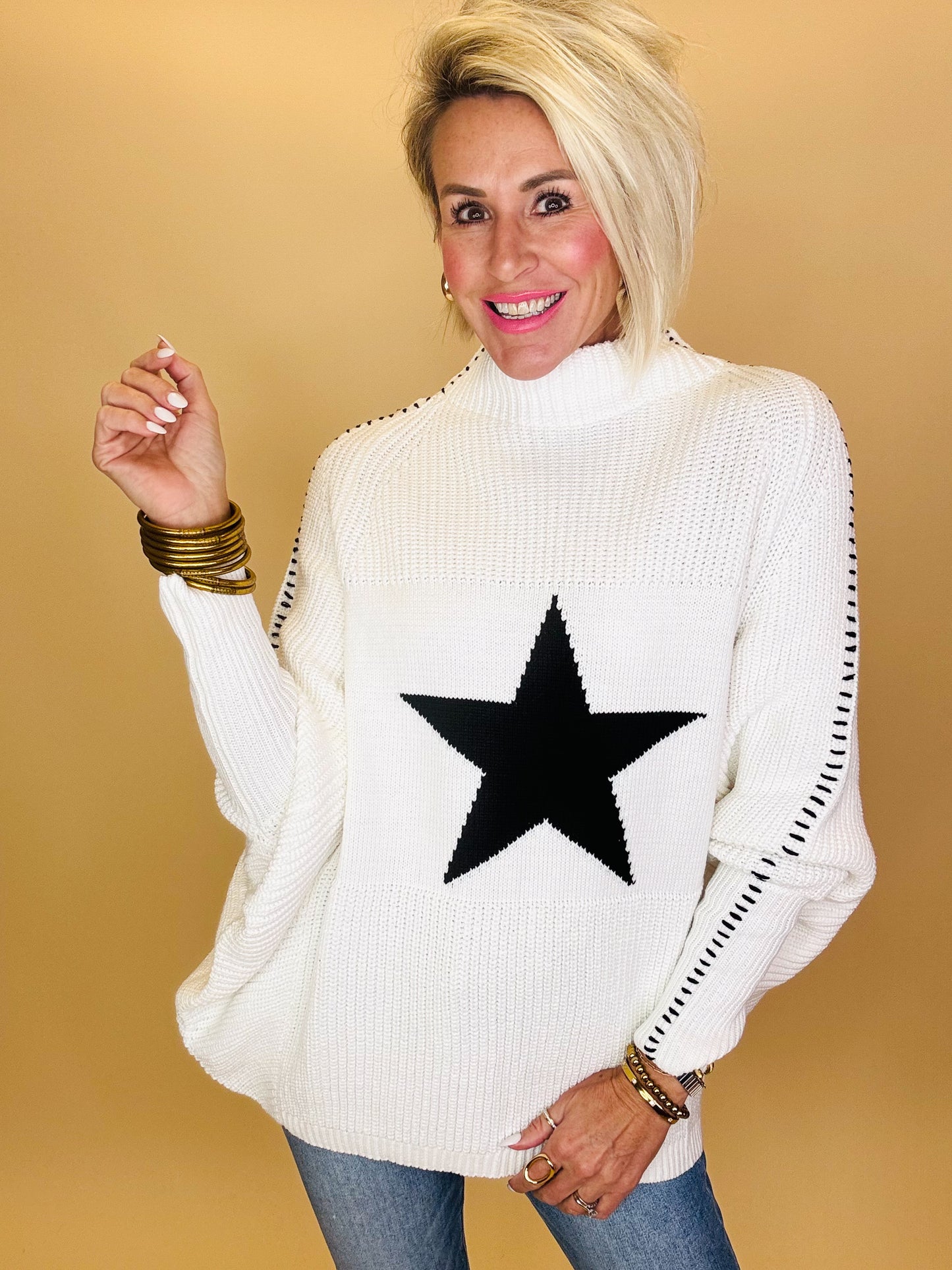 Make a statement without saying a word in the Starstruck Sweater. This cozy knit features a bold star across the front and playful contrast stitching along the shoulders and sleeves. With its relaxed fit and drop-shoulder design, it’s the perfect blend of laid-back comfort and standout style. Pair it with your favorite denim and boots for an effortlessly cool look that shines day or night.