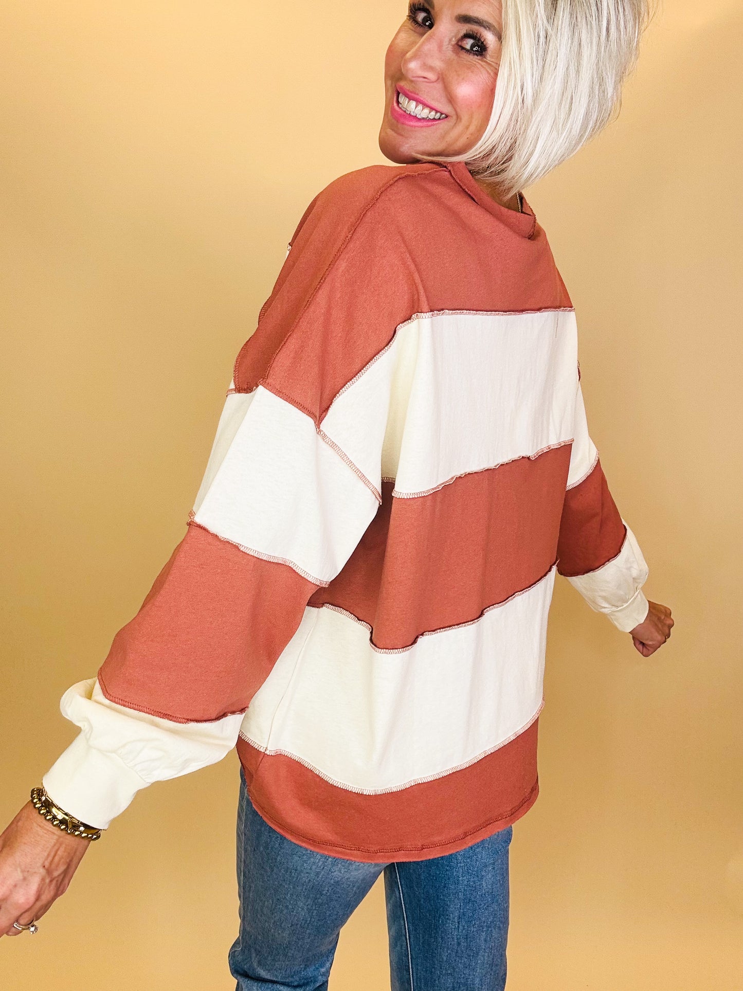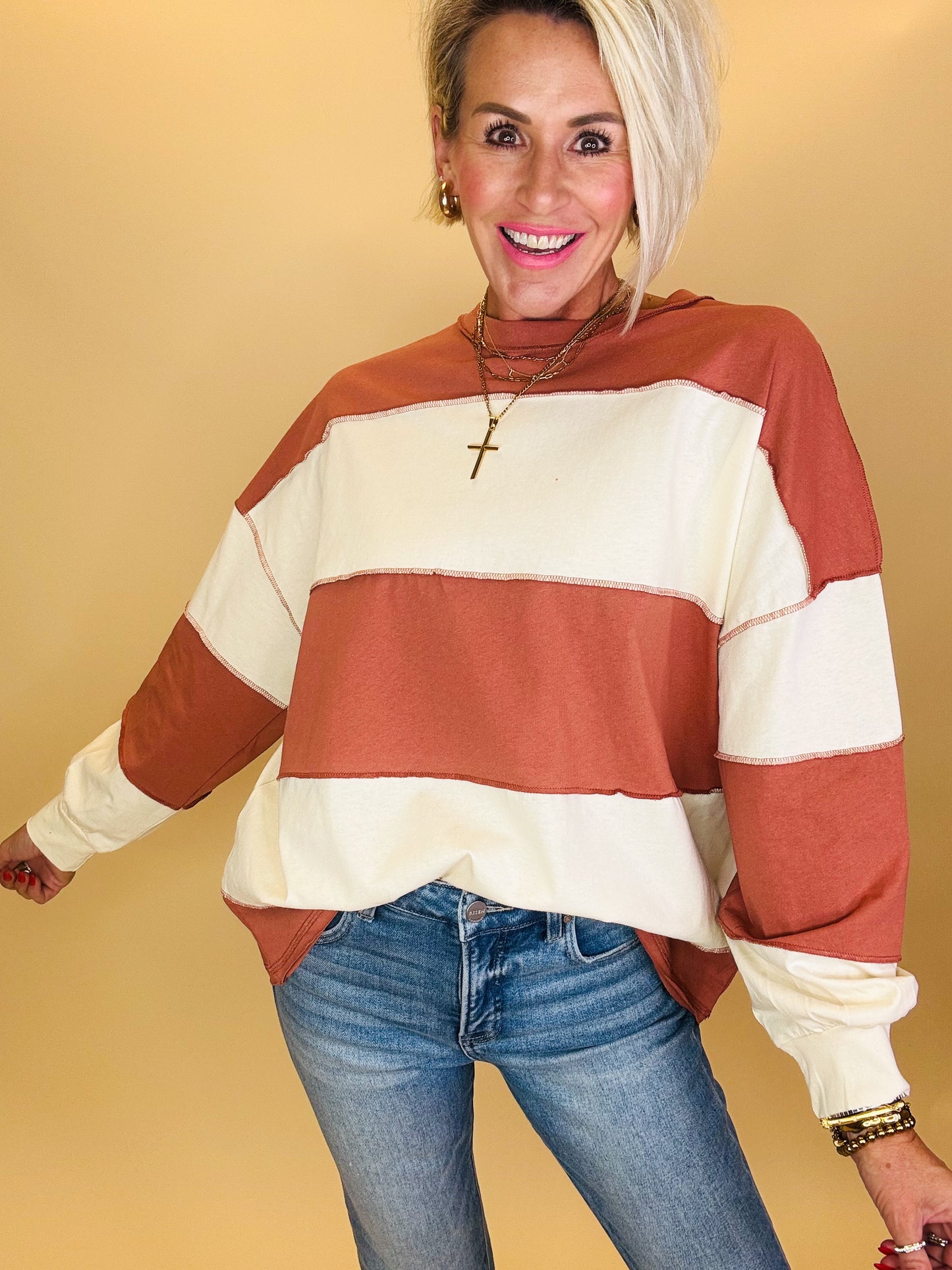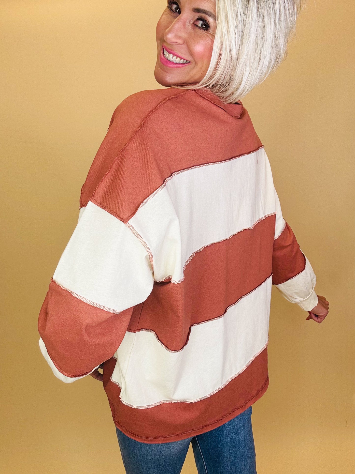 This oversized striped tee is the perfect blend of casual and trendy. Designed with wide horizontal stripes in warm terra cotta & navy creamy ivory, it gives off an effortless fall-inspired vibe. The relaxed, boxy fit with dropped shoulders and contrast stitching adds to its laid-back charm, making it an easy throw-on piece for everyday wear. Pair it with denim for a comfy yet stylish look that works all season long.