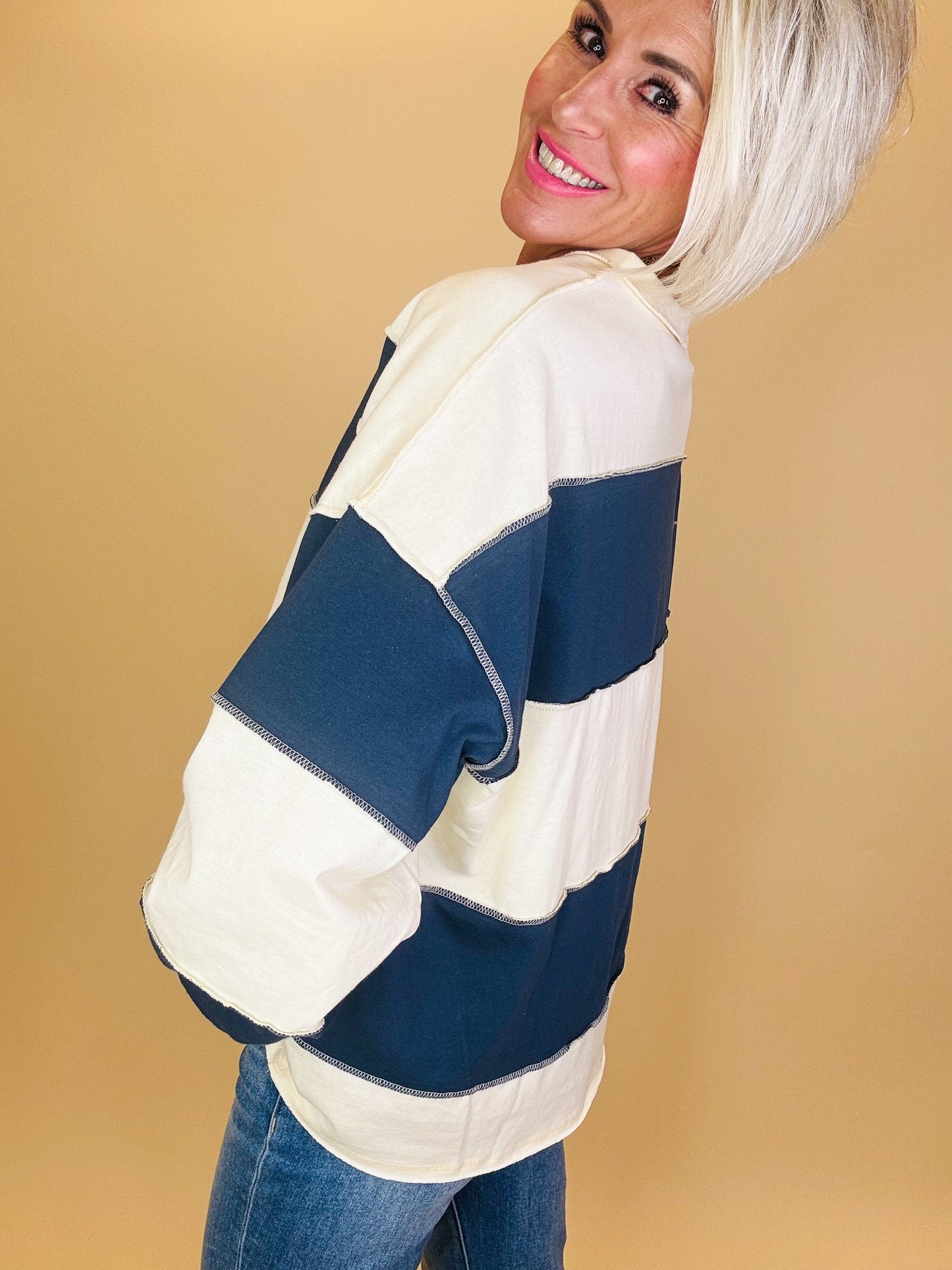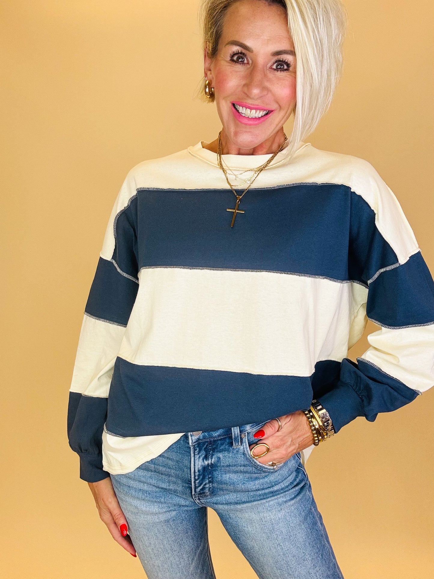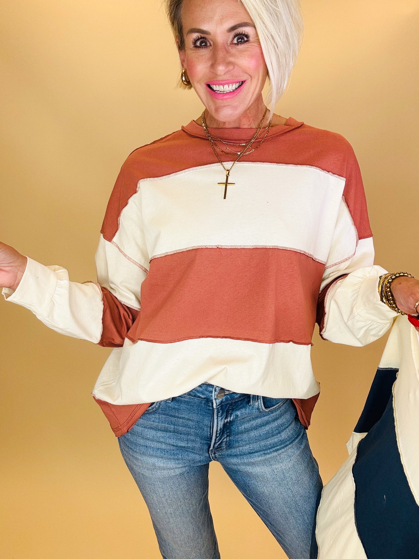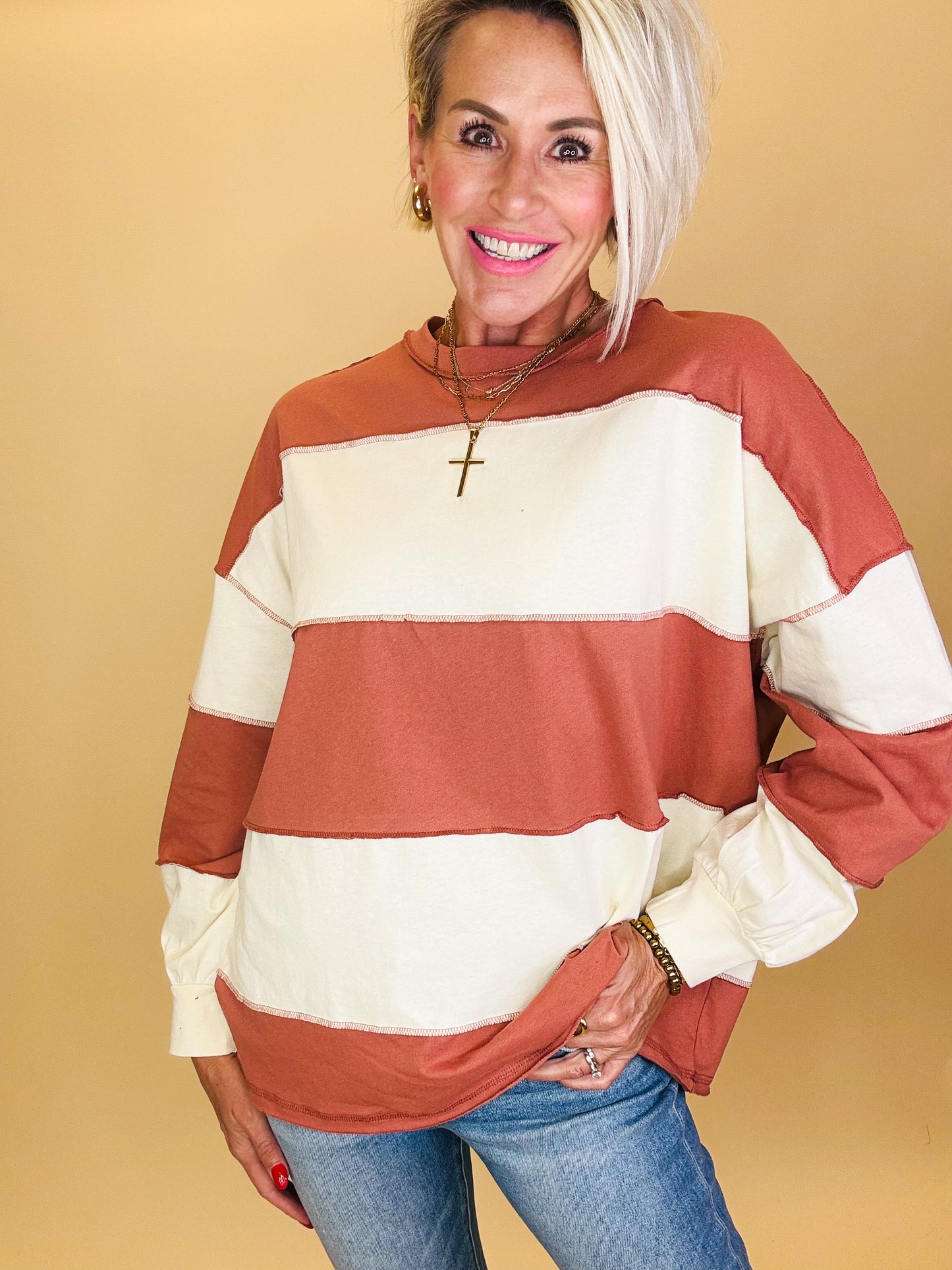 This oversized striped tee is the perfect blend of casual and trendy. Designed with wide horizontal stripes in warm terra cotta & navy creamy ivory, it gives off an effortless fall-inspired vibe. The relaxed, boxy fit with dropped shoulders and contrast stitching adds to its laid-back charm, making it an easy throw-on piece for everyday wear. Pair it with denim for a comfy yet stylish look that works all season long.