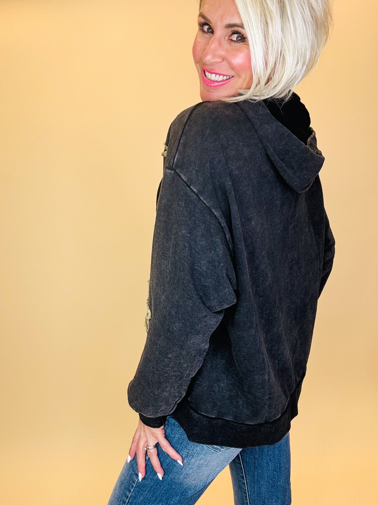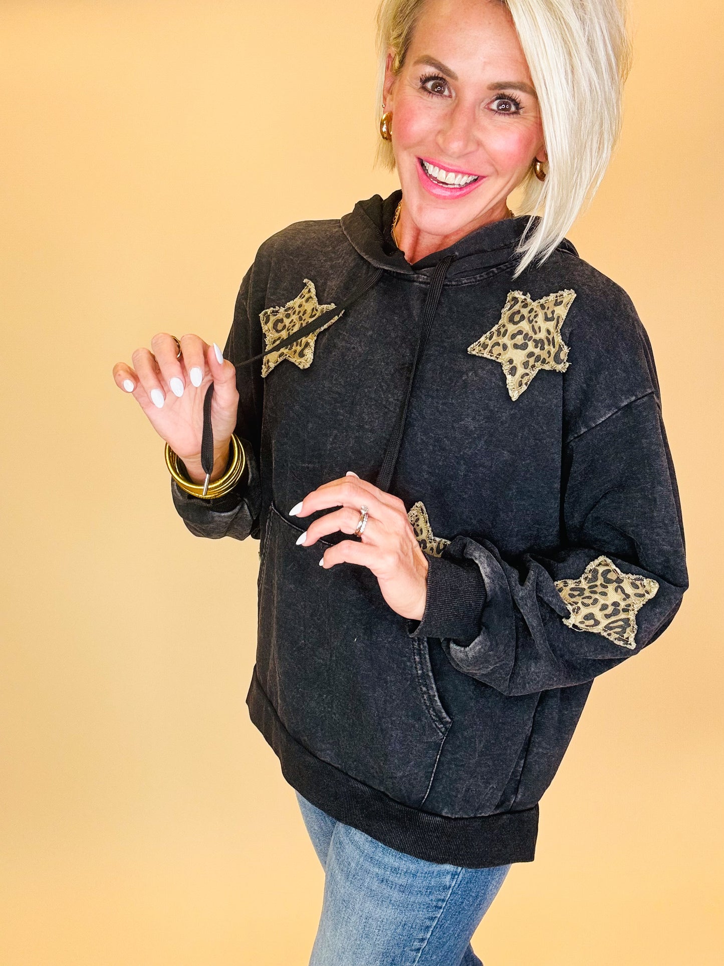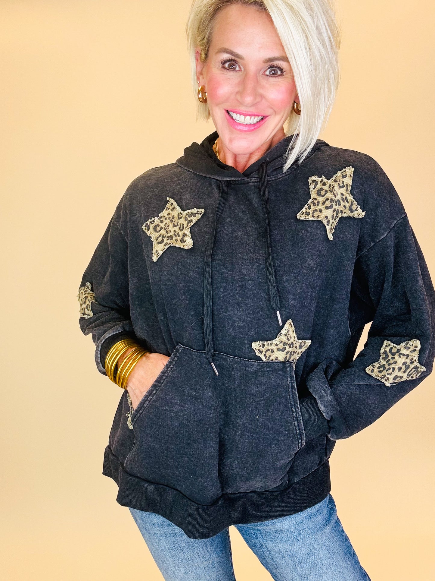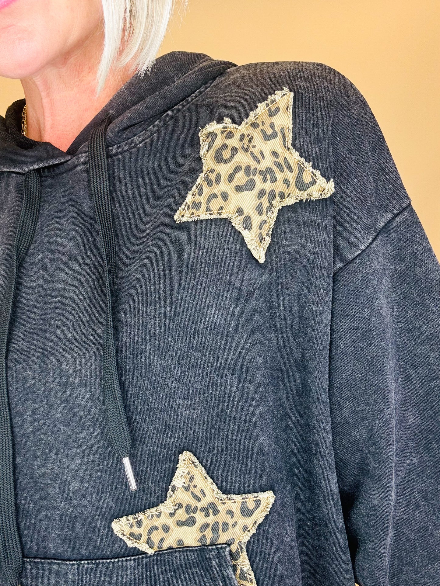 Cozy meets edgy in this charcoal-washed hoodie, finished with playful leopard-print star patches that pop with personality. The relaxed fit, front kangaroo pocket, and drawstring hood make it an everyday essential, while the animal-print accents bring just the right amount of wild flair.