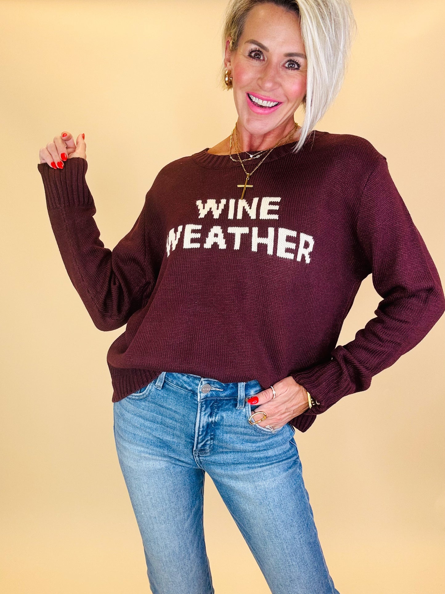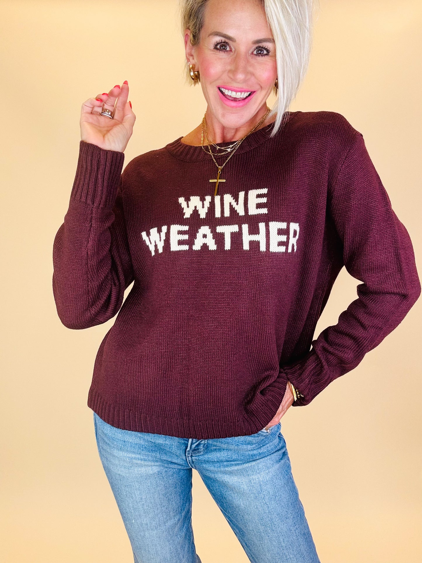 Cozy, chic and oh-so-perfect for the season—this Wine Weather Sweater is made for crisp evenings and full glasses. With its rich burgundy knit and bold ivory lettering, it’s the ultimate fall and winter go-to for vineyard tours, girls’ nights in, or casual weekends by the fire