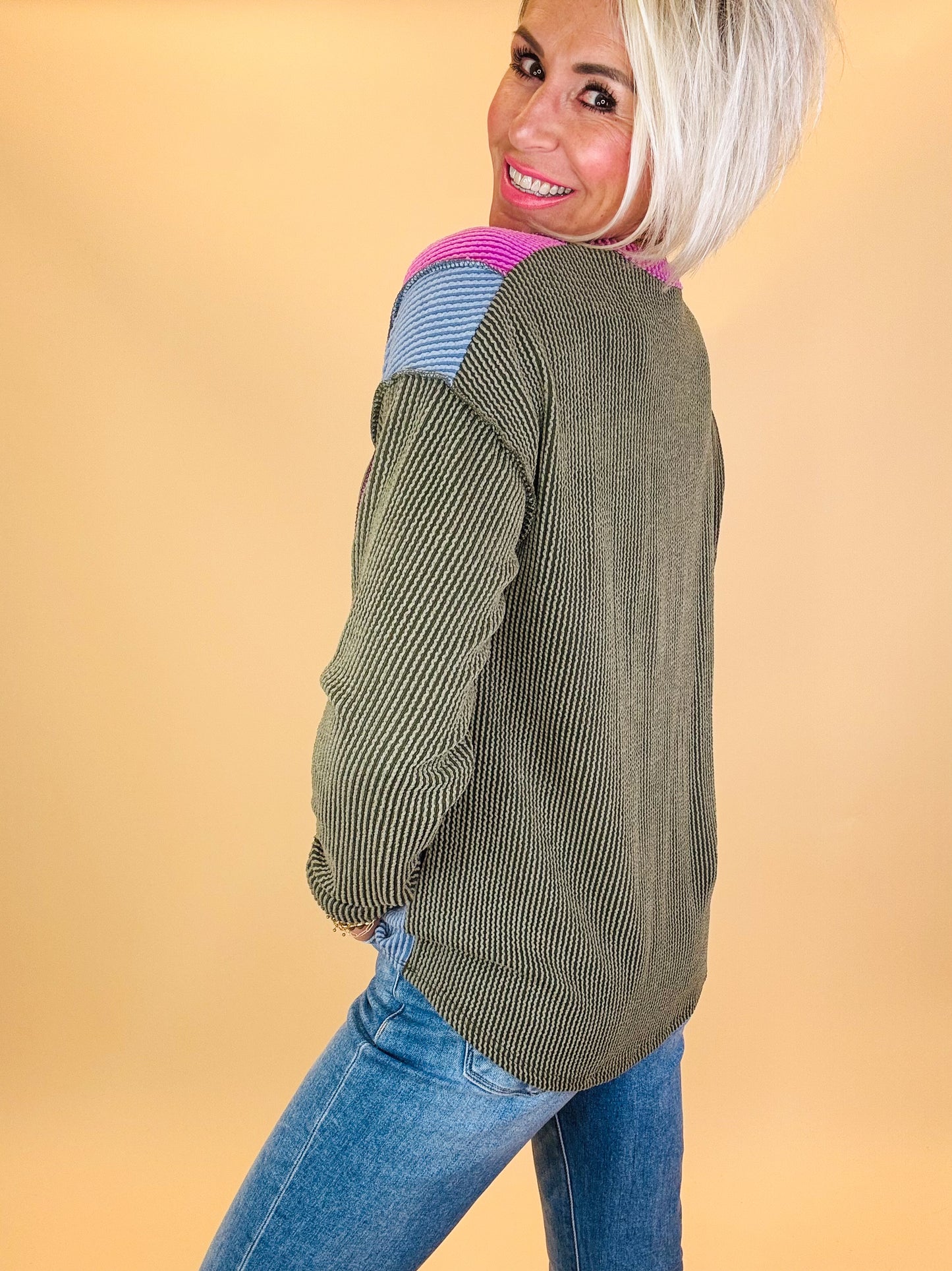 The Fall Trails Henley brings a laid-back, boho vibe with a bold twist. Made with textured woven fabric, it features earthy olive stripes contrasted by vibrant violet panels for a look that’s both grounded and eye-catching. The button-front henley neckline and relaxed fit make it easy to style for cozy weekends, music festivals, or casual nights out. Unique, comfortable, and effortlessly cool—this top is your go-to for adding personality to everyday wear.