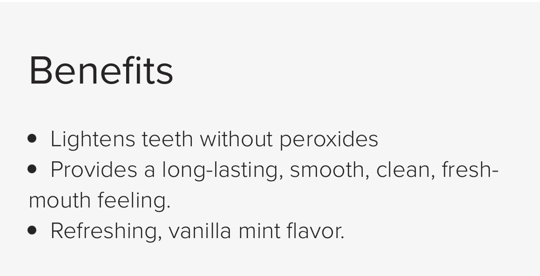 WHITENS TEETH WITHOUT PEROXIDE WHILE PREVENTING PLAQUE FORMATION! GENTLE VANILLA MINT FLAVOR FRESHENS BREATH AND PROVIDES A CLEAN, JUST BRUSHED FEELING ALL DAY!