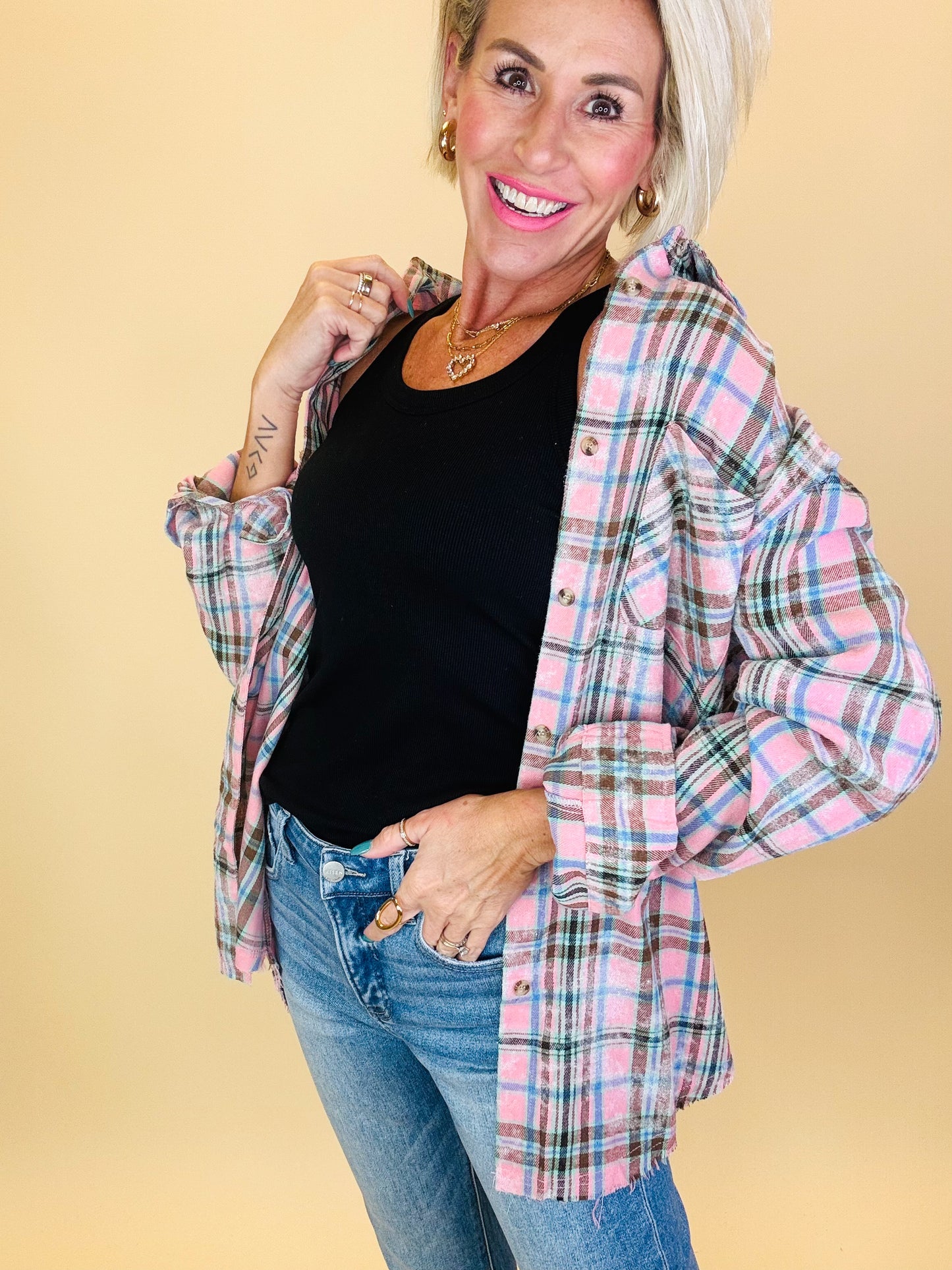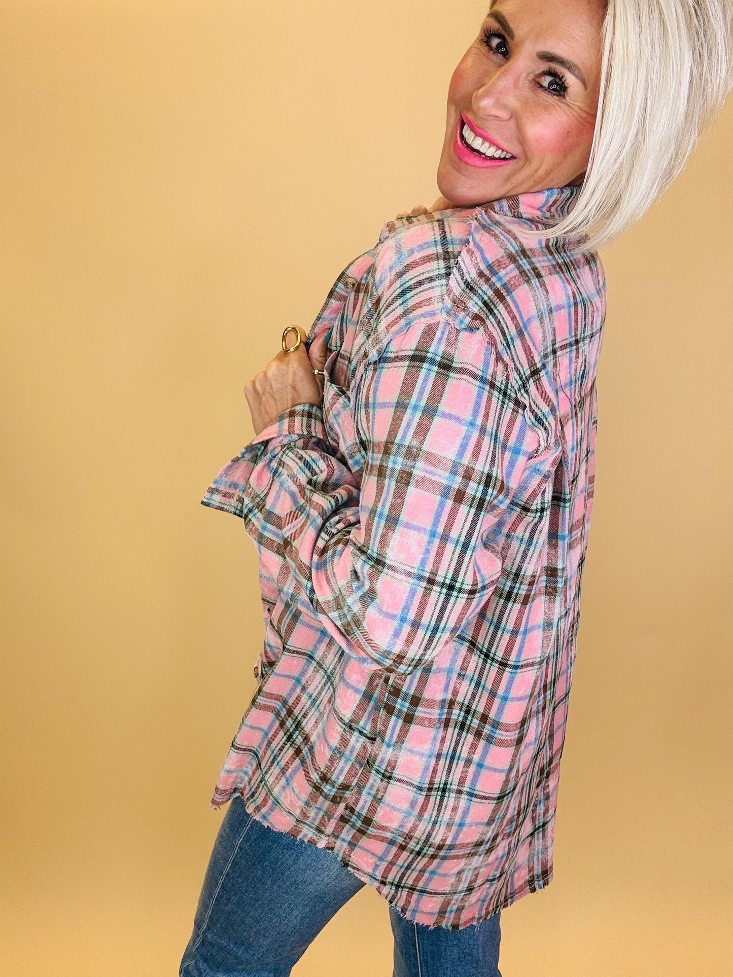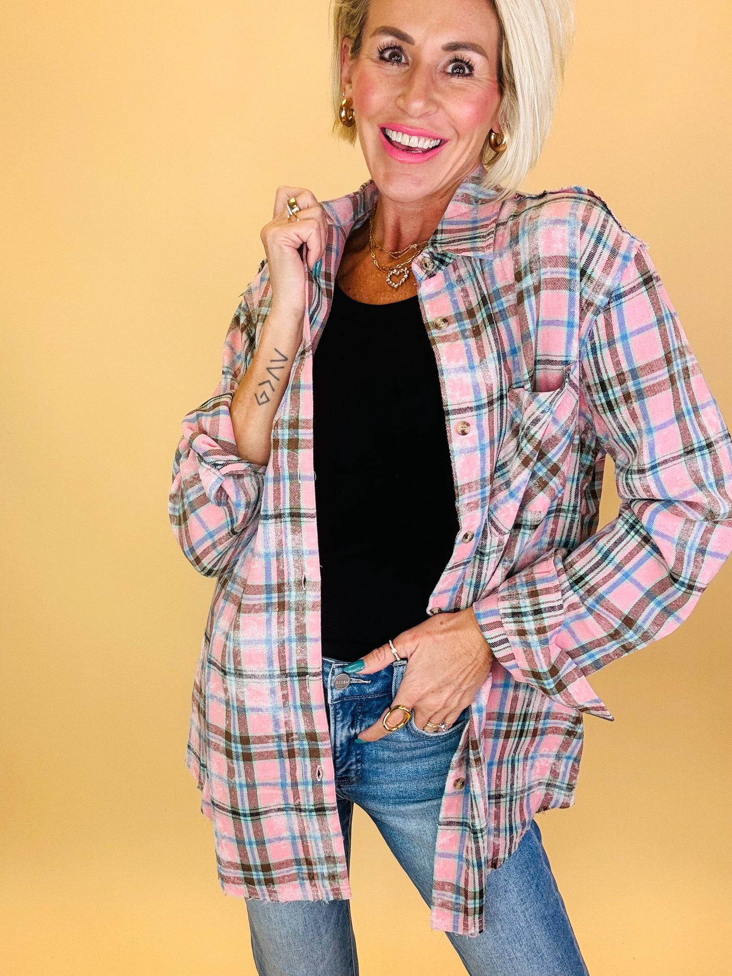 This pink and brown distressed plaid button-up gives off the perfect blend of cozy charm and vintage edge. Featuring a relaxed fit, raw hemline, and soft brushed fabric, it’s made for layering over your favorite graphic tee or pairing with leggings and boots for that effortless, lived-in look. The mix of pink, brown, and teal tones adds a feminine twist to a classic flannel, making it ideal for fall days, pumpkin patch outings, or casual weekends with friends.