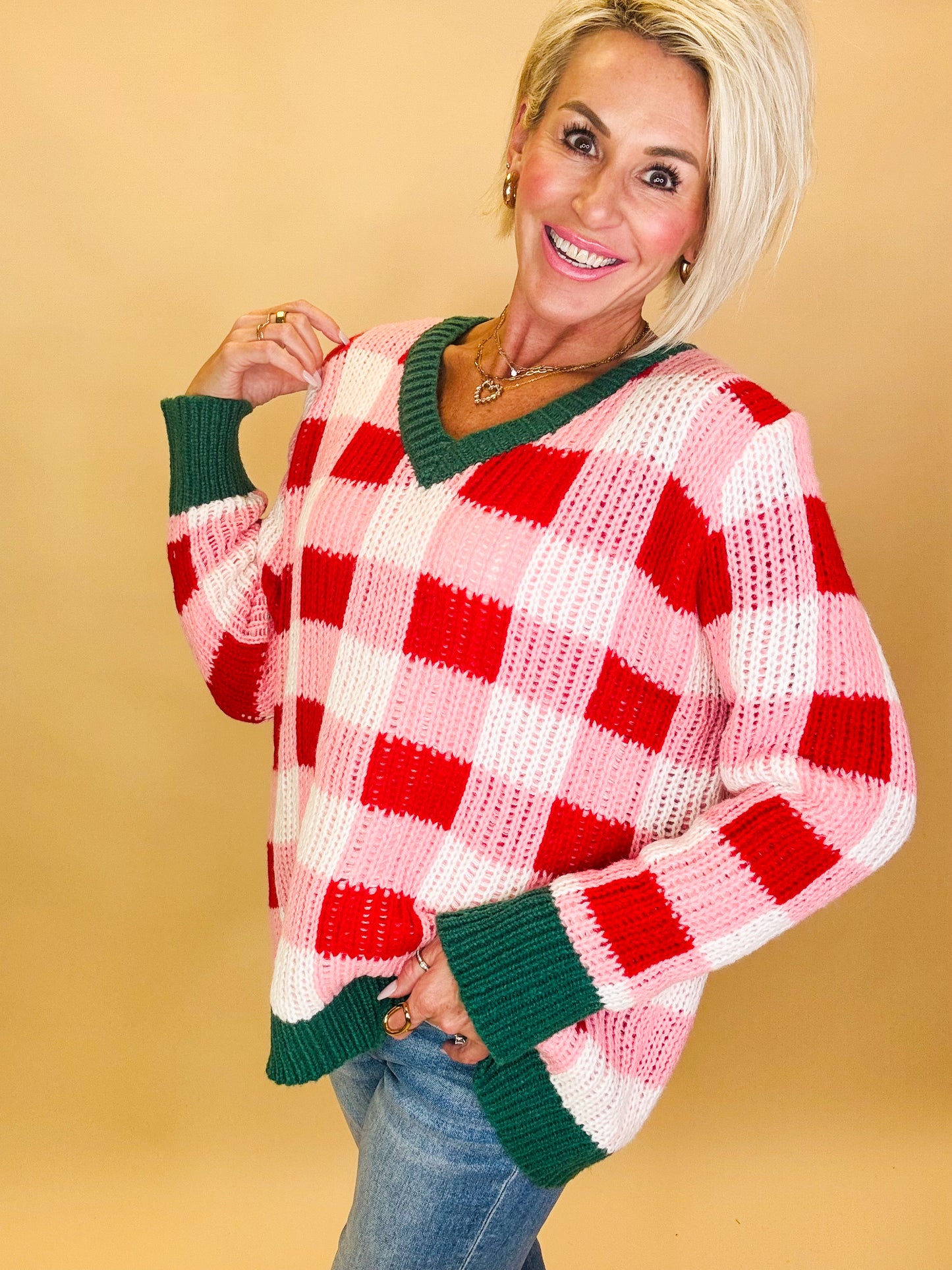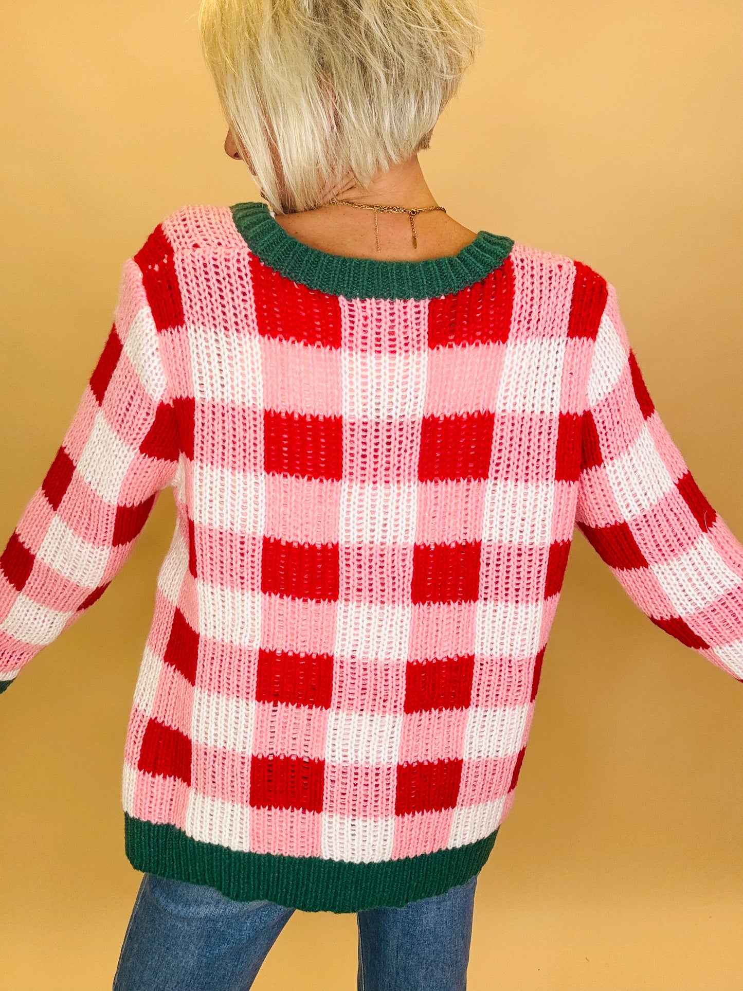 Sweet, festive, and totally eye-catching — this open-weave checkered sweater is the perfect pop of color for the season. The bold red and pink gingham pattern gives it a fun, playful vibe, while the deep green trim adds that subtle holiday touch without being over the top. Lightweight with a relaxed drape, it’s ideal for layering over tanks or bralettes for an effortless, cozy-cute look.
