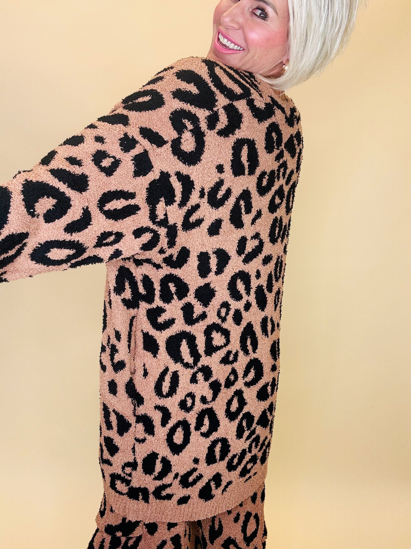 Instant cozy glam. This ultra-soft leopard lounge cardigan wraps you in plush comfort while keeping your off-duty style fierce and fabulous. The textured knit feels like a warm hug, while the bold black-on-caramel leopard pattern brings that timeless, playful attitude we all love.