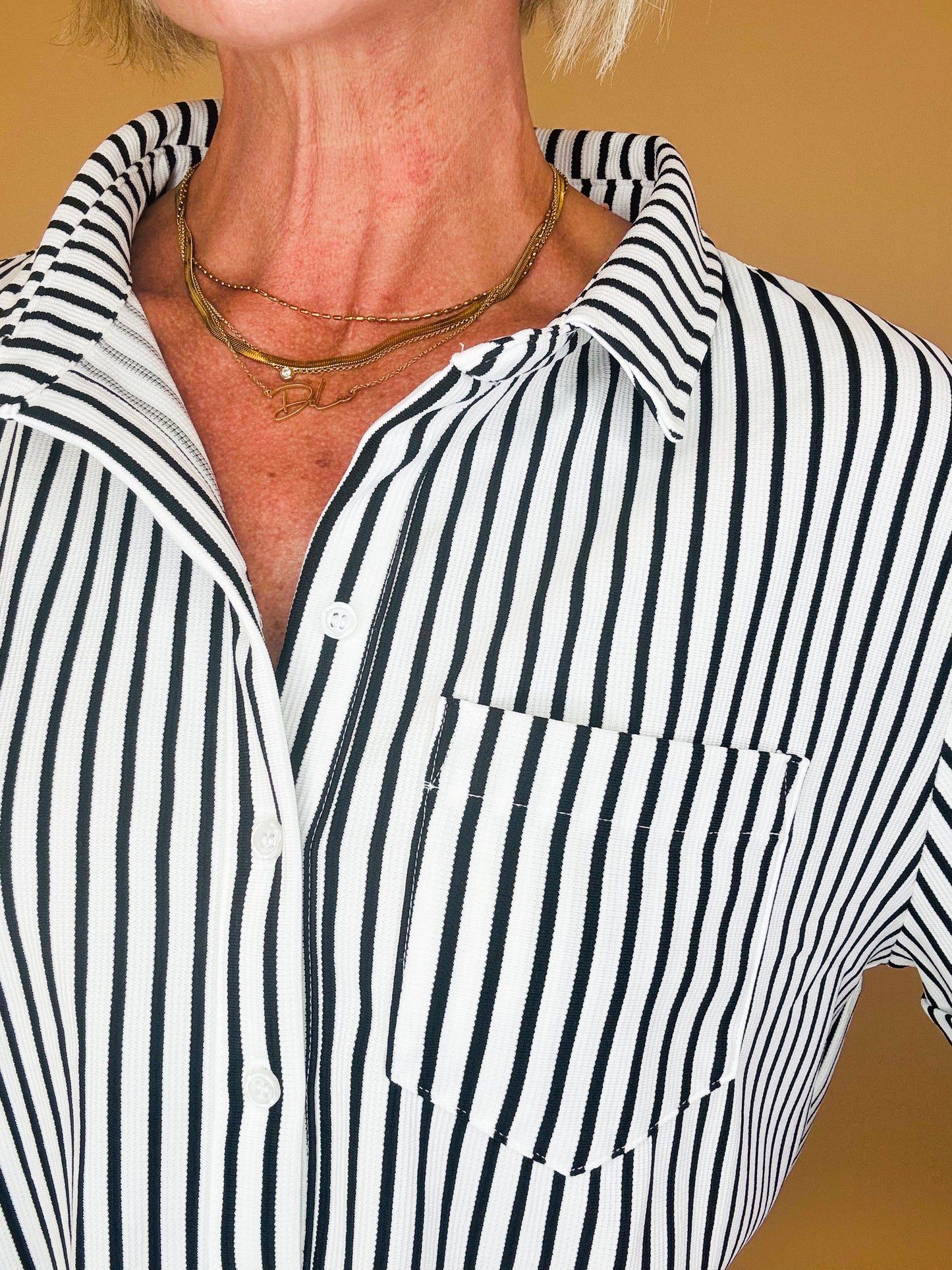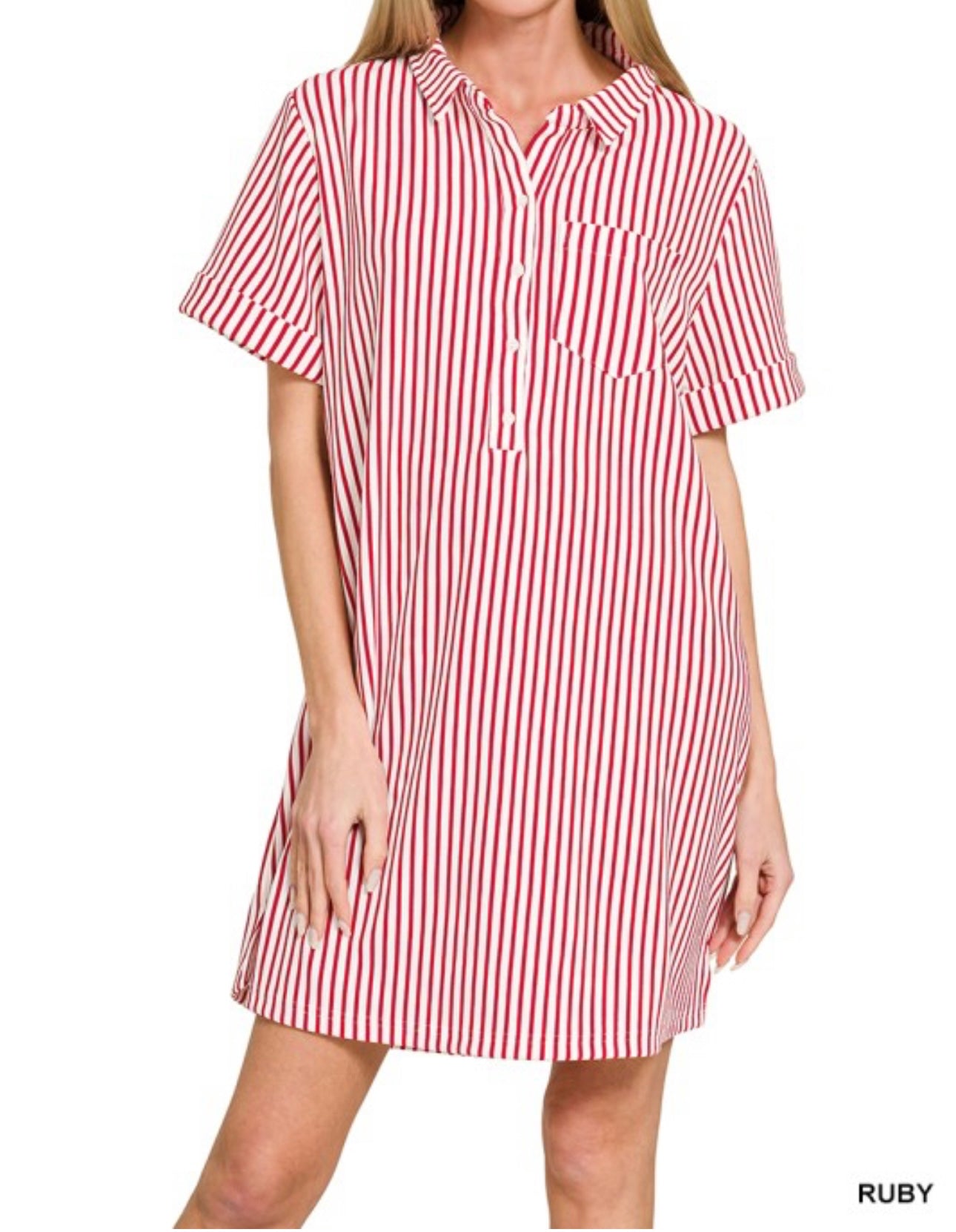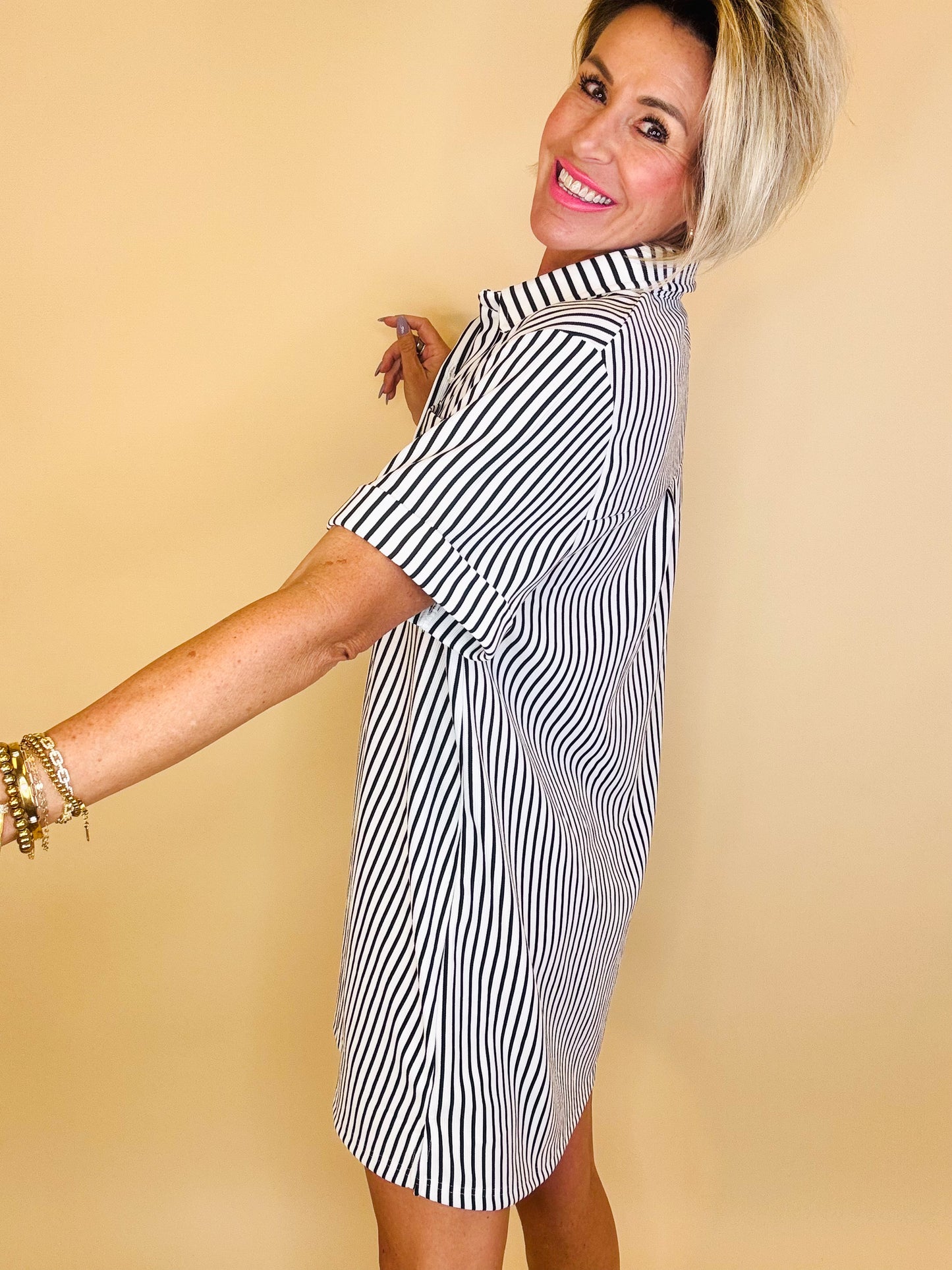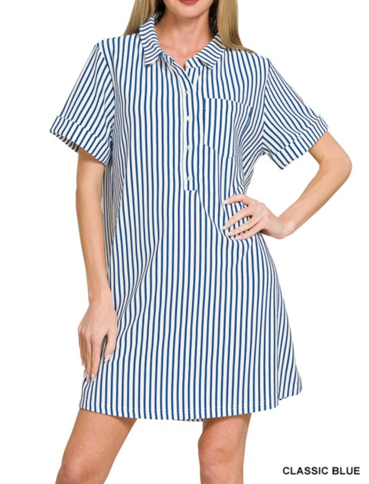 Easy, breezy, and effortlessly polished 🌊 The Coastal Cabana Stripe Dress is your throw-on-and-go favorite with a classic twist. Featuring timeless vertical stripes, a relaxed shift silhouette, and a chic collared neckline with button detail, this dress is perfect for everything from beach days to brunch dates. The lightweight fabric keeps it cool and comfortable, while the flattering fit gives you that laid-back, put-together look every time. Style it with sneakers, sandals, or wedges—this one does it all.