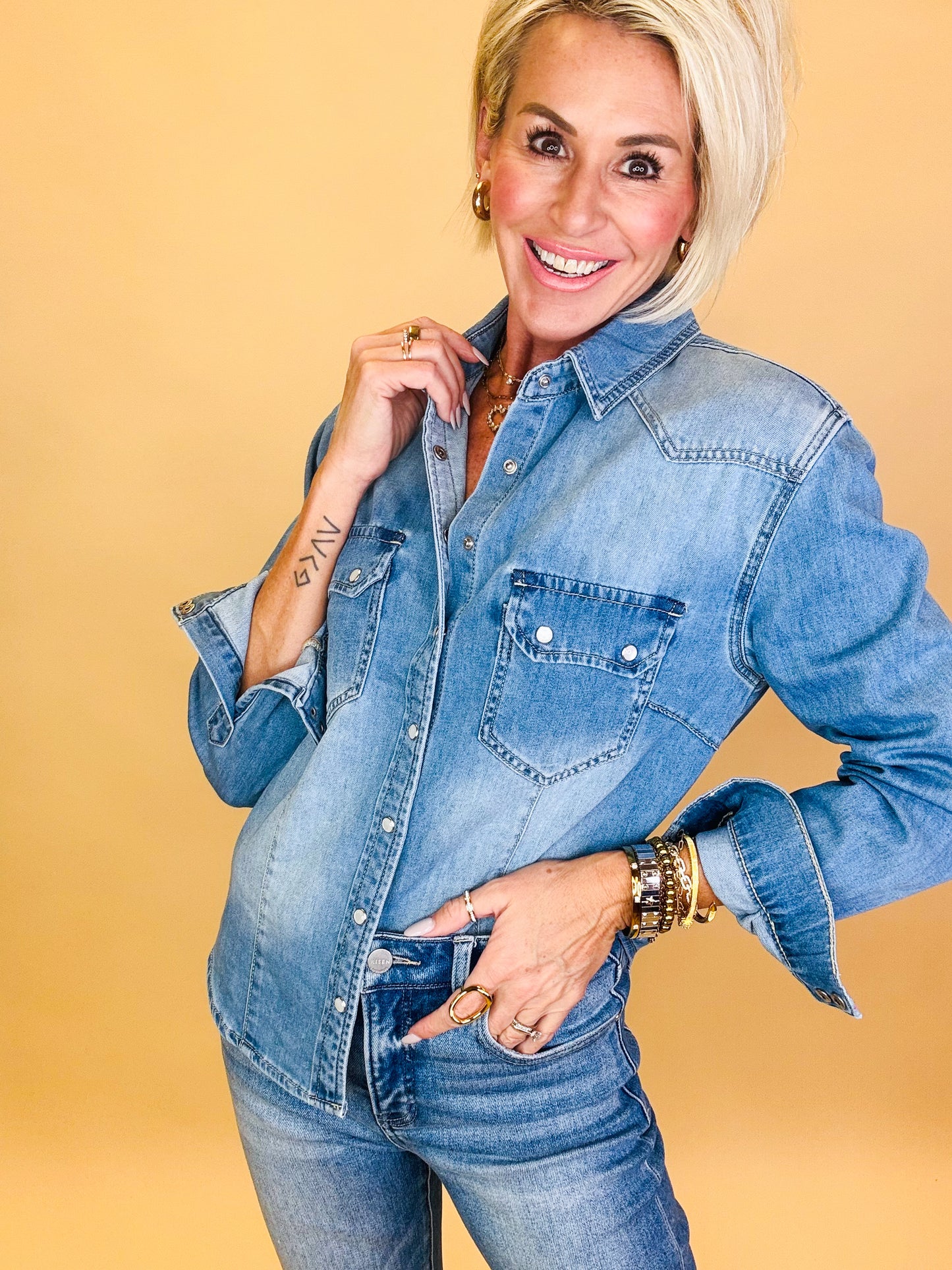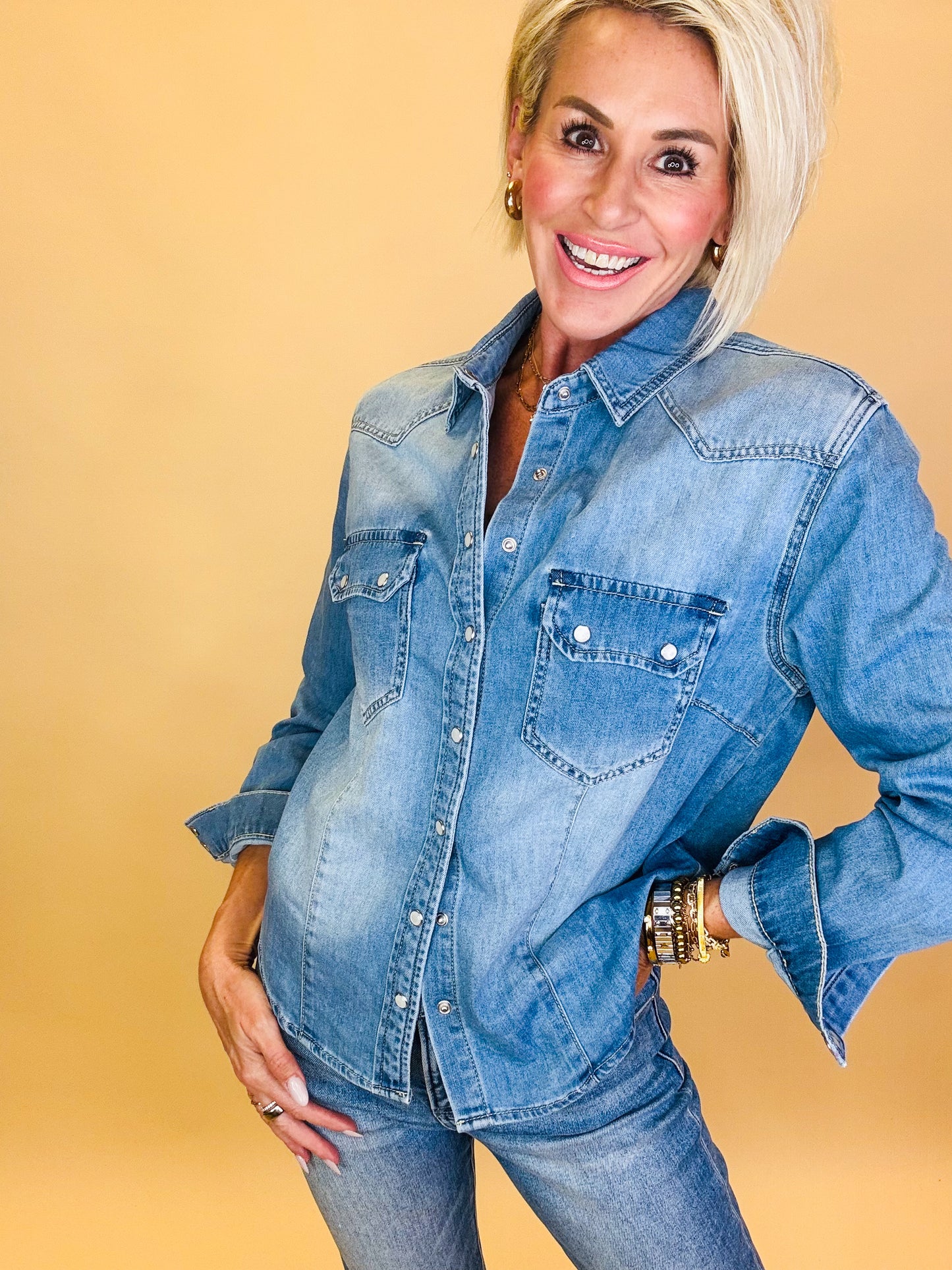 Meet your new statement layer: a soft, vintage-washed denim button-up . This lightweight shirt features snap buttons, double chest pockets, and that perfectly broken-in look that makes it feel like an instant favorite.