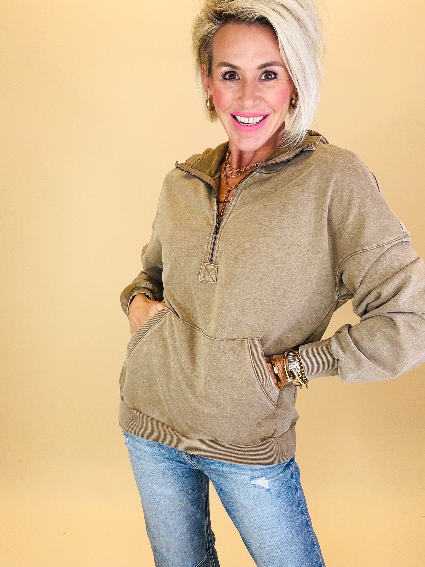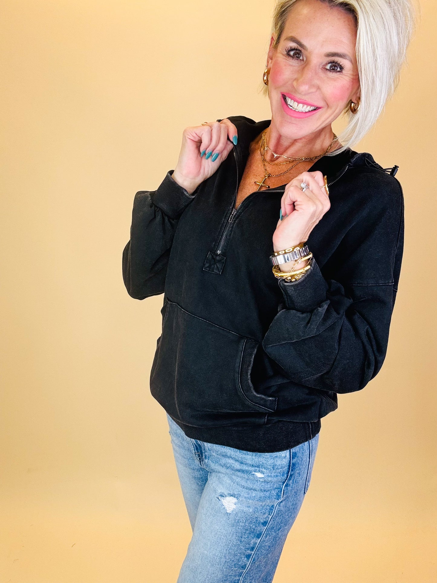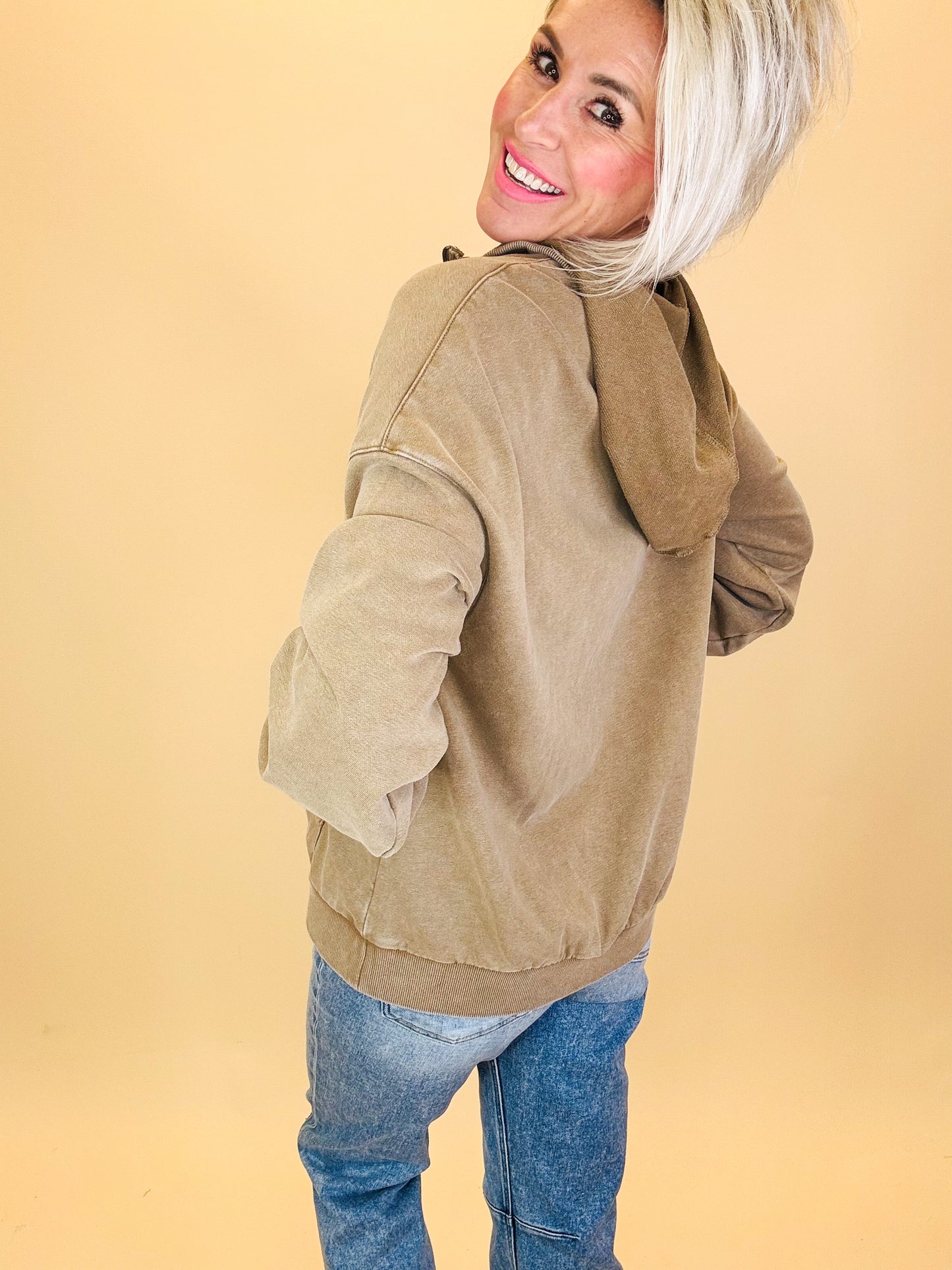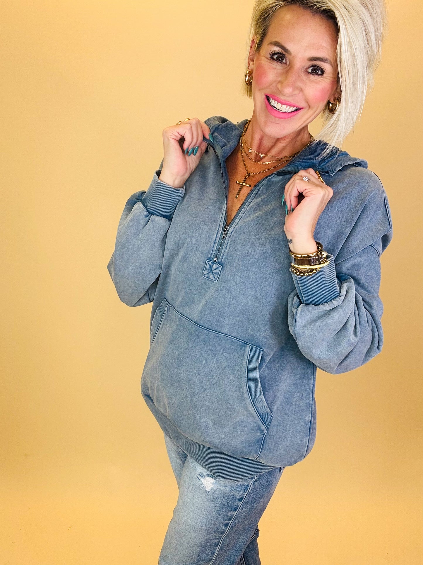 Your new winter staple is here — meet the Feeling Frosty Zipper Hoodie! This cozy pullover blends relaxed comfort with a vintage-inspired washed finish that gives it that perfectly lived-in look. The half-zip neckline, roomy front pocket, and balloon-style sleeves make it effortlessly stylish while keeping you warm on those crisp winter days.