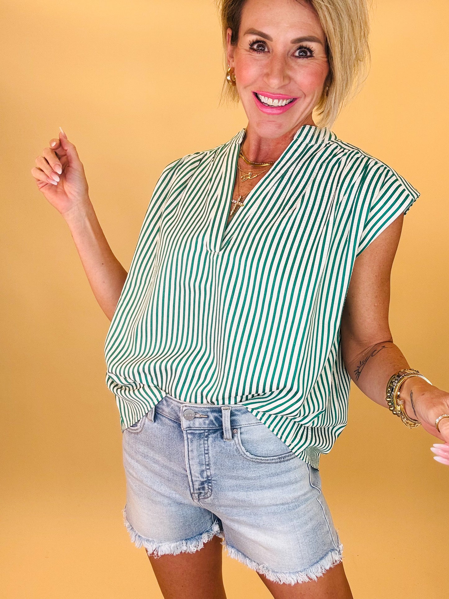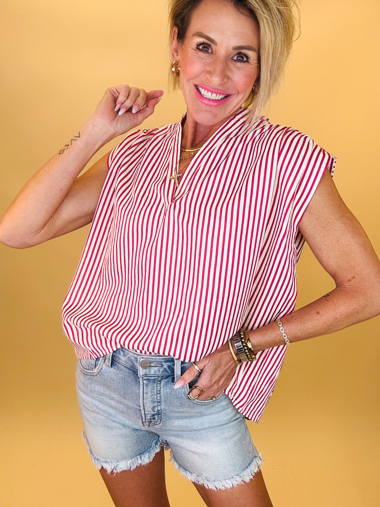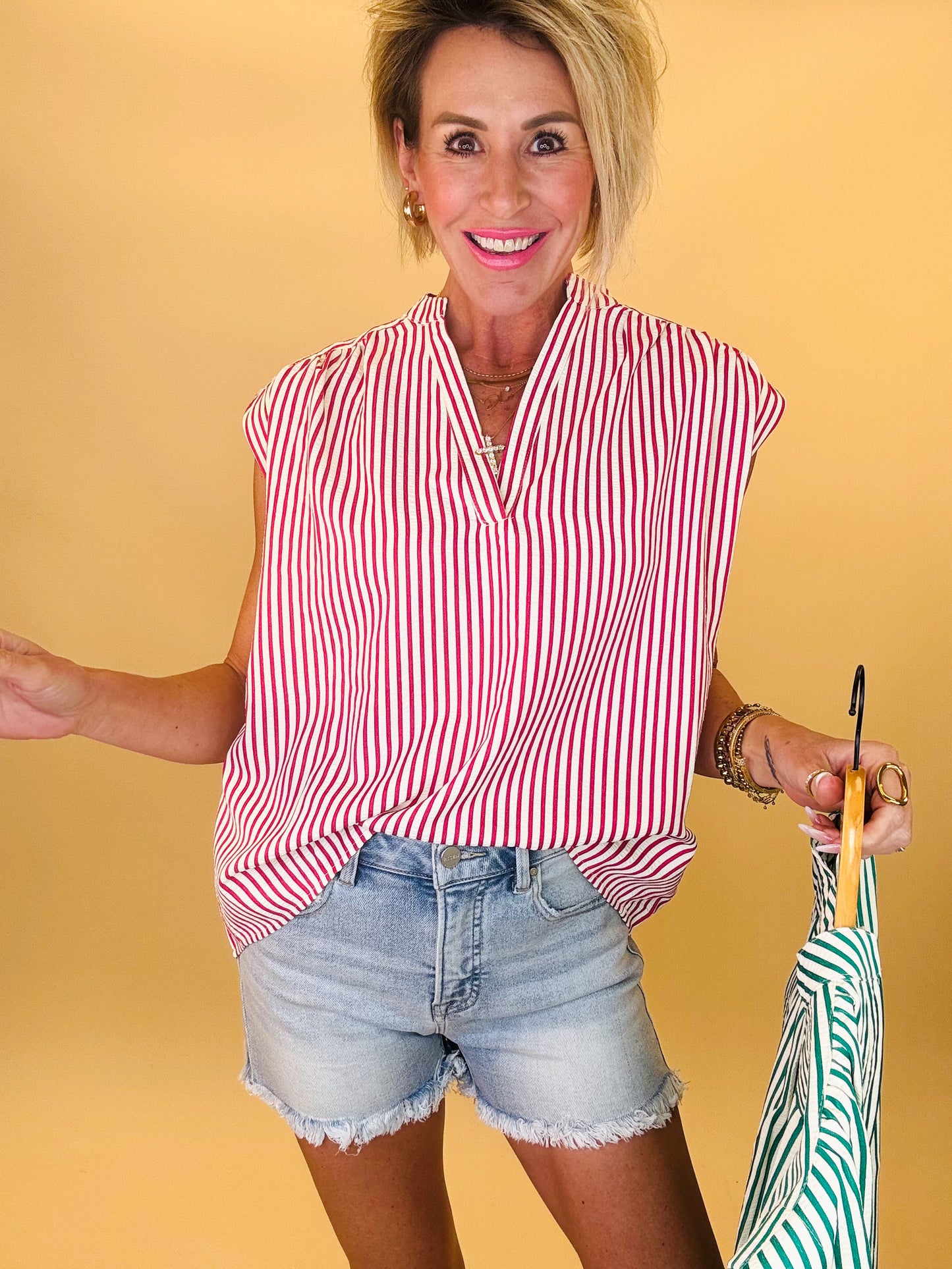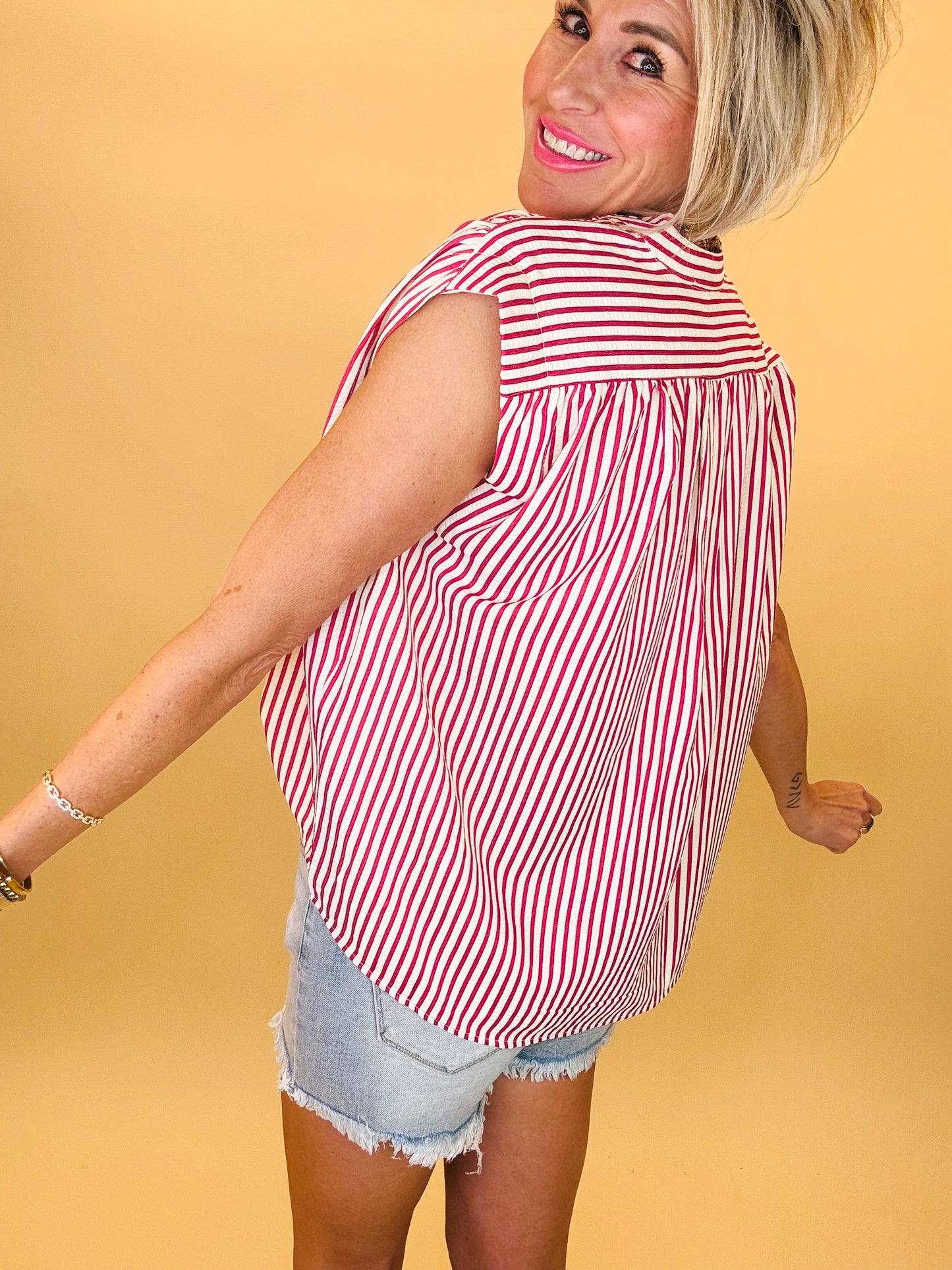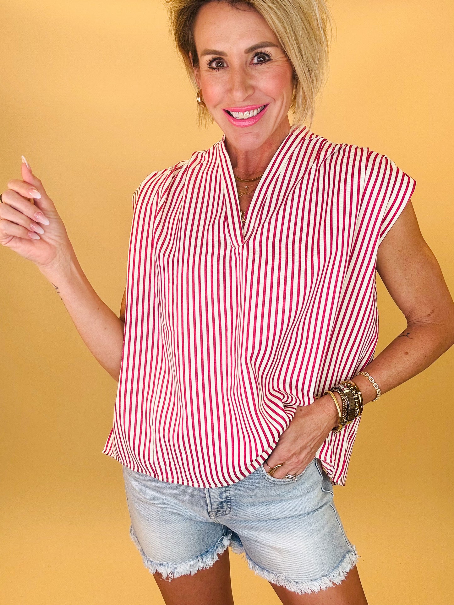 Breezy, effortless, and perfect for sunny days — the Fresh Start Stripe Top is your new warm-weather favorite. Designed with a relaxed flowy fit, flattering split neckline, and soft cap sleeves, this lightweight striped blouse brings the perfect blend of comfort and style. The vertical stripes elongate the silhouette while the airy fabric keeps you cool from brunch dates to weekend adventures. Pair it with denim shorts or white jeans for an easy, polished summer look.
